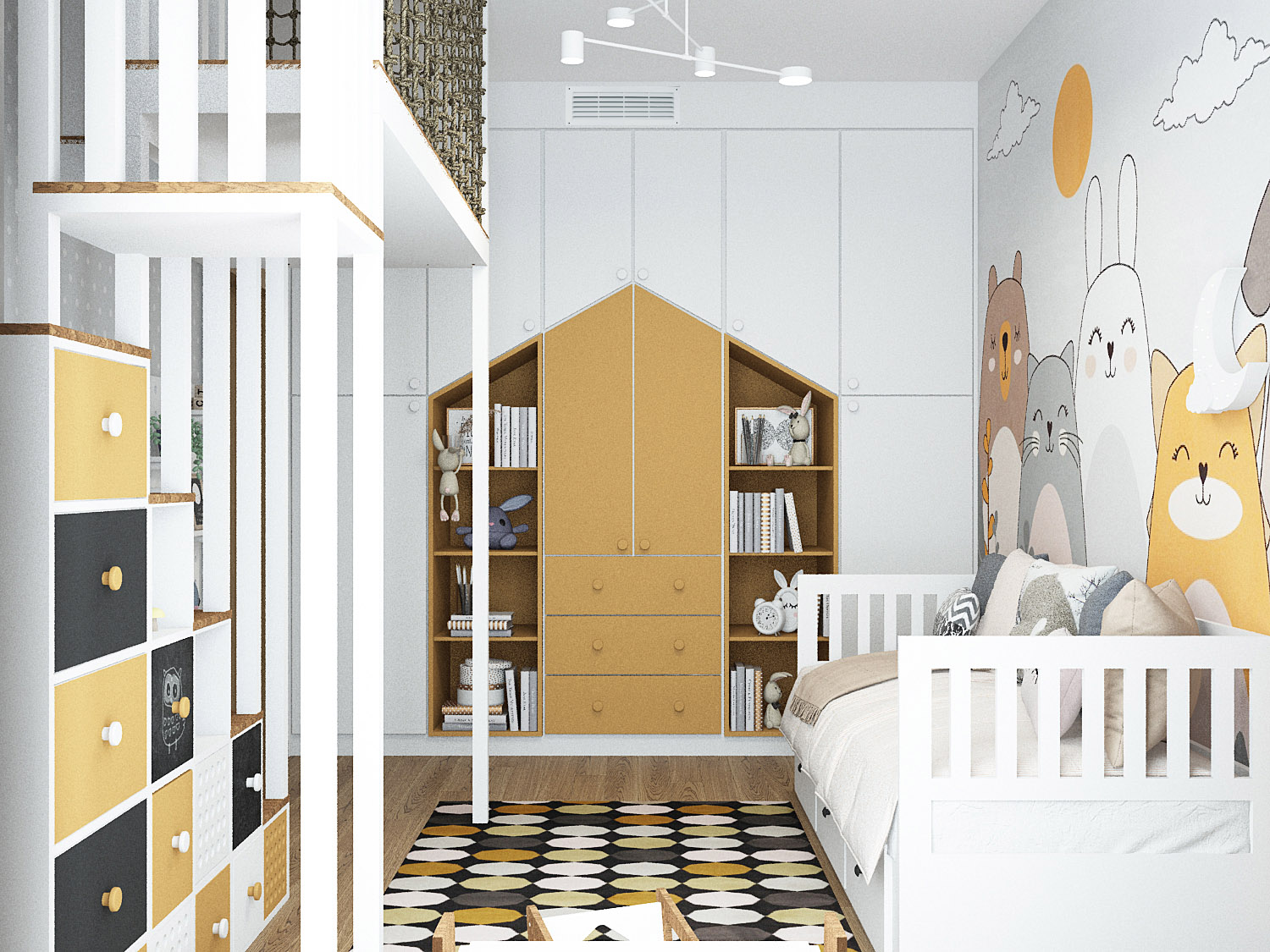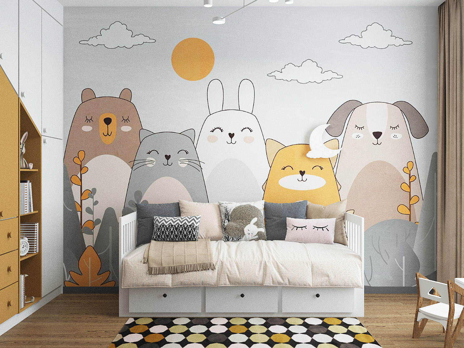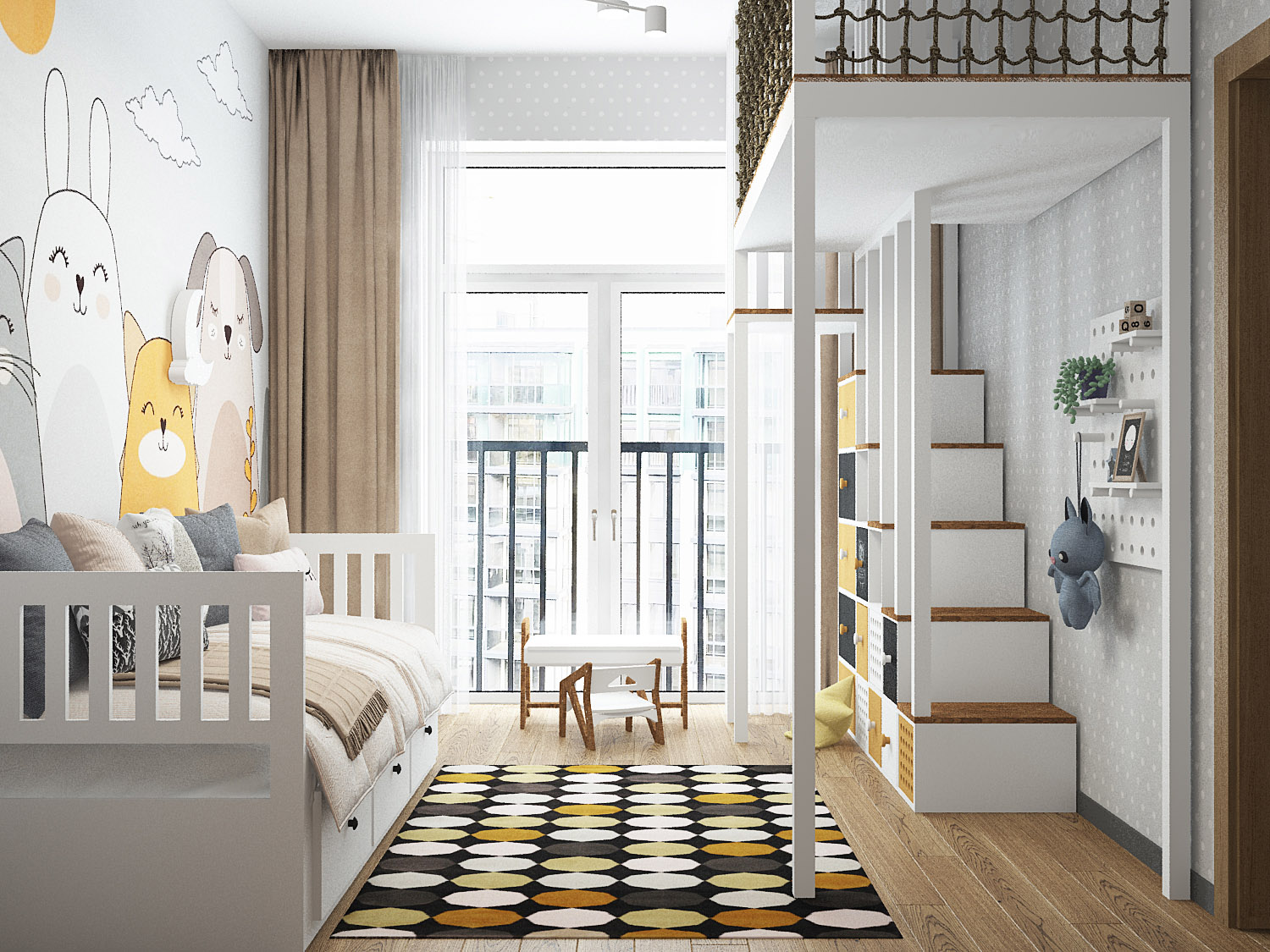 Детская комната «на вырост» площадью 14 м². Задача была сделать комнату с запасом по времени, чтобы и через 5 лет она еще не вышла из возраста. Сейчас девочке 1,5 года. Комната небольшая, и хотелось сделать очень красивую и не очень стандартную стену. Выбрали обои из коллекции «Big Little» и ни разу не пожалели. От этих зверят настроение у всех сразу повышается. Комната стала очень особенной и очень милой.