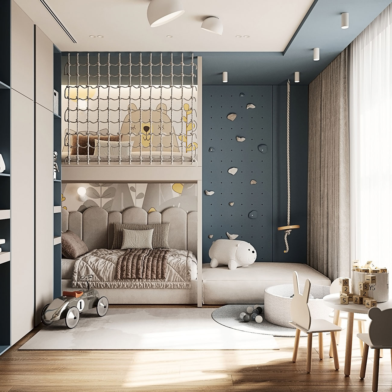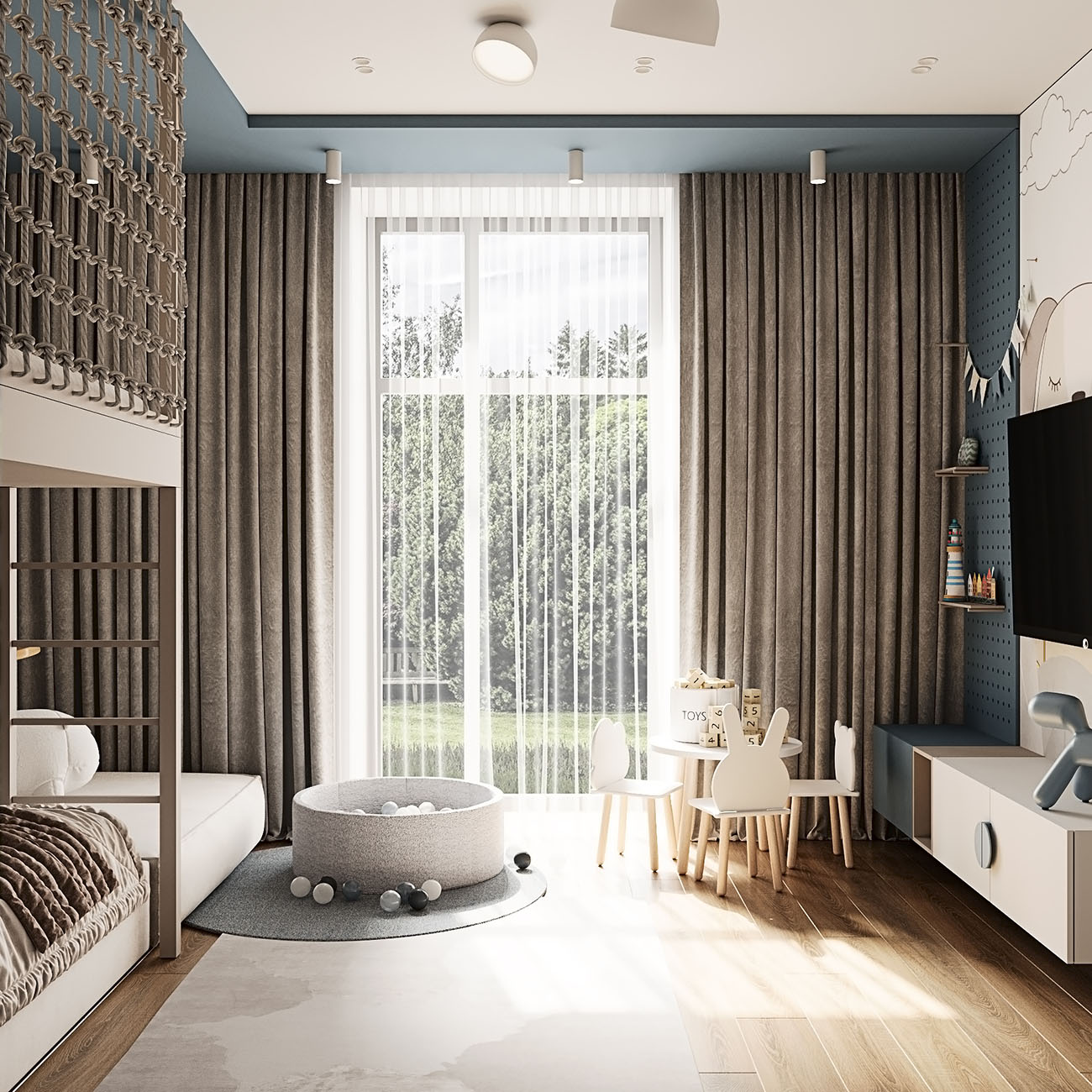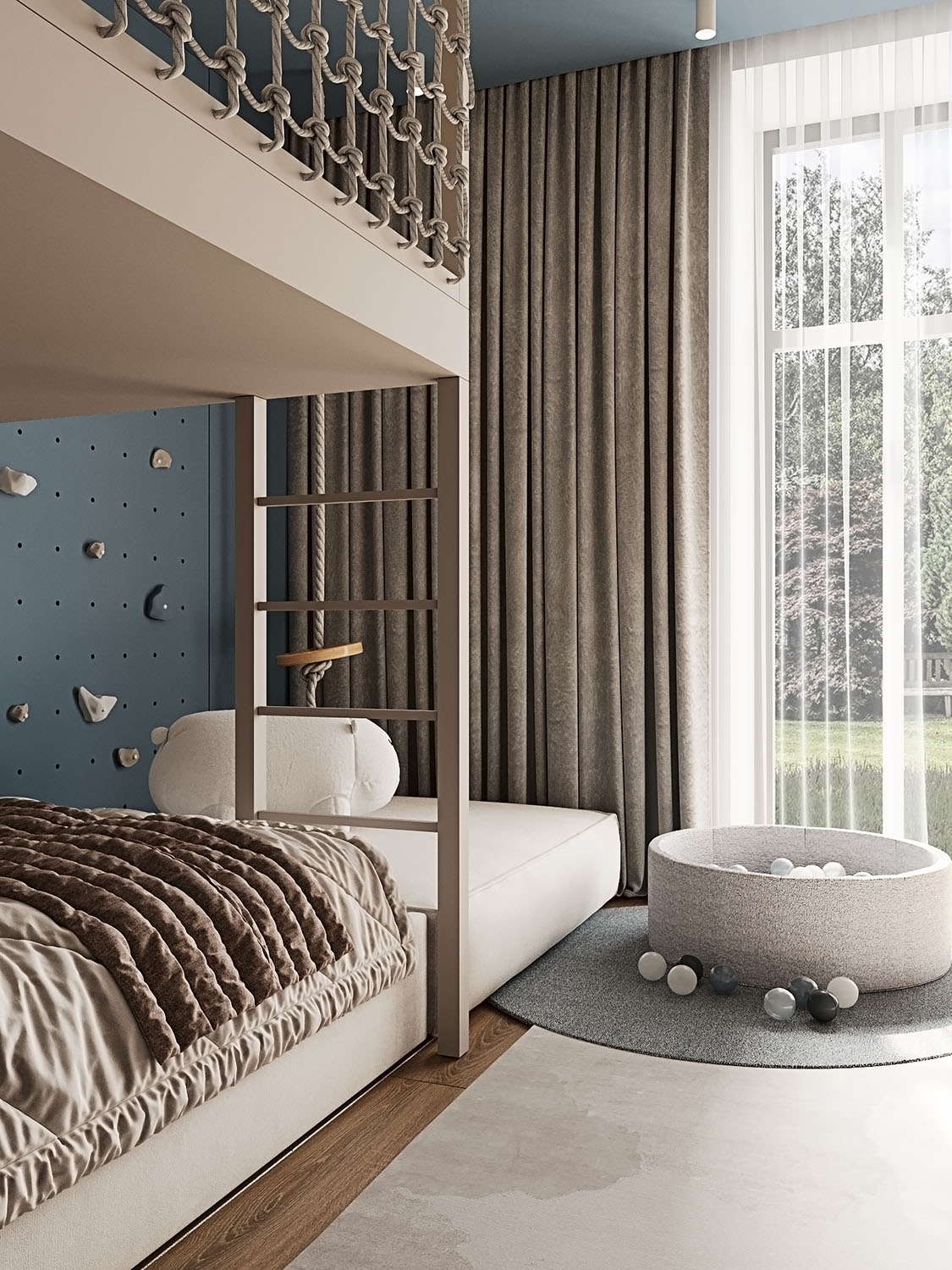 Площадь комнаты — 16,5 м². Заказчики хотели, чтобы детская была с большой игровой зоной над кроватью и рядом. Также задачей было спроектировать уголок для скалолазания. Изначально это — комната для малыша, но в будущем она трансформируется под школьника и его потребности, что можно увидеть на кадрах. Обои BIG LITTLE замечательно вписались в концепцию!