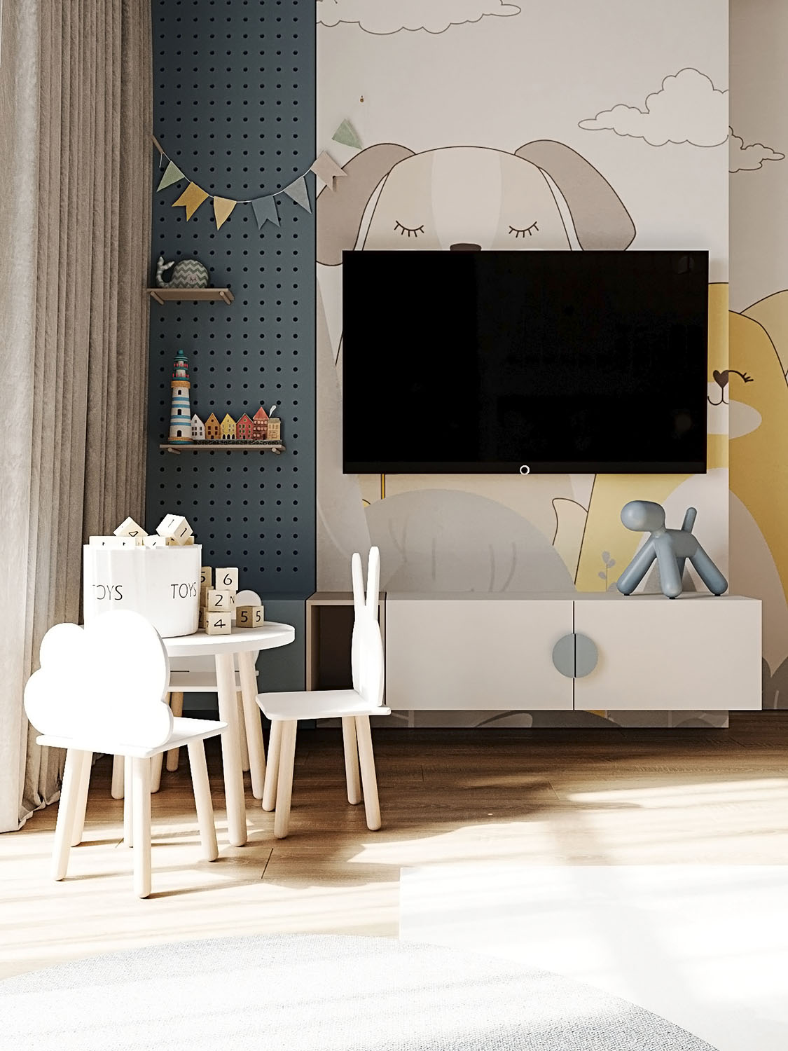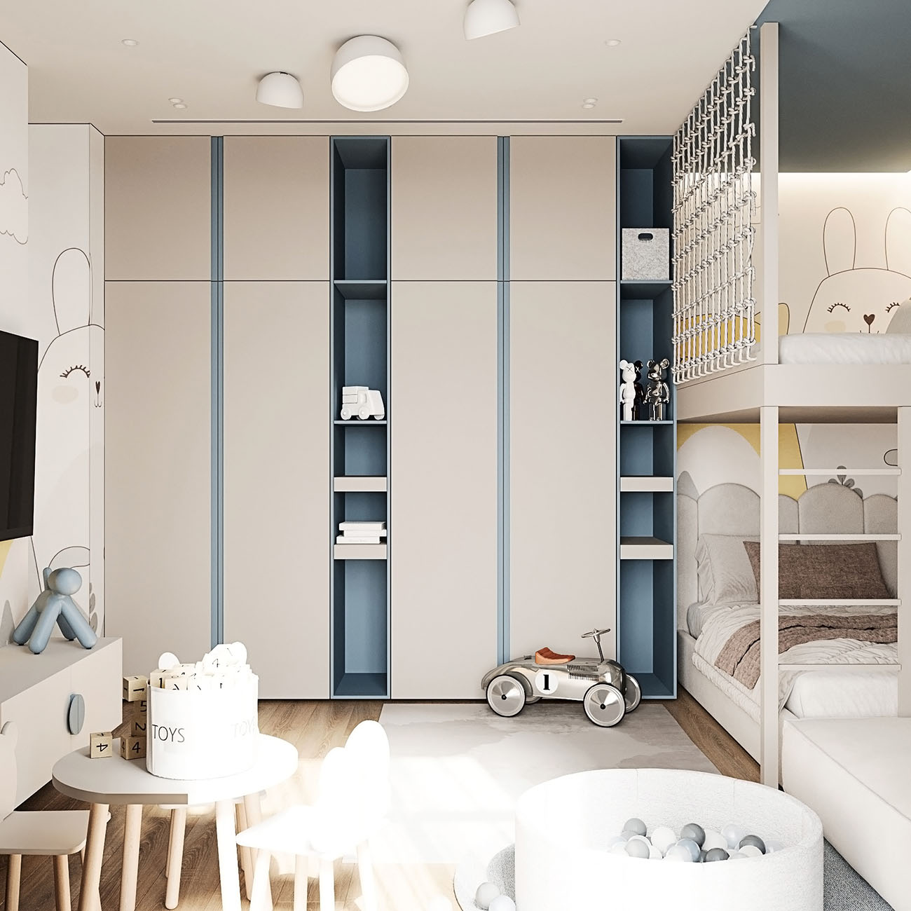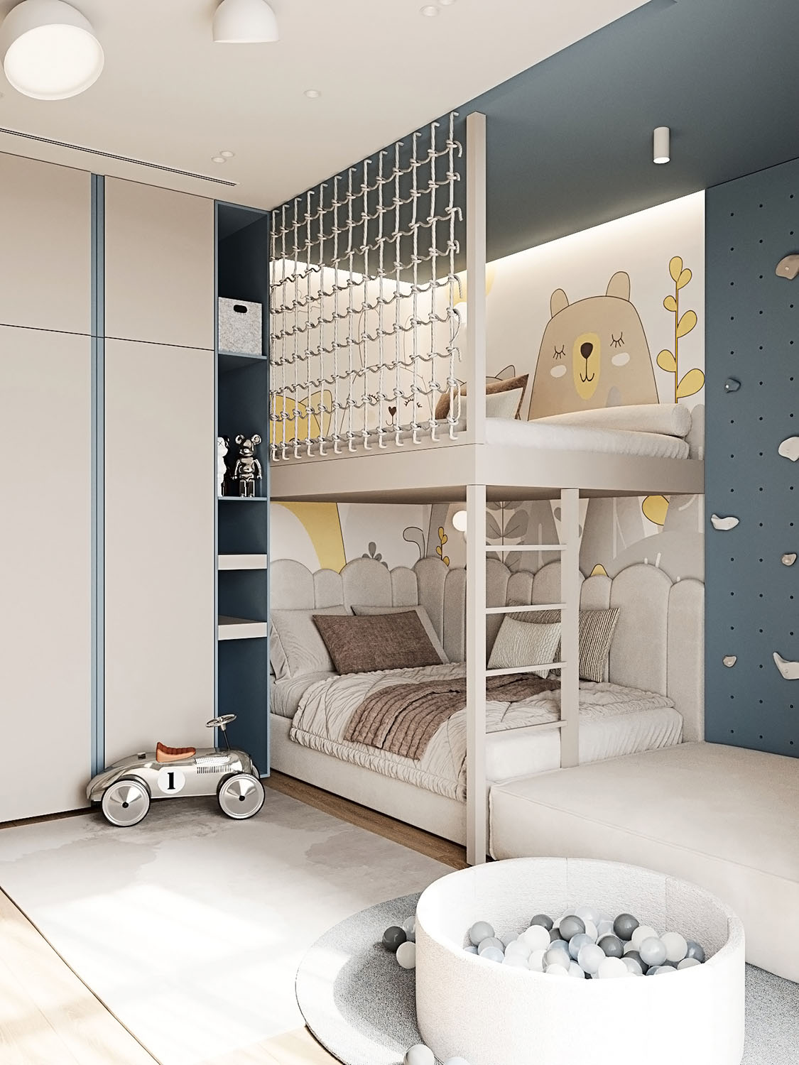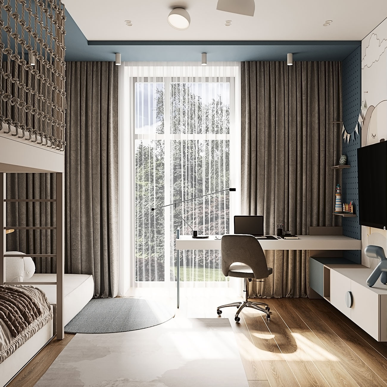 Площадь комнаты — 16,5 м². Заказчики хотели, чтобы детская была с большой игровой зоной над кроватью и рядом. Также задачей было спроектировать уголок для скалолазания. Изначально это — комната для малыша, но в будущем она трансформируется под школьника и его потребности, что можно увидеть на кадрах. Обои BIG LITTLE замечательно вписались в концепцию!