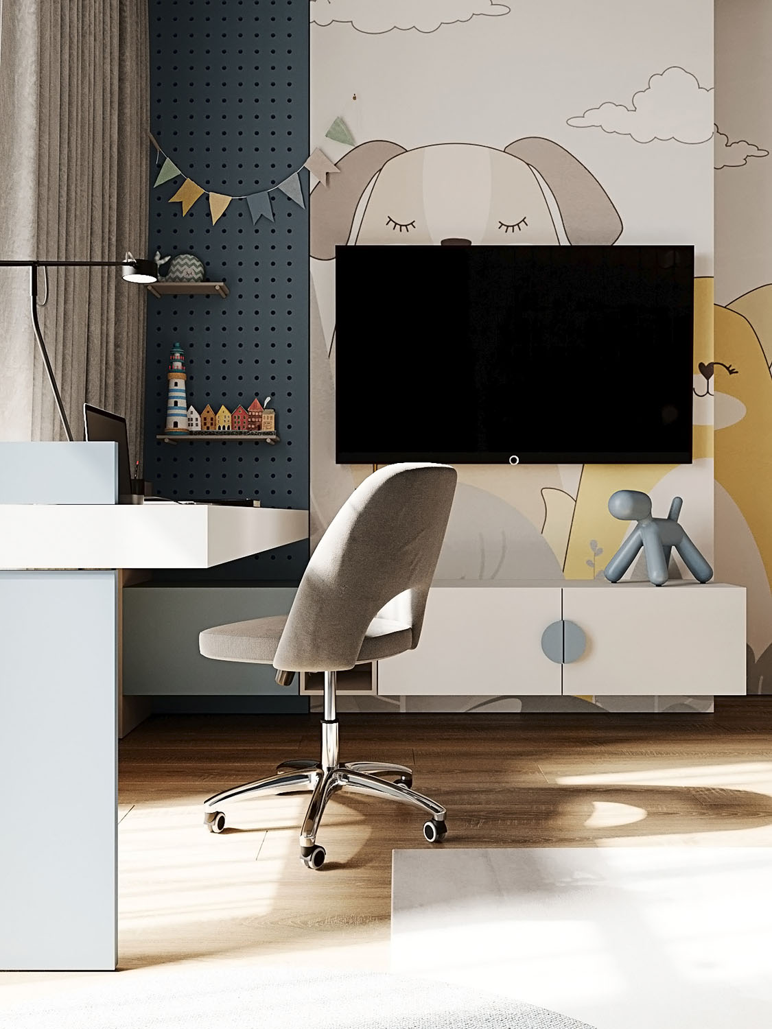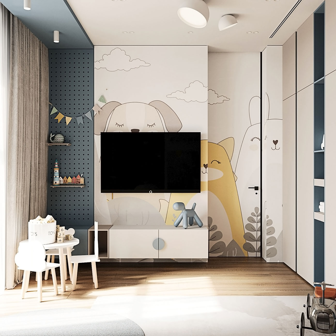Проект дома в г. Пенза общей площадью 450 м² для семьи с 4 детьми. На этих кадрах представлена одна из детских для мальчика.