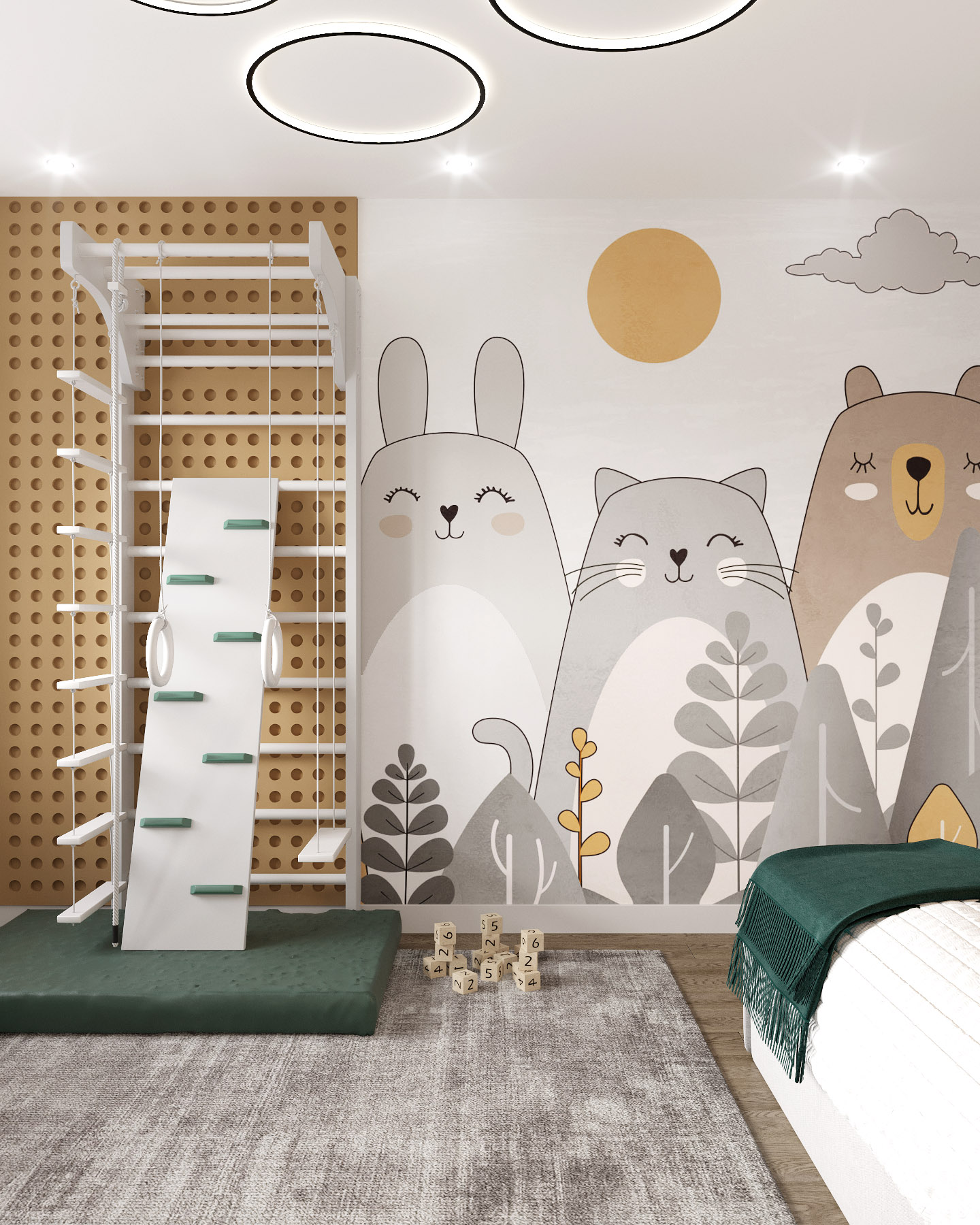 Детская комната площадью 10 м² для маленького мальчика, город Екатеринбург. В проекте использованы обои из коллекции «Big Little». Еще до создания концепции, заказчица высказала свое пожелание по поводу фрески, в приоритете были изображения животных, излучающих добро и тепло.