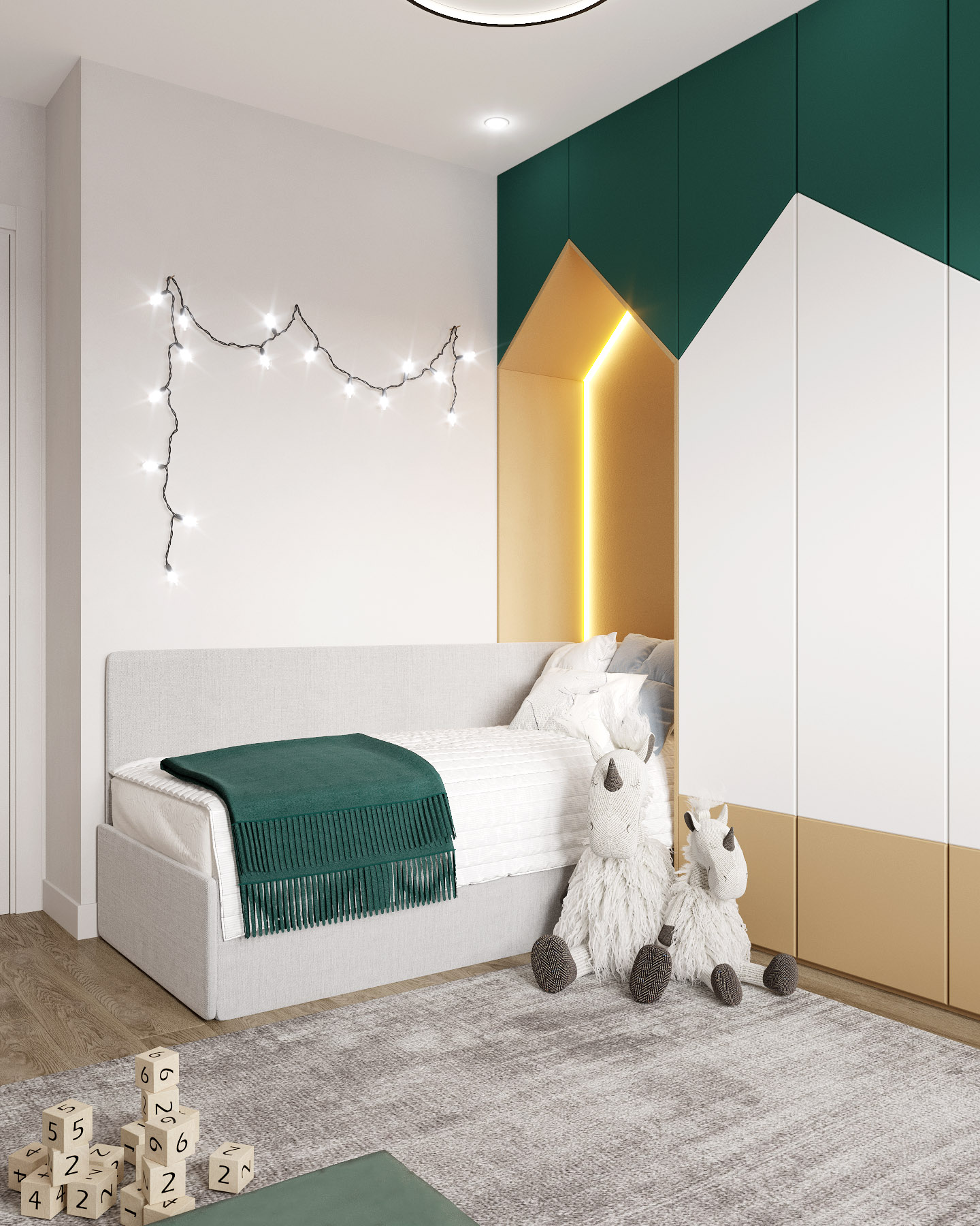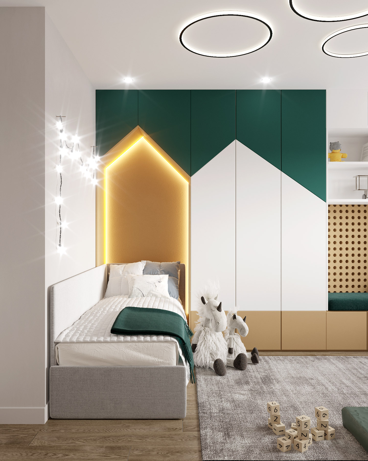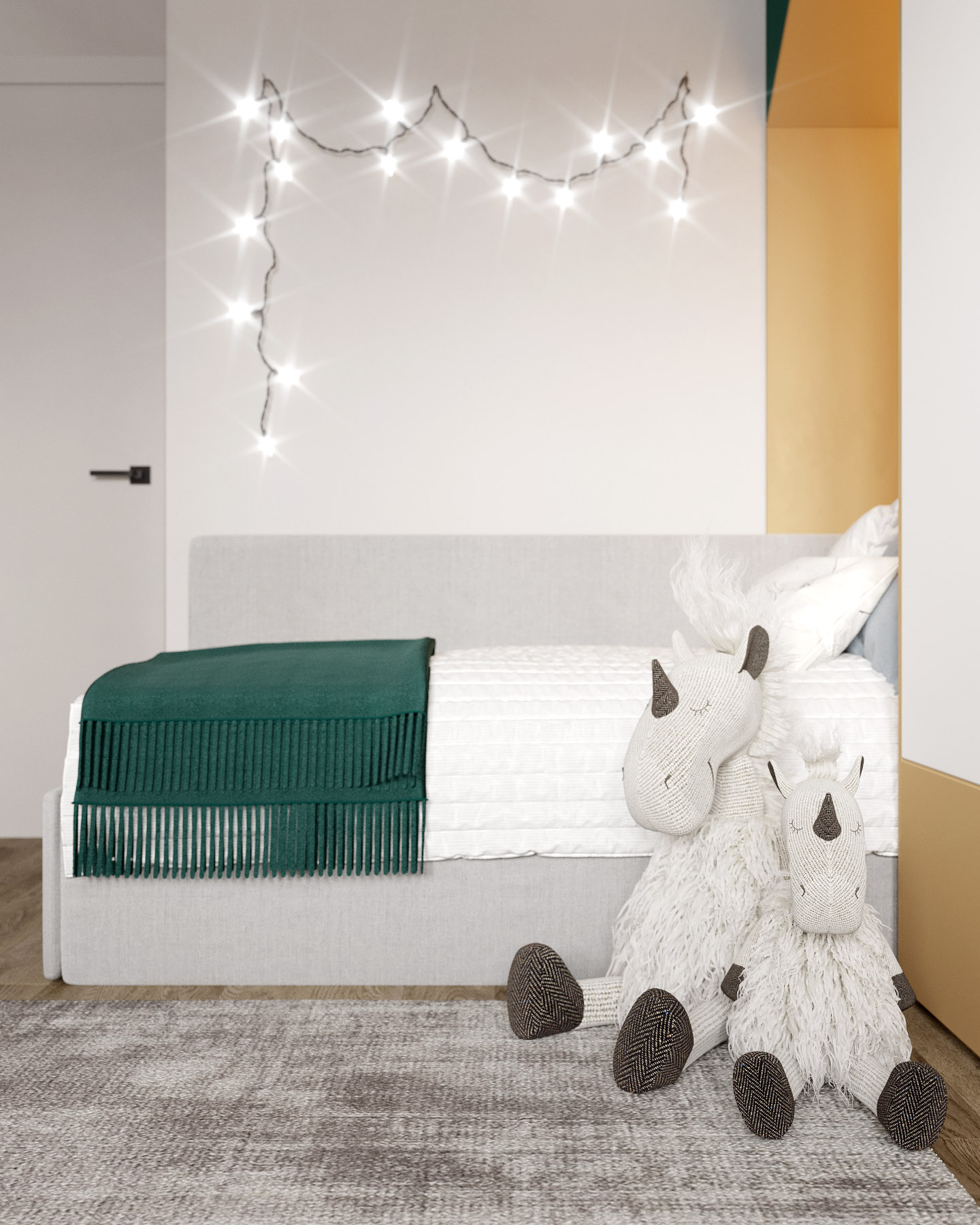 В детской стояла задача подобрать цветовое решение относительно уже купленного комплекта мебели для рисования, который будет храниться в специально отведенном месте и расставляться во время занятия с ребенком. Также важной задачей было разместить в комнате большой шкаф для хранения одежды и игрушек, спортивный комплекс, рабочий стол, кровать и применить в декоре стен фреску.