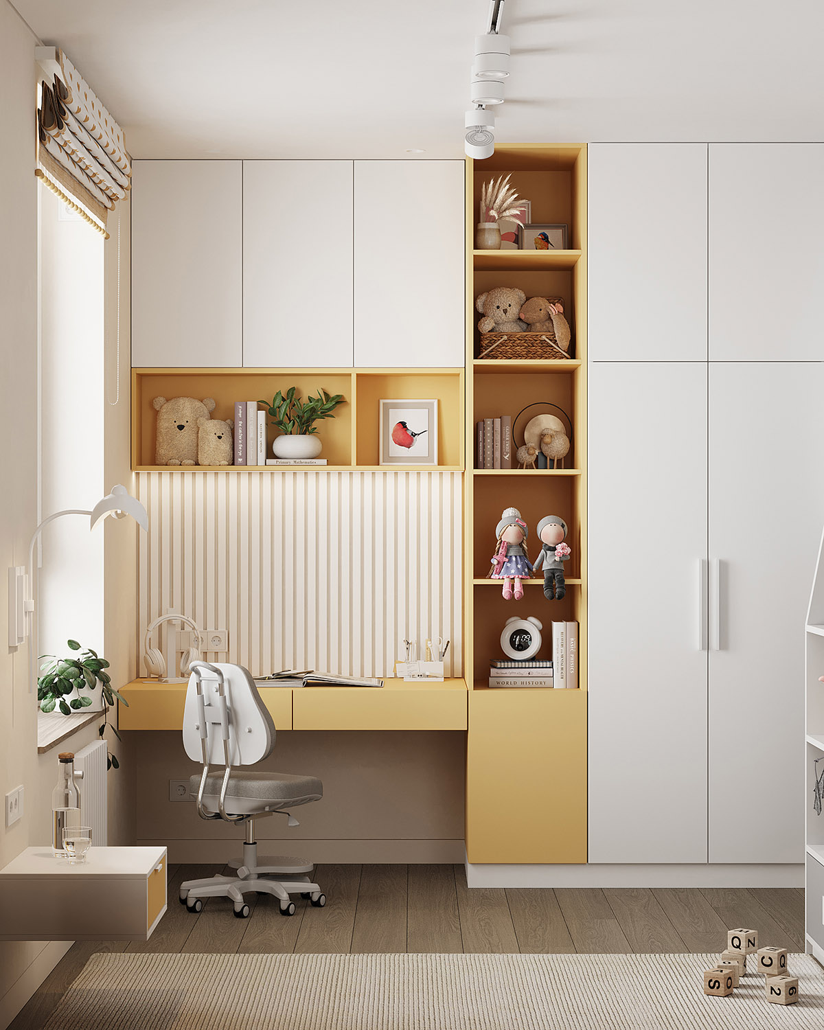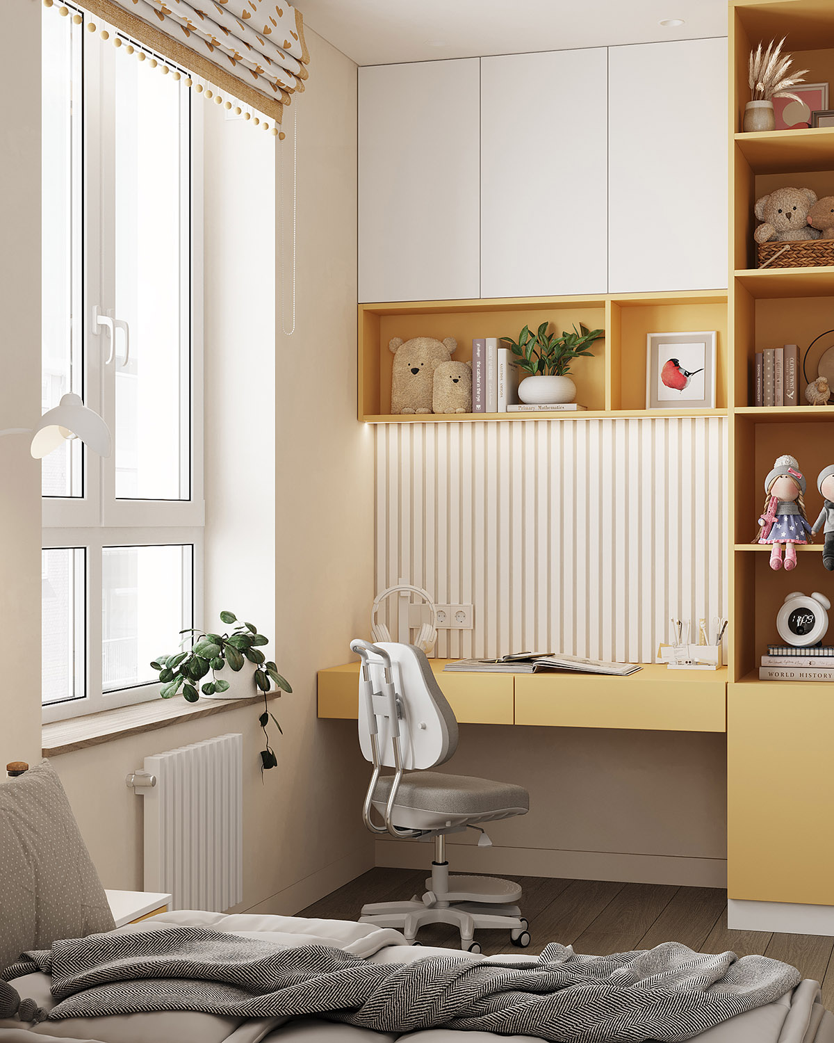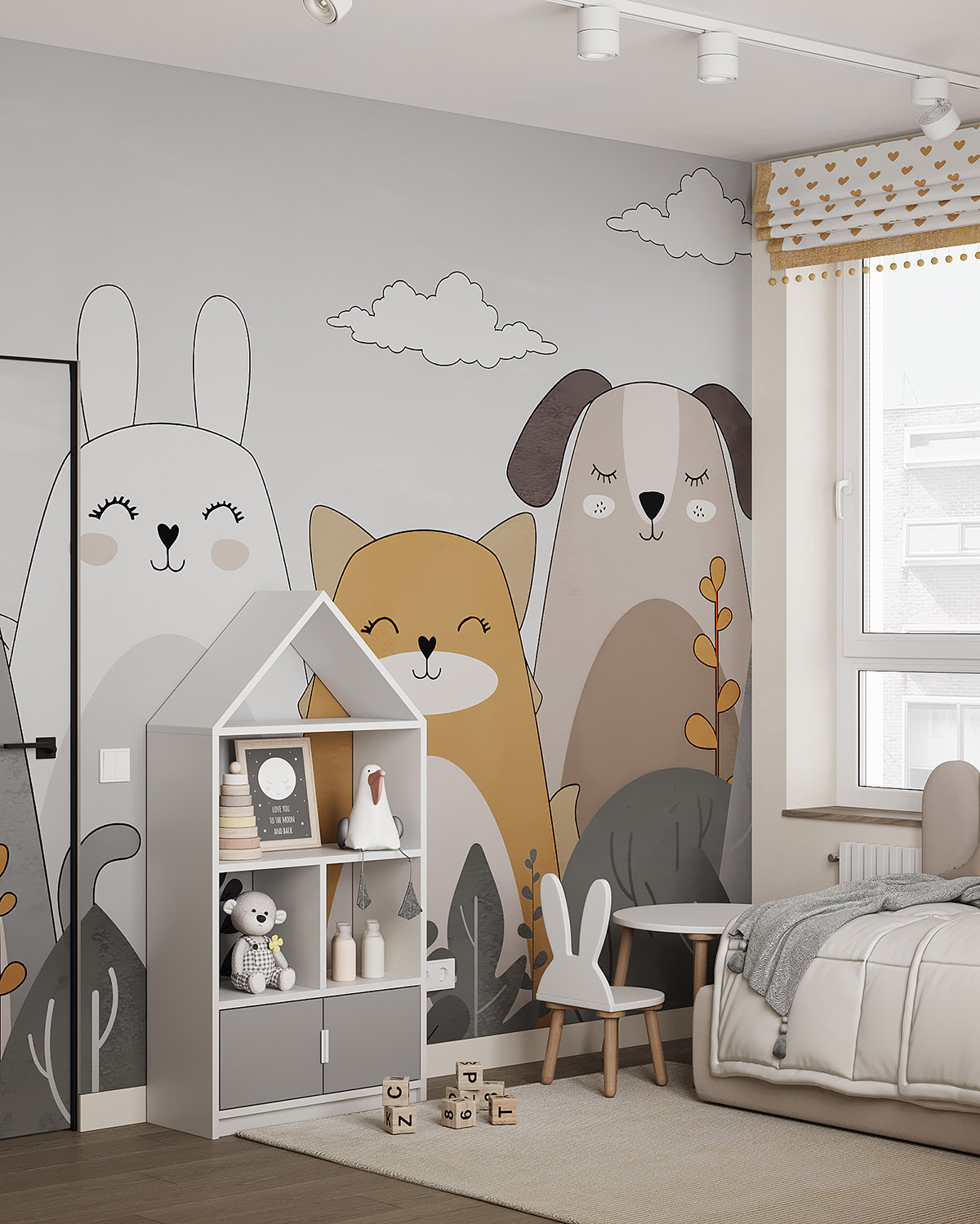Проект детской комнаты площадью 11,2 м² для девочки трех лет с перспективой для размещения рабочей зоны. Обои из коллекции BIG LITTLE. Яркие и пастельные, абстрактные и реалистичные обои в коллекции помогут вам создать идеальную детскую, исходя из темперамента и характера ребенка. Горы в сочетании с плюшевыми животными, домами и самолетами – это универсальные сюжеты, которые подойдут как в комнату мальчика, так и девочки.