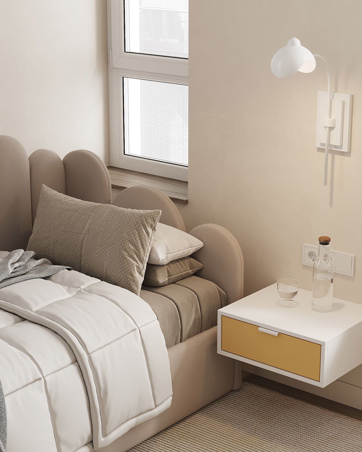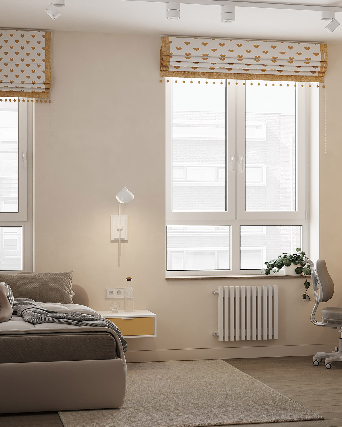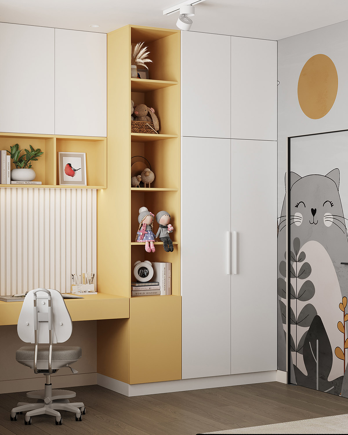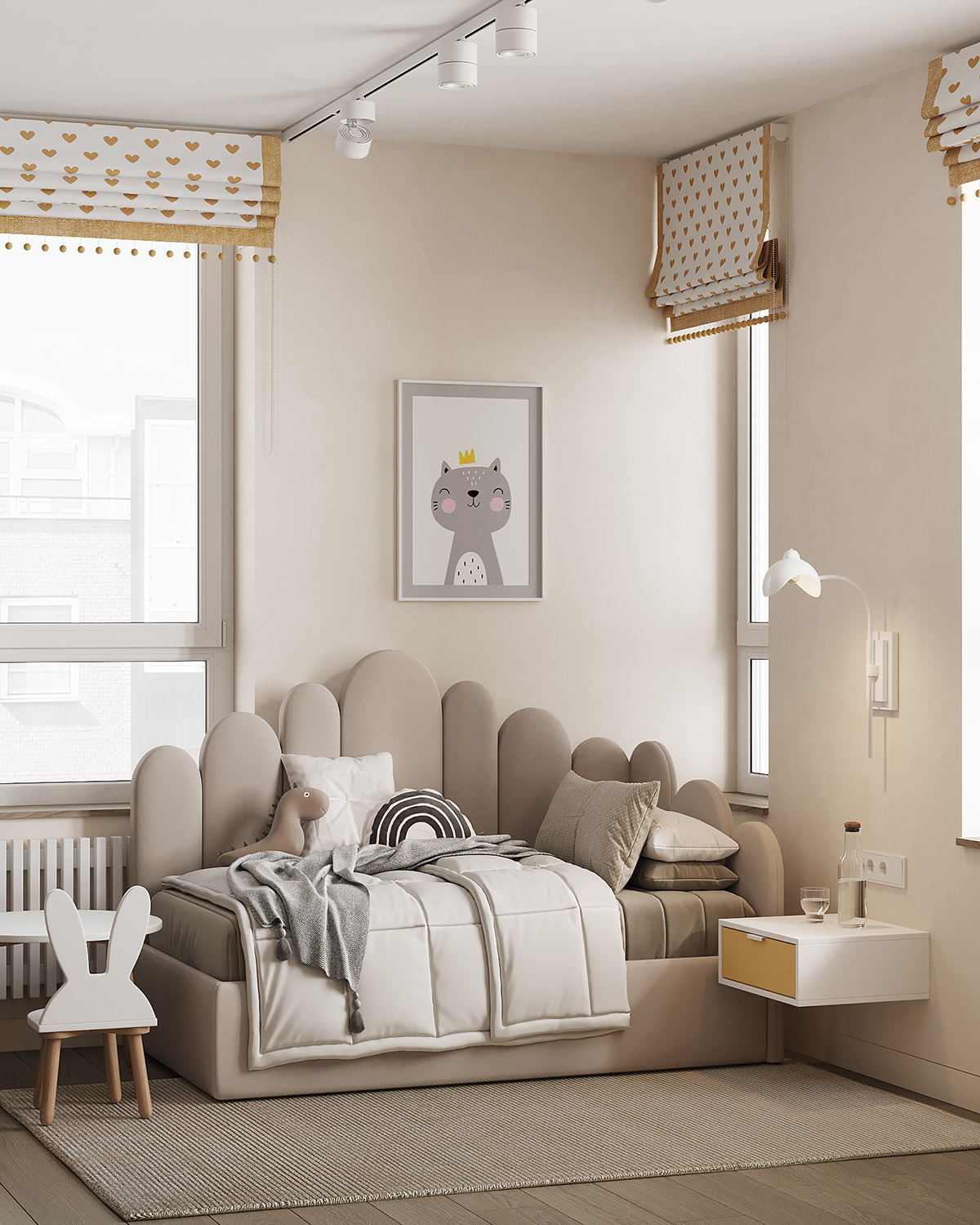Проект детской комнаты площадью 11,2 м² для девочки трех лет с перспективой для размещения рабочей зоны. Обои из коллекции BIG LITTLE. Яркие и пастельные, абстрактные и реалистичные обои в коллекции помогут вам создать идеальную детскую, исходя из темперамента и характера ребенка. Горы в сочетании с плюшевыми животными, домами и самолетами – это универсальные сюжеты, которые подойдут как в комнату мальчика, так и девочки.
