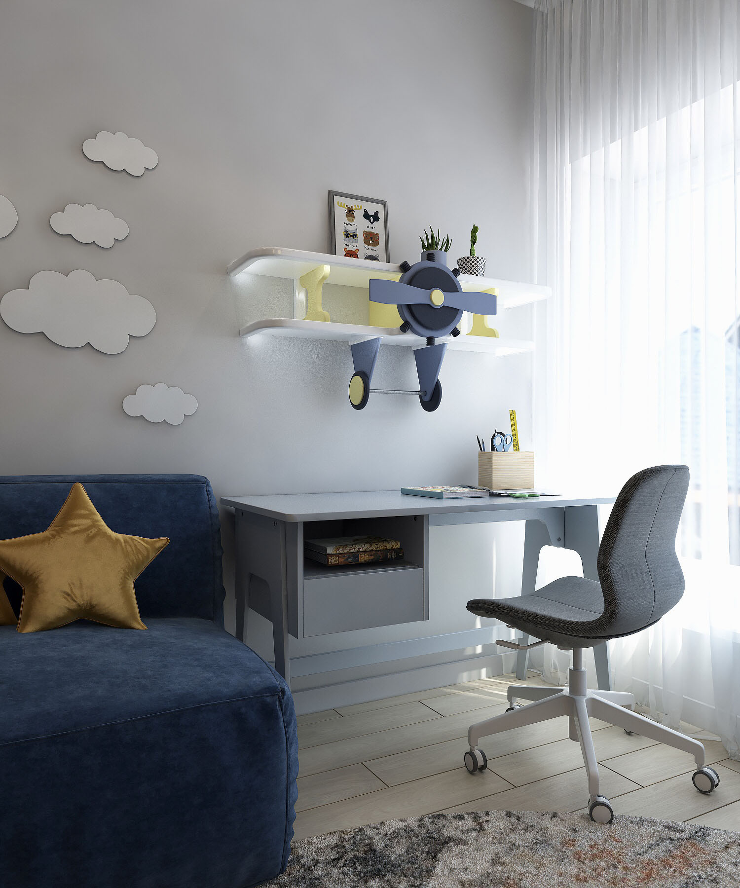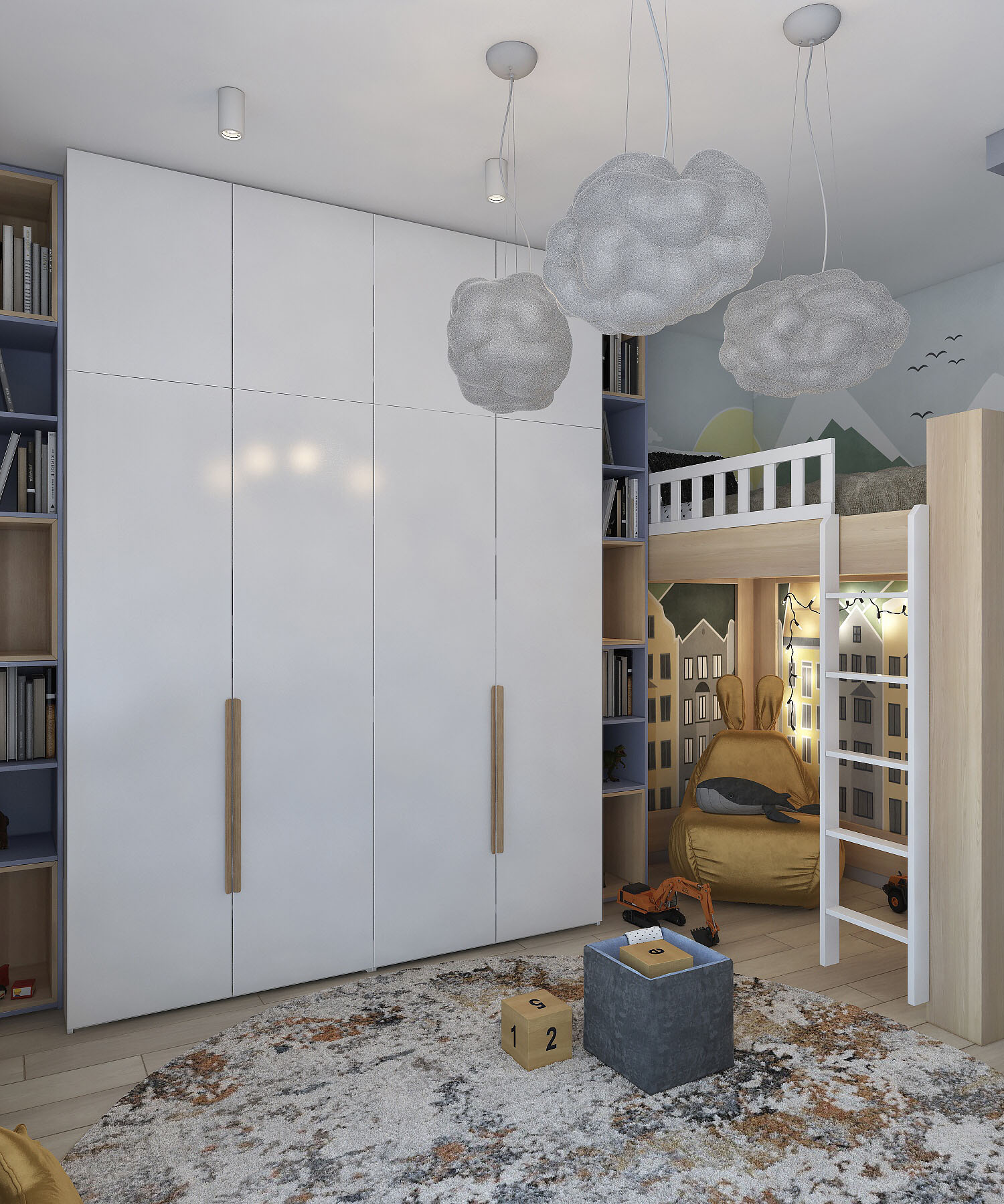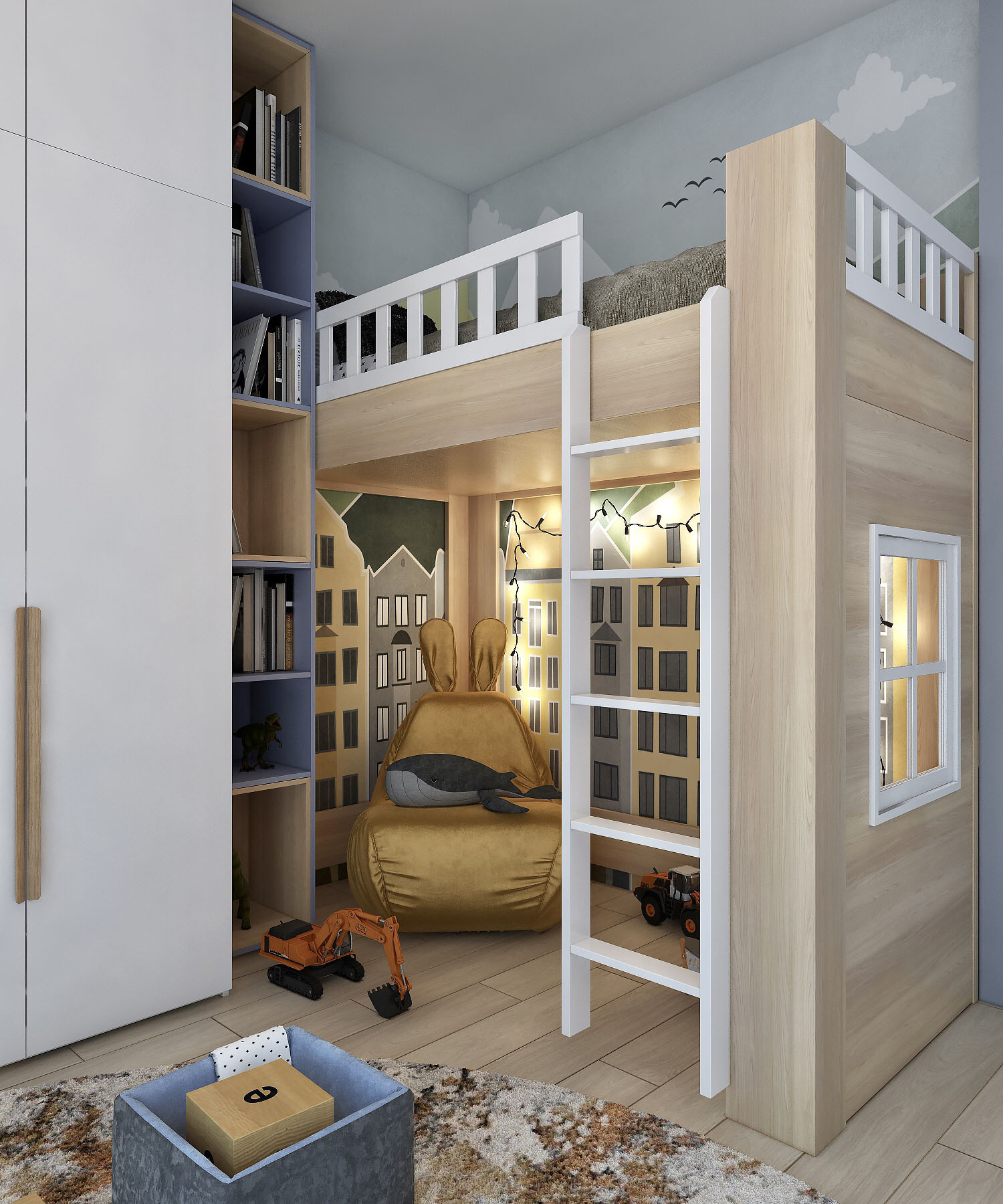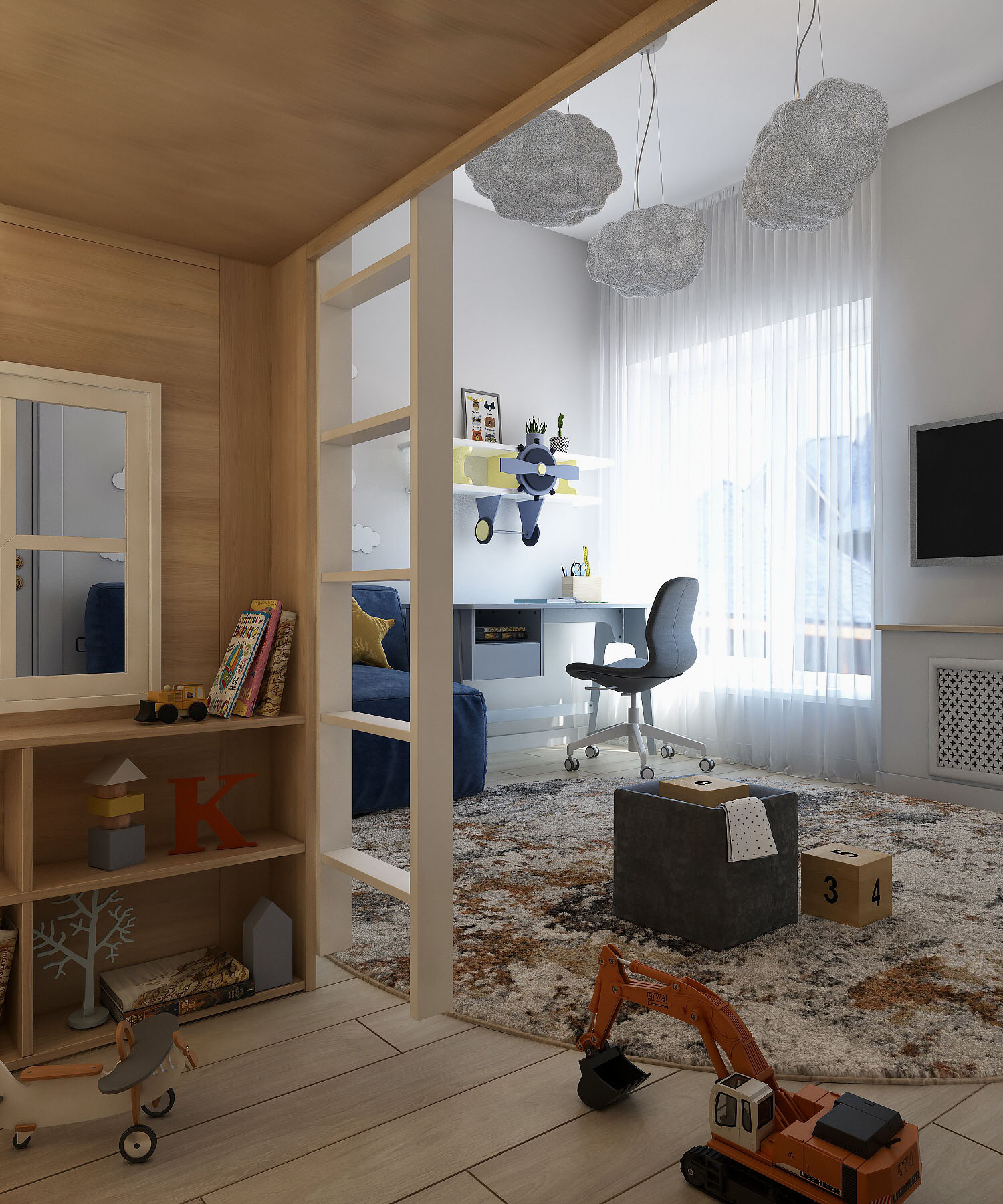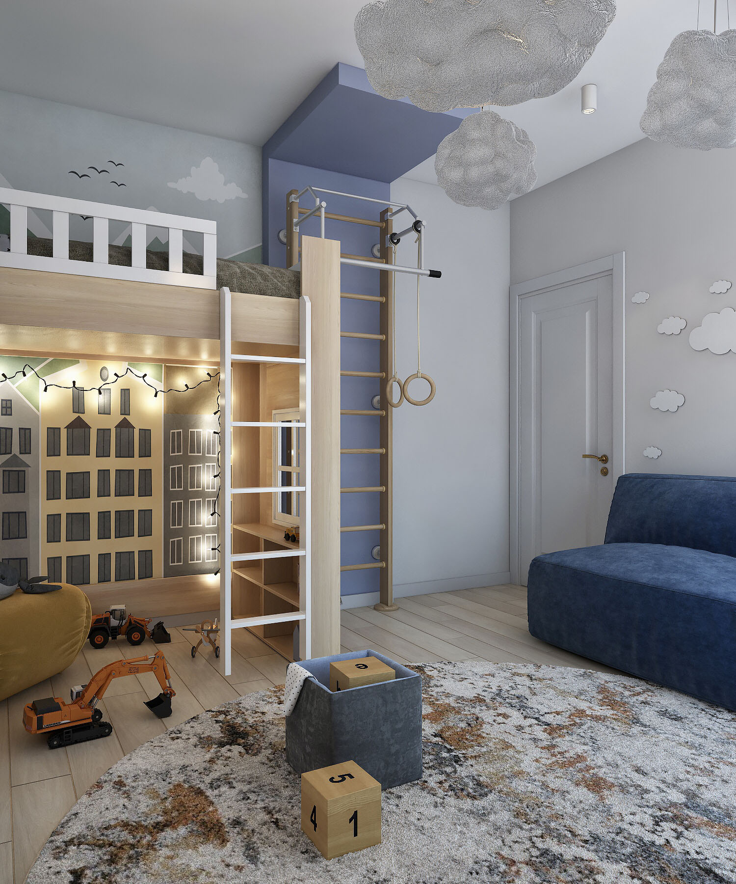 Дети должны жить в сказке! Для этого четырехлетнего мальчика такую сказку помогли создать обои из коллекции Big Little. Изображение гор не только увеличивает пространство, делает комнату выше, но и влияет на подсознание. А горы в сочетании с плюшевыми животными, домами и самолетами – это универсальные сюжеты, которые подойдут как в комнату мальчика, так и девочки.