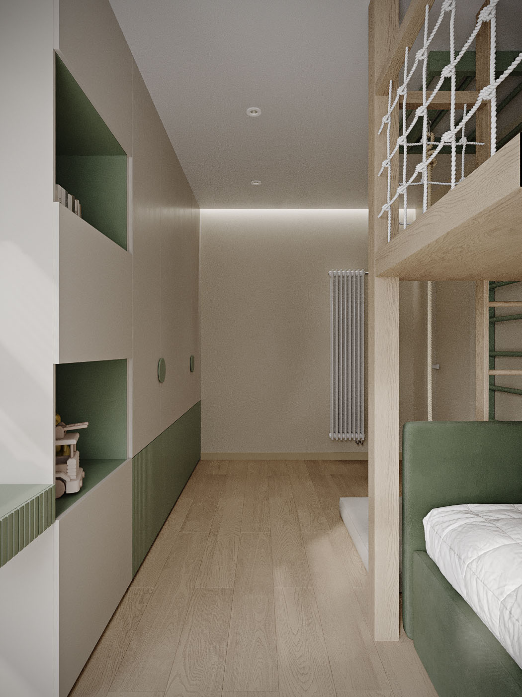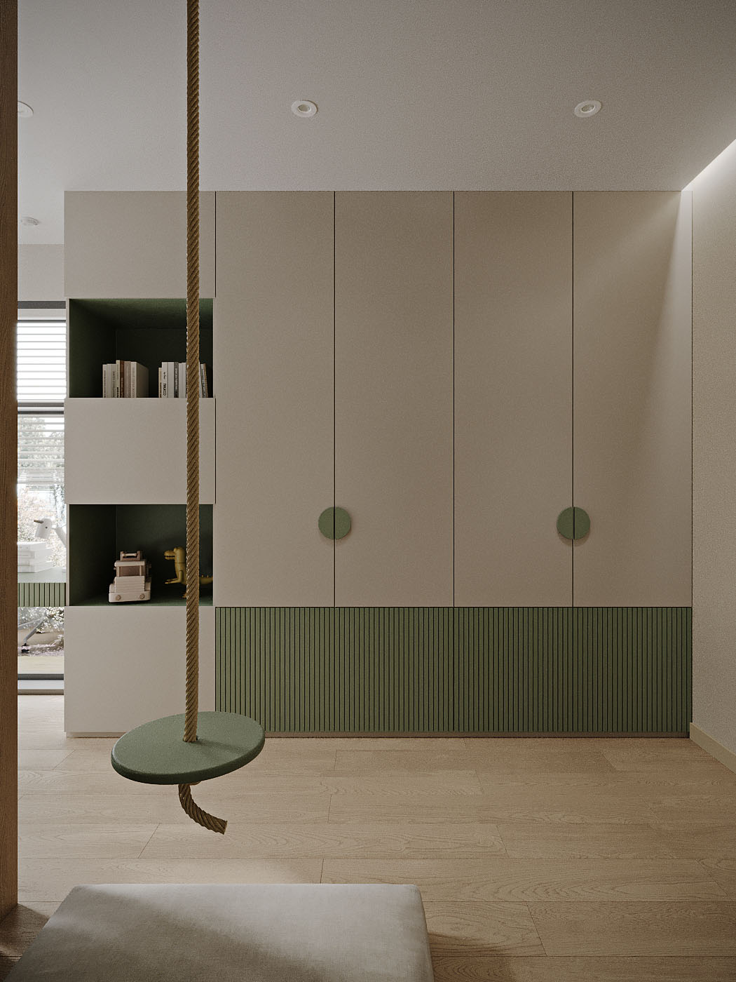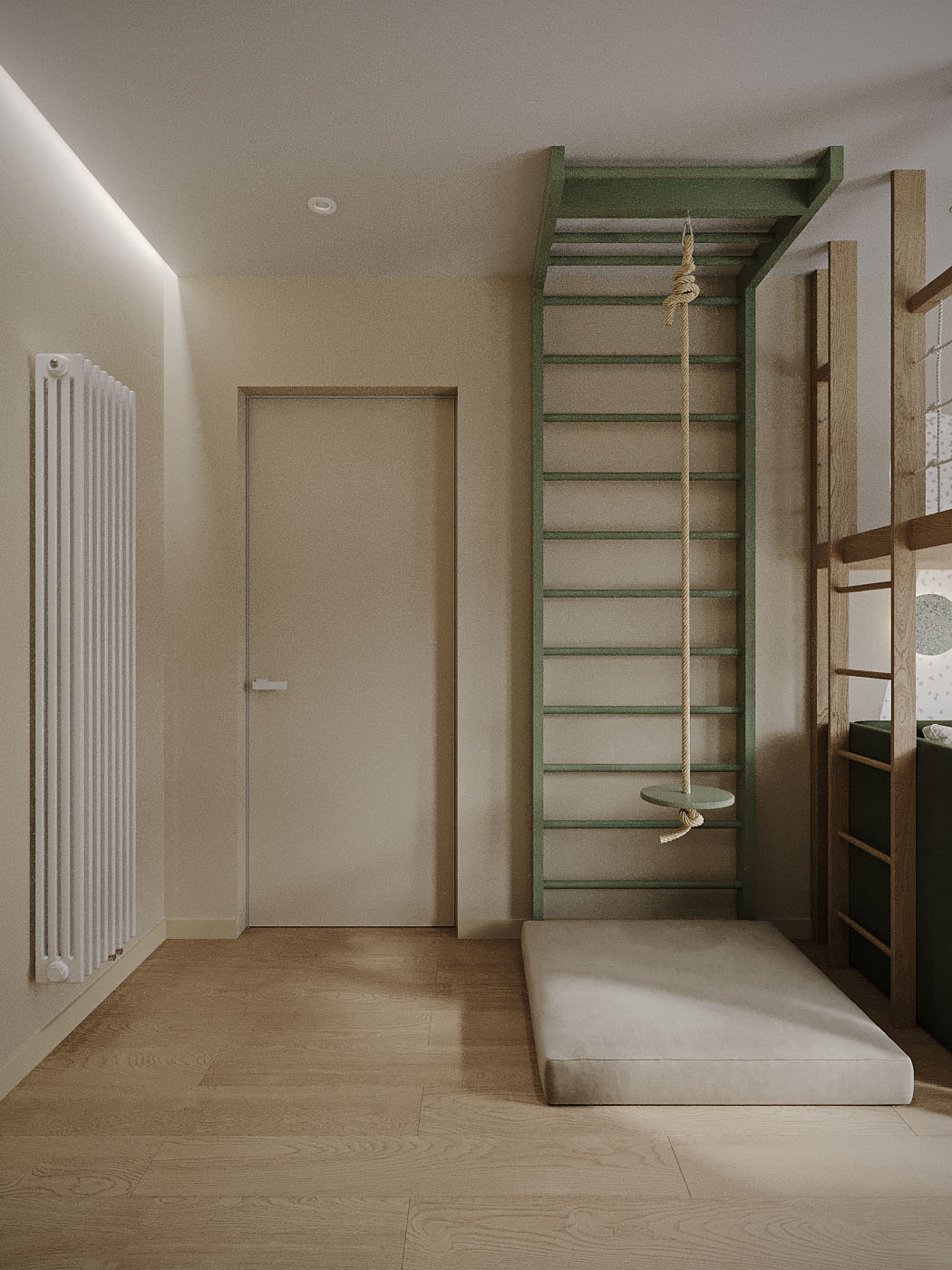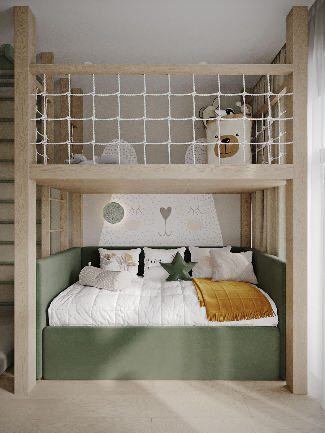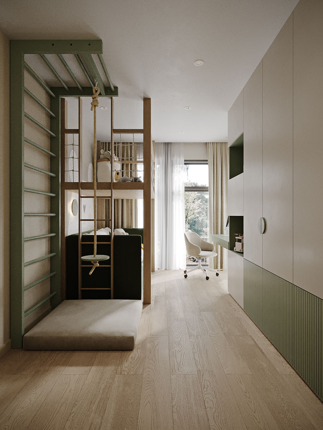 Детская для мальчика в загородном доме в Подмосковье. Площадь комнаты — 14 м². Одним из главных пожеланий заказчиков было сделать игровую зону для ребенка, поэтому над спальным местом расположили антресоль с игровым местом, а рядом — шведскую стенку. Детская сделана в современном стиле, главным акцентом в этом интерьере выбран зеленый цвет и Необои из коллекции Big Little с изображением мишки. Медвежонок как будто выглядывает из-за кровати и играет с ребенком в прятки. Дизайн детской получился очень уютным, и при этом с удачной планировкой, где есть все необходимые зоны для учебы и игр.