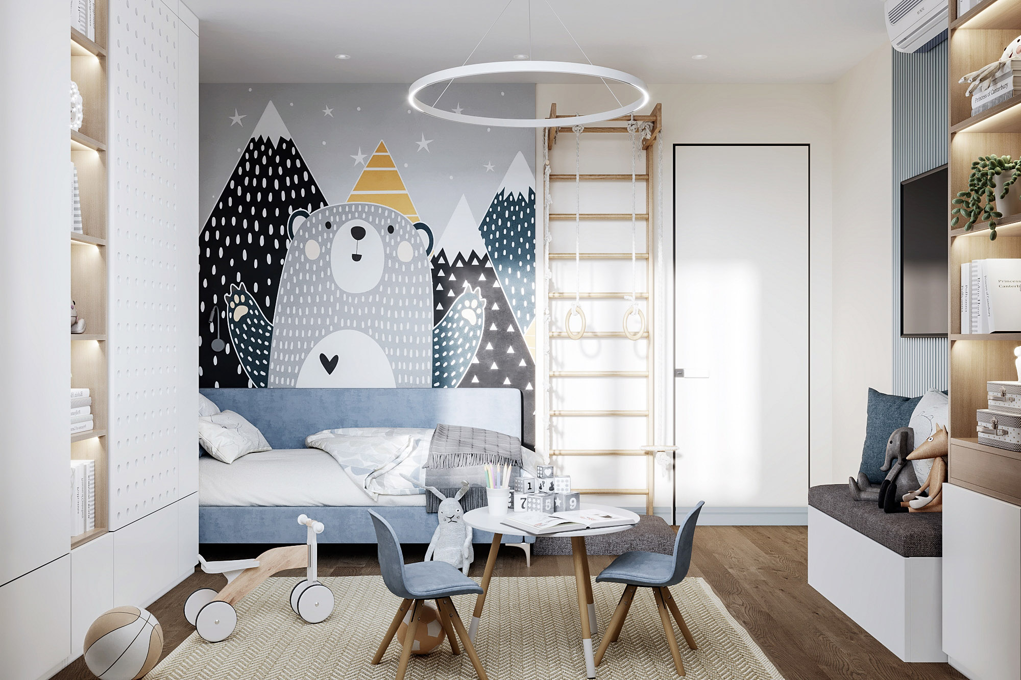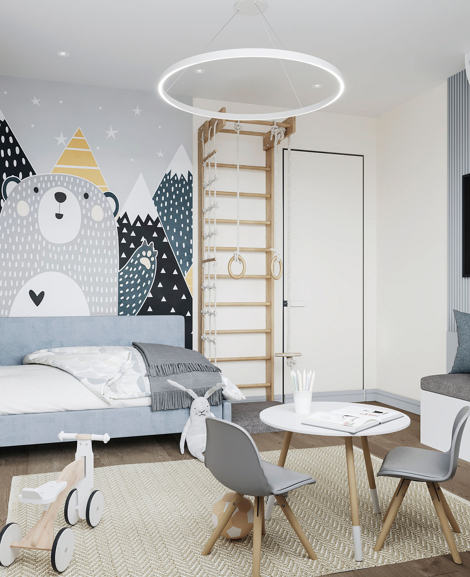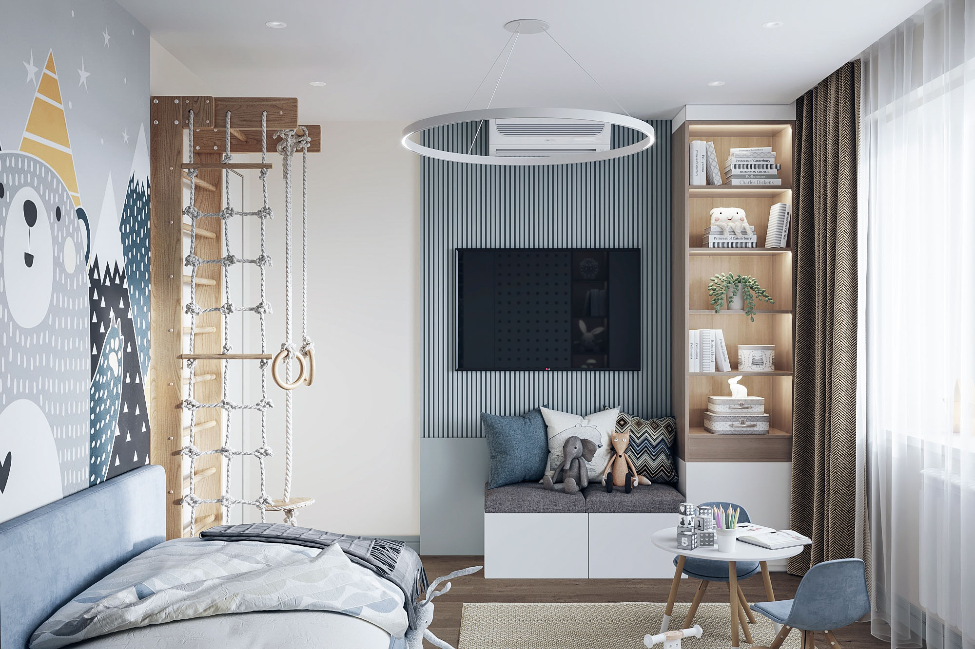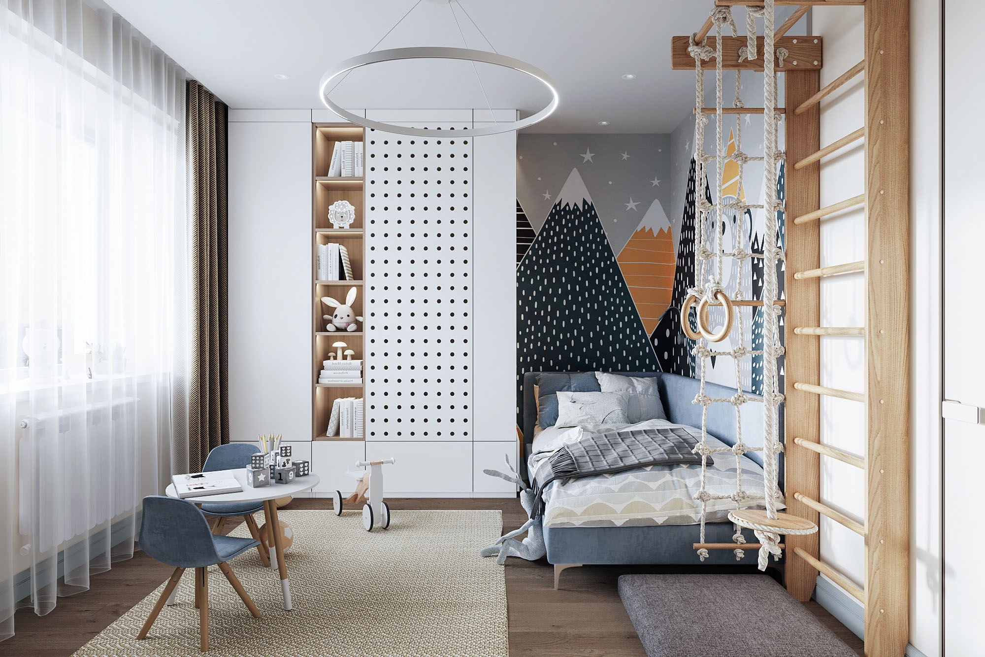 Детская для мальчика четырех лет. Площадь комнаты — 12,5 м². Находится она в просторной квартире в городе Иркутск. Из пожеланий было создать удобное, комфортное и уютное пространство с необходимым функционалом. В комнате запроектировано достаточное количество мест хранения, шведская стенка для физического развития малыша, просторное место для игр. Также предусмотрен специальный шкаф-пенал, к которому в будущем будет встроен учебный стол.