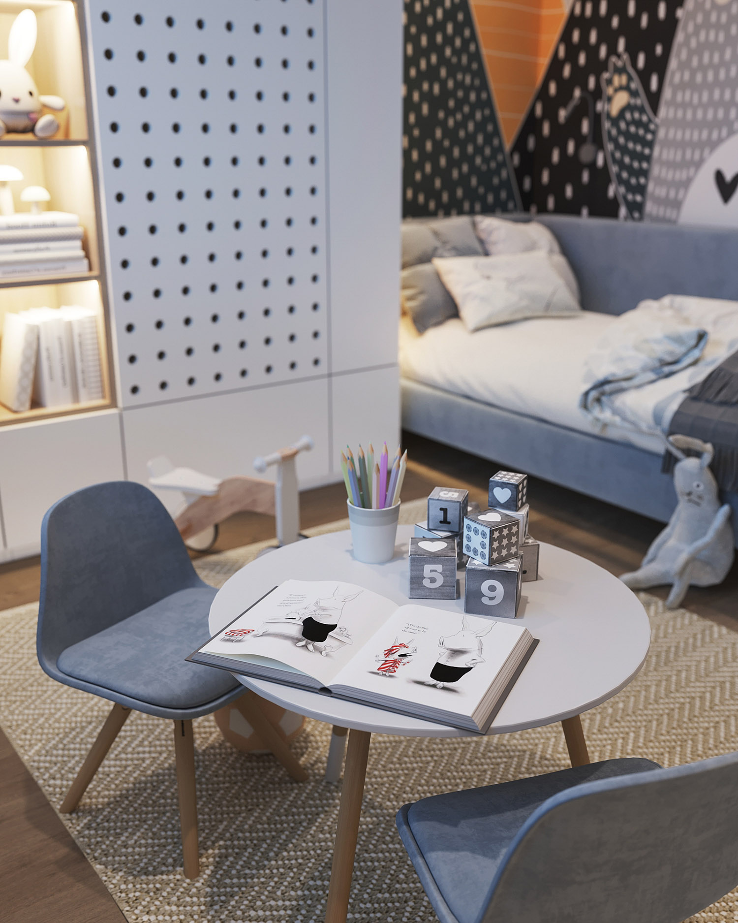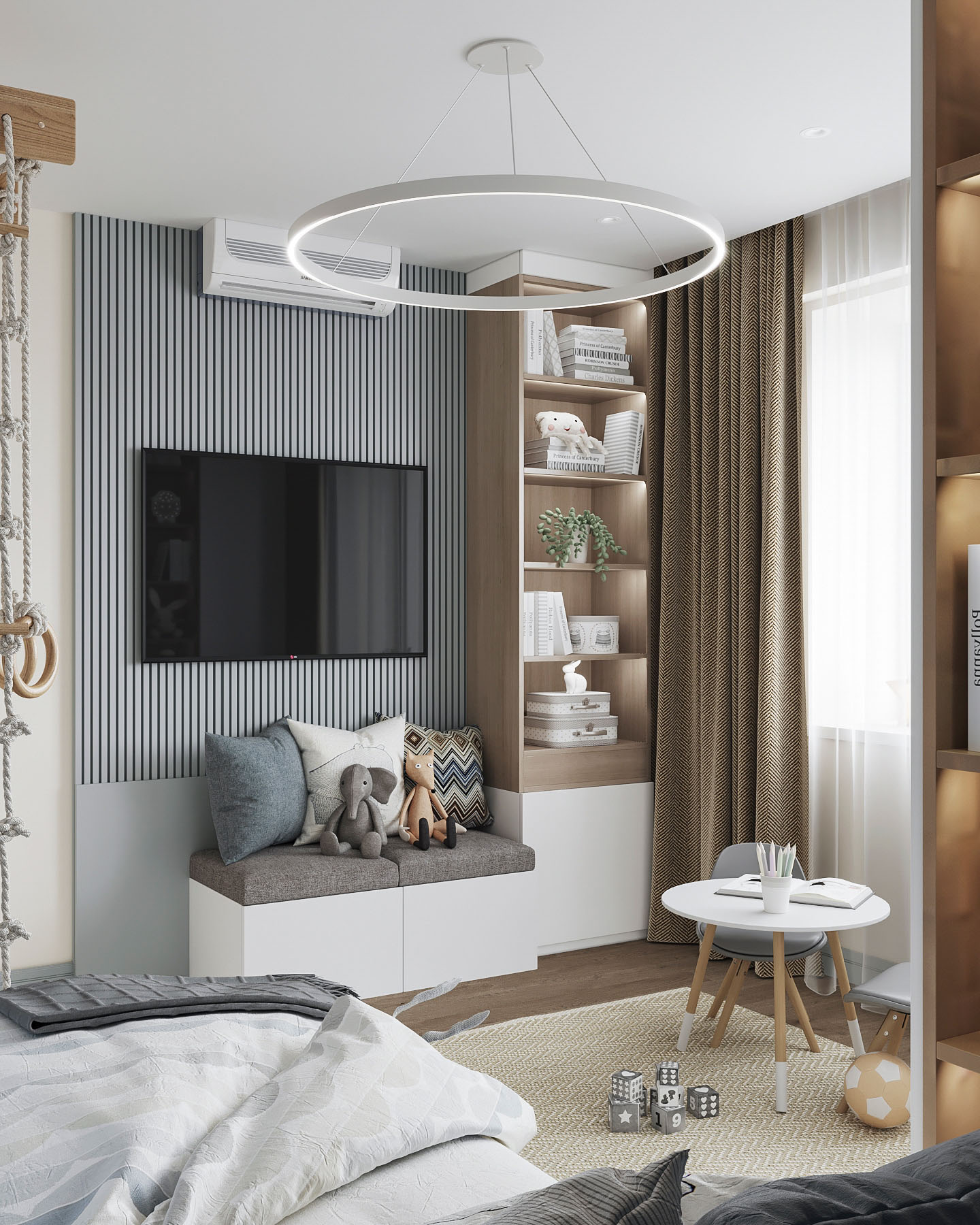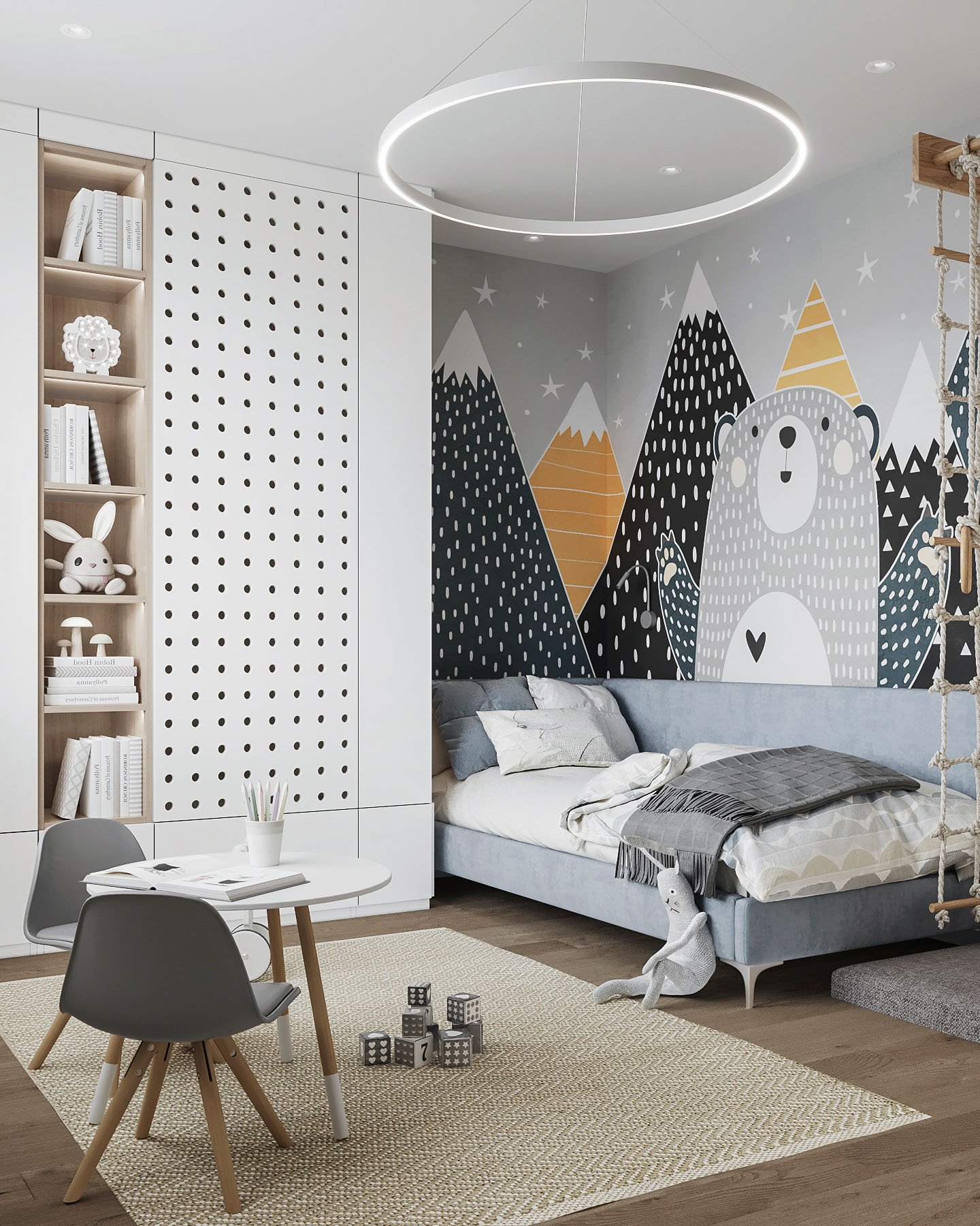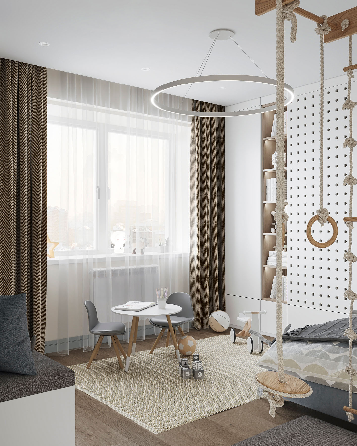Детская для мальчика четырех лет. Площадь комнаты — 12,5 м². Находится она в просторной квартире в городе Иркутск. Из пожеланий было создать удобное, комфортное и уютное пространство с необходимым функционалом. В комнате запроектировано достаточное количество мест хранения, шведская стенка для физического развития малыша, просторное место для игр. Также предусмотрен специальный шкаф-пенал, к которому в будущем будет встроен учебный стол.