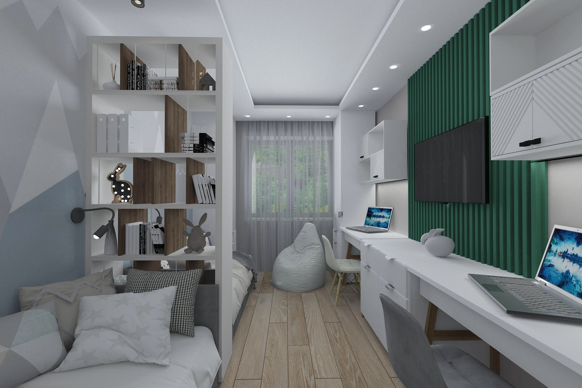 Дизайн комнаты 19 м² для двух братьев 5 и 7 лет из города Сургут. Важно было зонально разделить спальные места, но без загромождения. Обязательно два рабочих места. Цвета должны быть монохромными, но с ярким акцентом. В этом проекте было использовано авторское изображение. Похожие принты можно найти в нашей коллекции «Big Little».