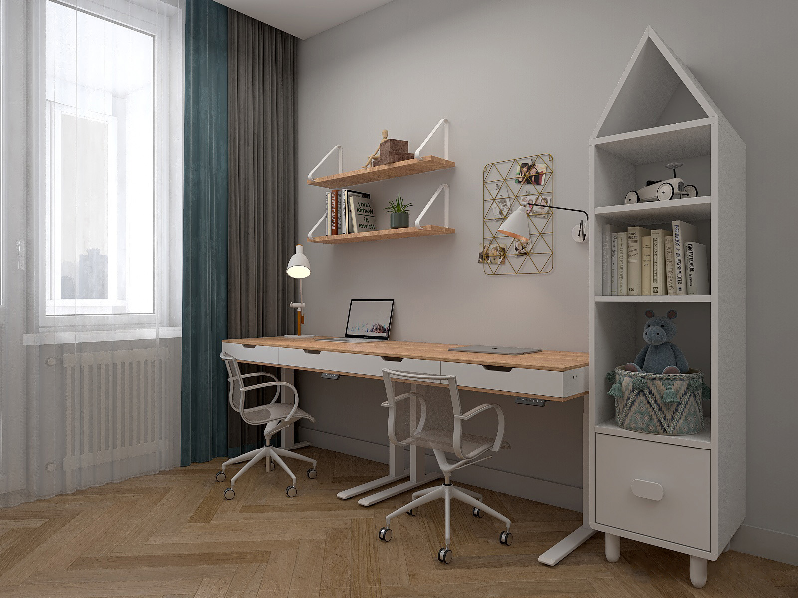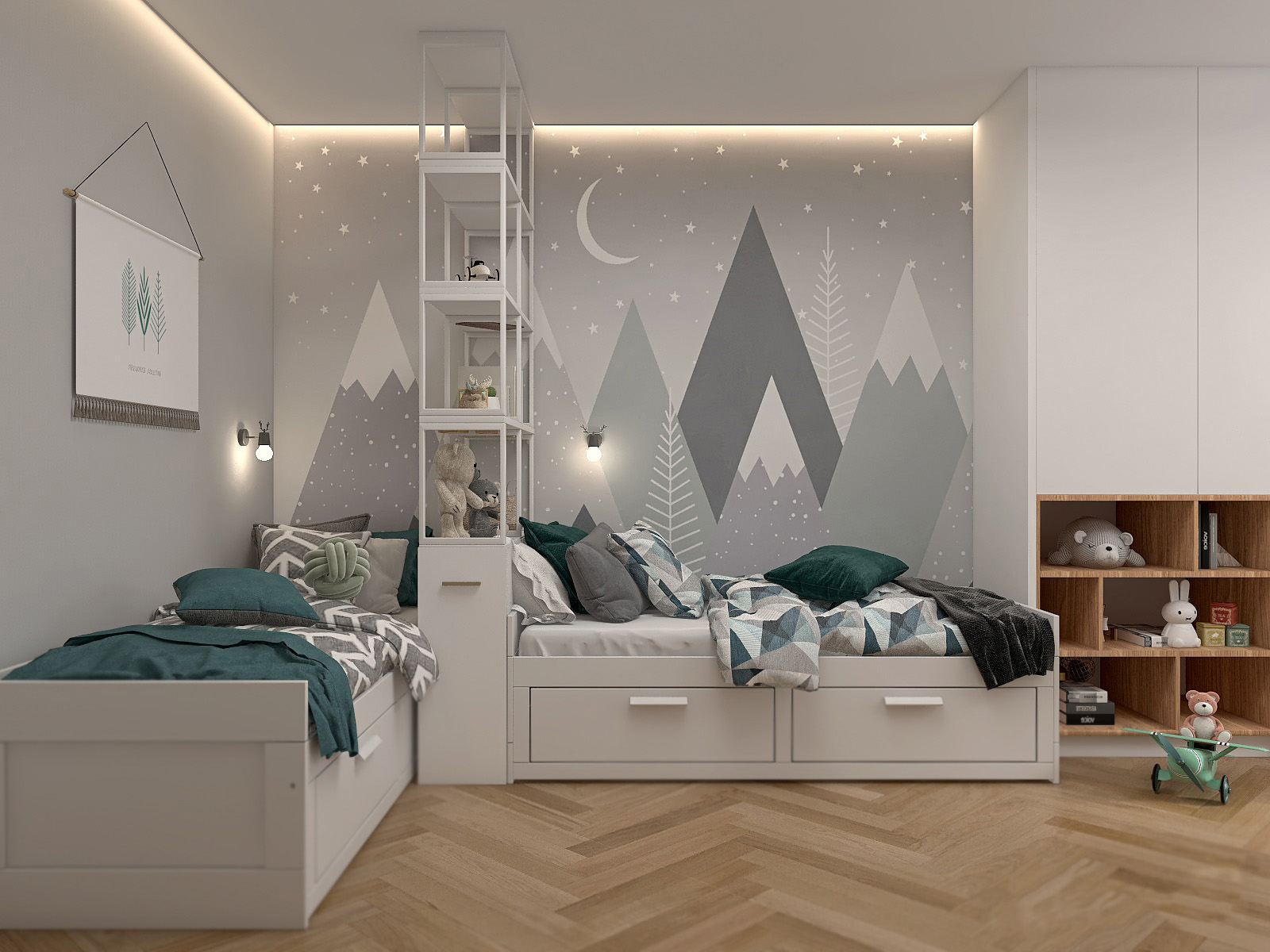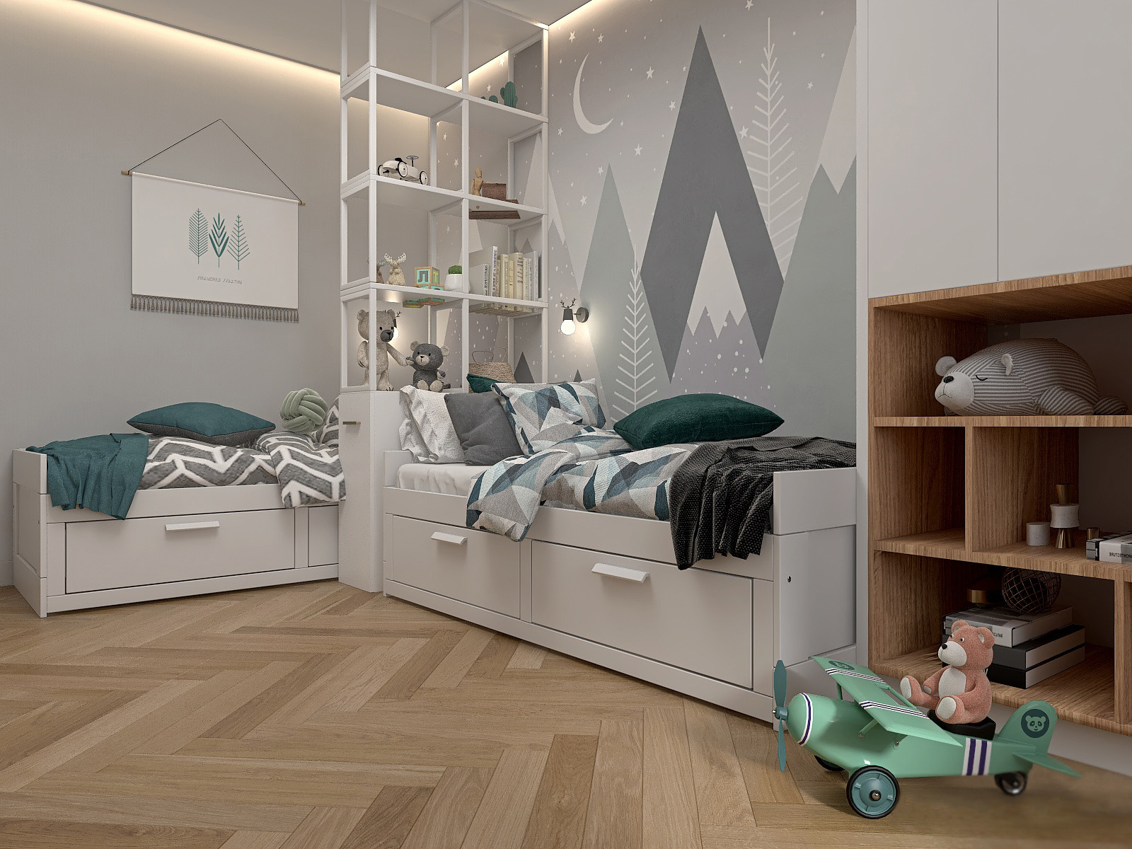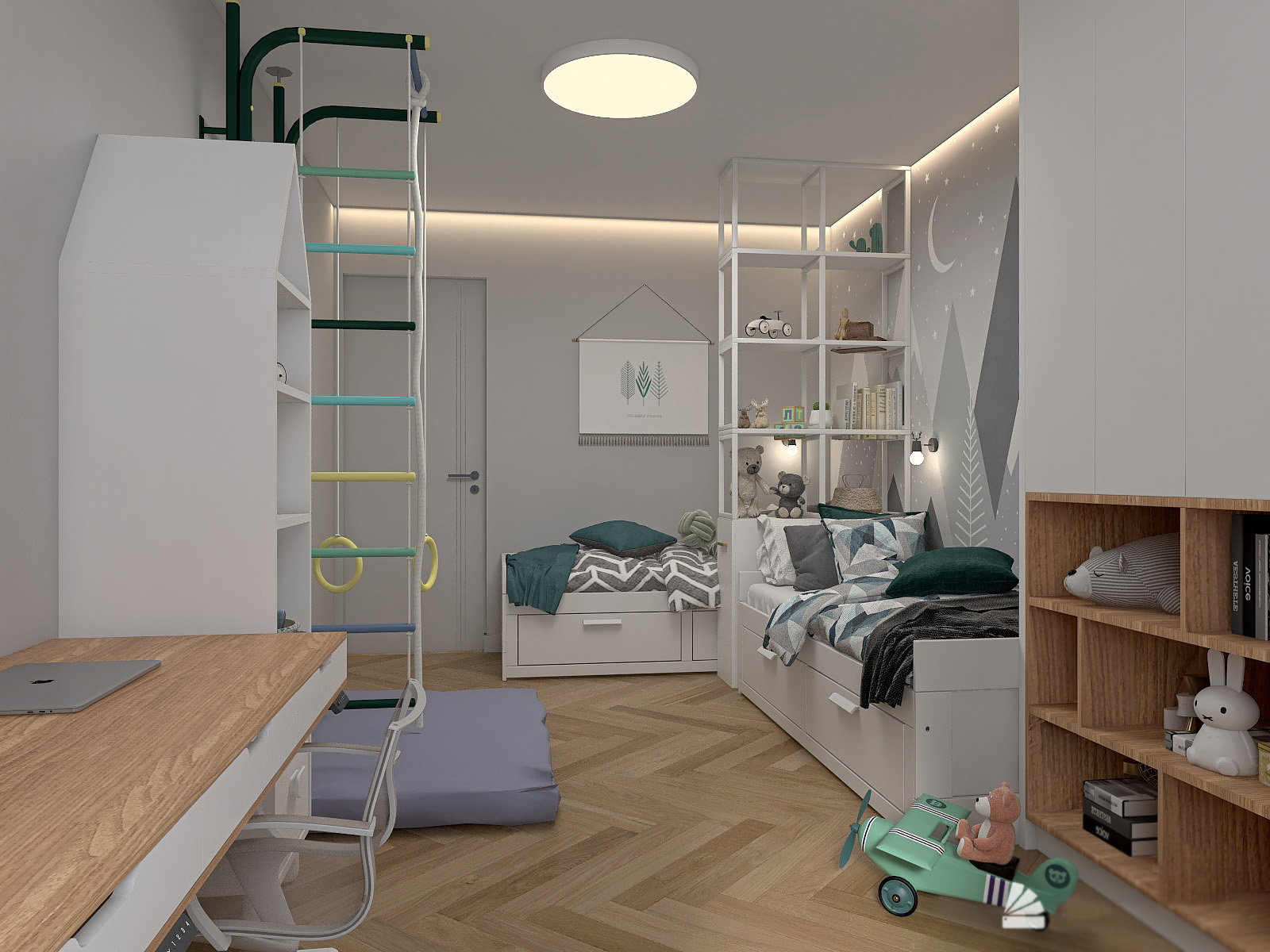 Детская для двух мальчиков. Площадь комнаты — 16 м². Задача была разместить всю необходимую мебель: 2 кровати, 2 рабочих места, место для хранения одежды, книг, игровую зону, и сделать пространство функциональным и красивым.