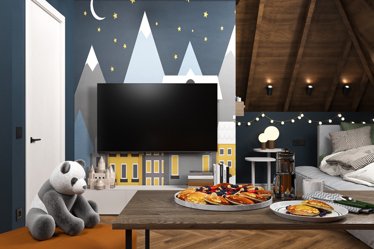 Дизайн детской комнаты в частном доме на мансардном этаже. Обои из коллекции BIG LITTLE. Сказочные вершины принтов Big Little перенесут маленького хозяина комнаты в далекие страны и познакомят с чудесными персонажами – лисичками и мишками, зайчиками и котиками – благодаря красочному «мультяшному» стилю. Изображение гор не только увеличивает пространство, делает комнату выше, но и влияет на подсознание. Если ребенок уже ходит в школу, горы будут стимулировать ее к хорошей учебе и достижению успехов.