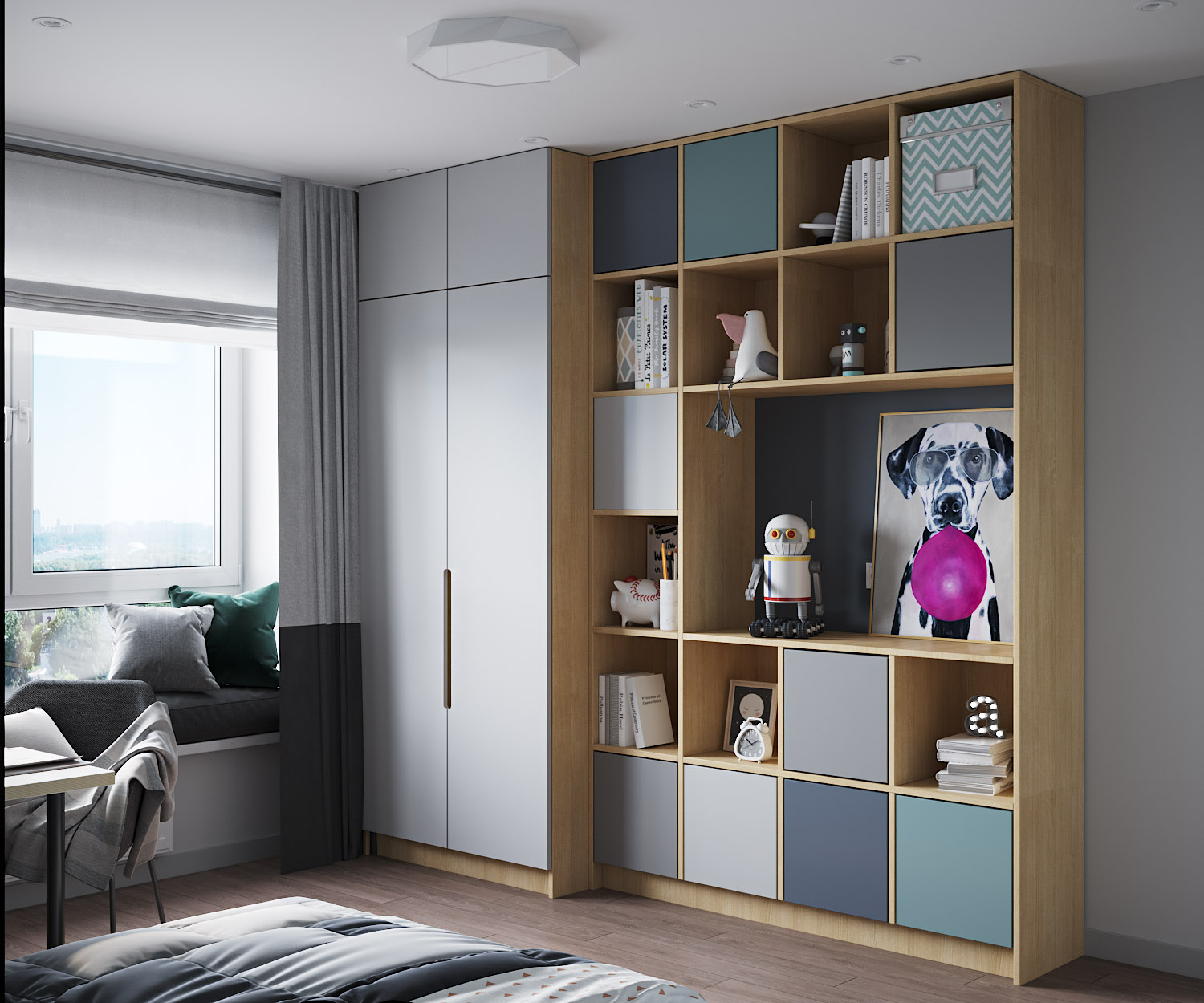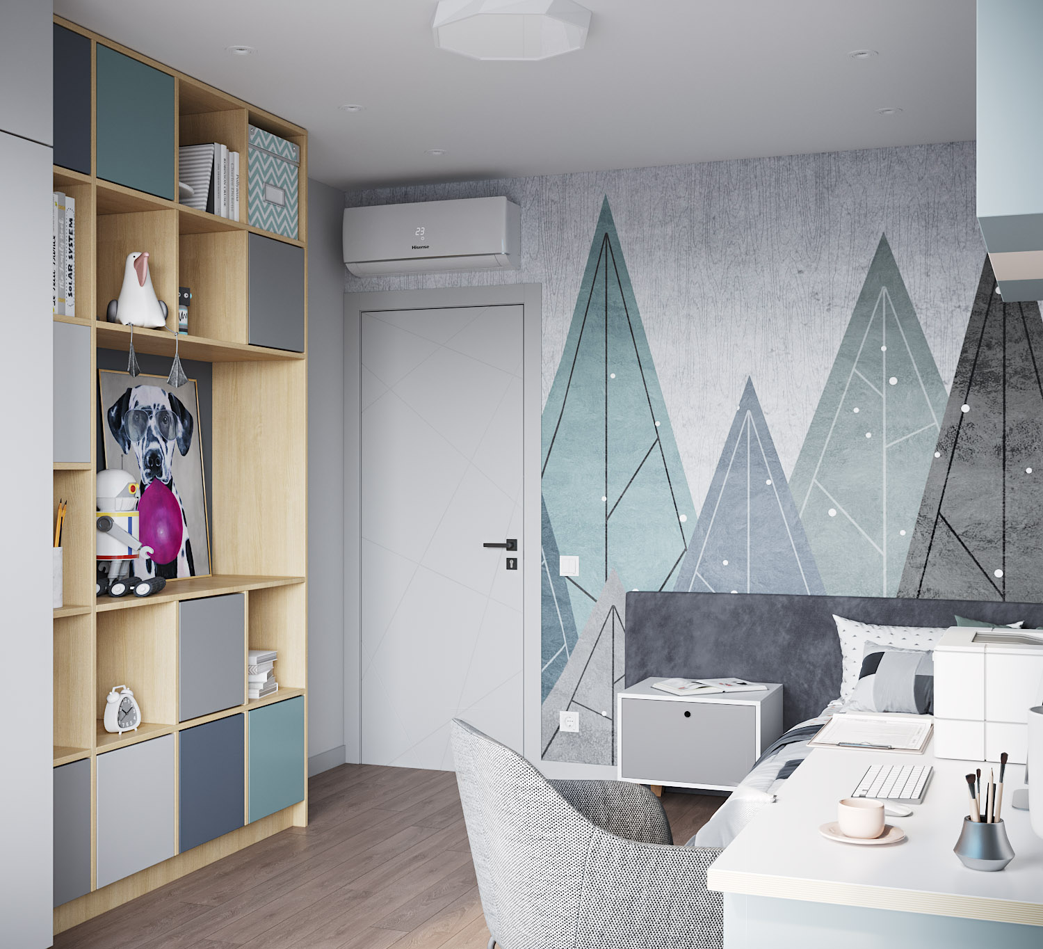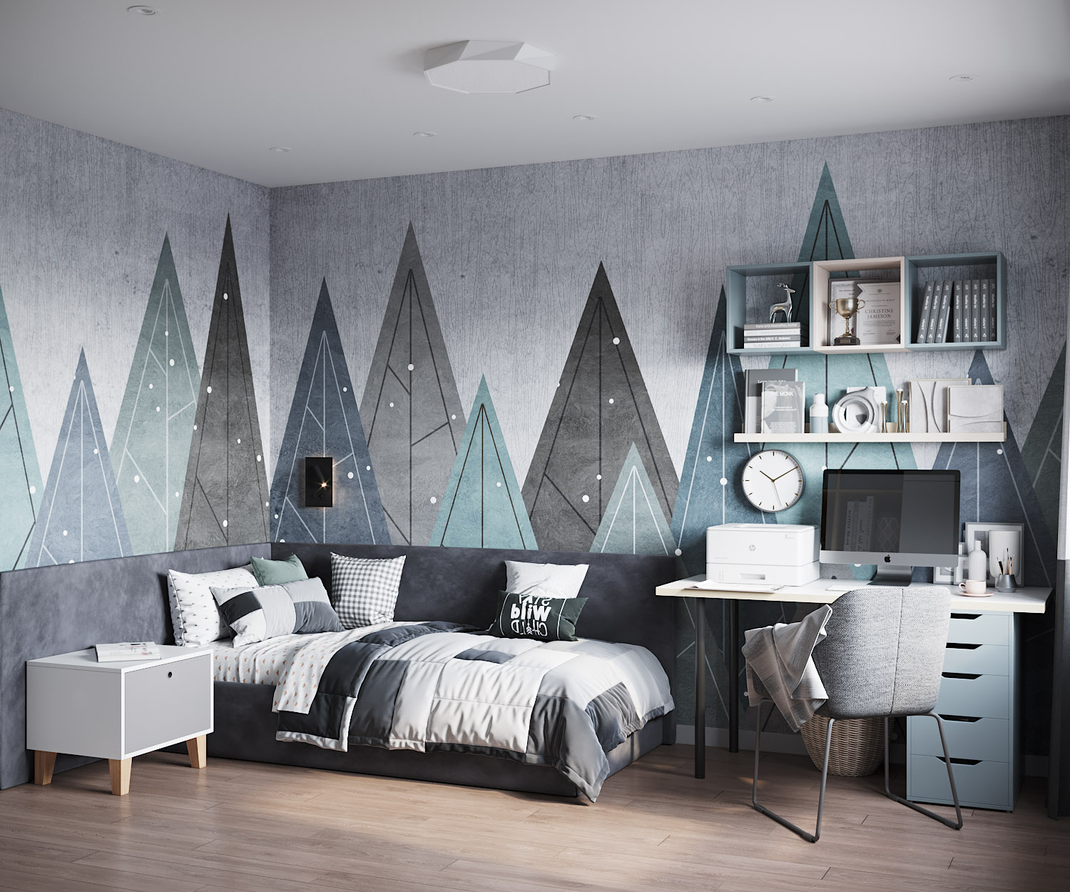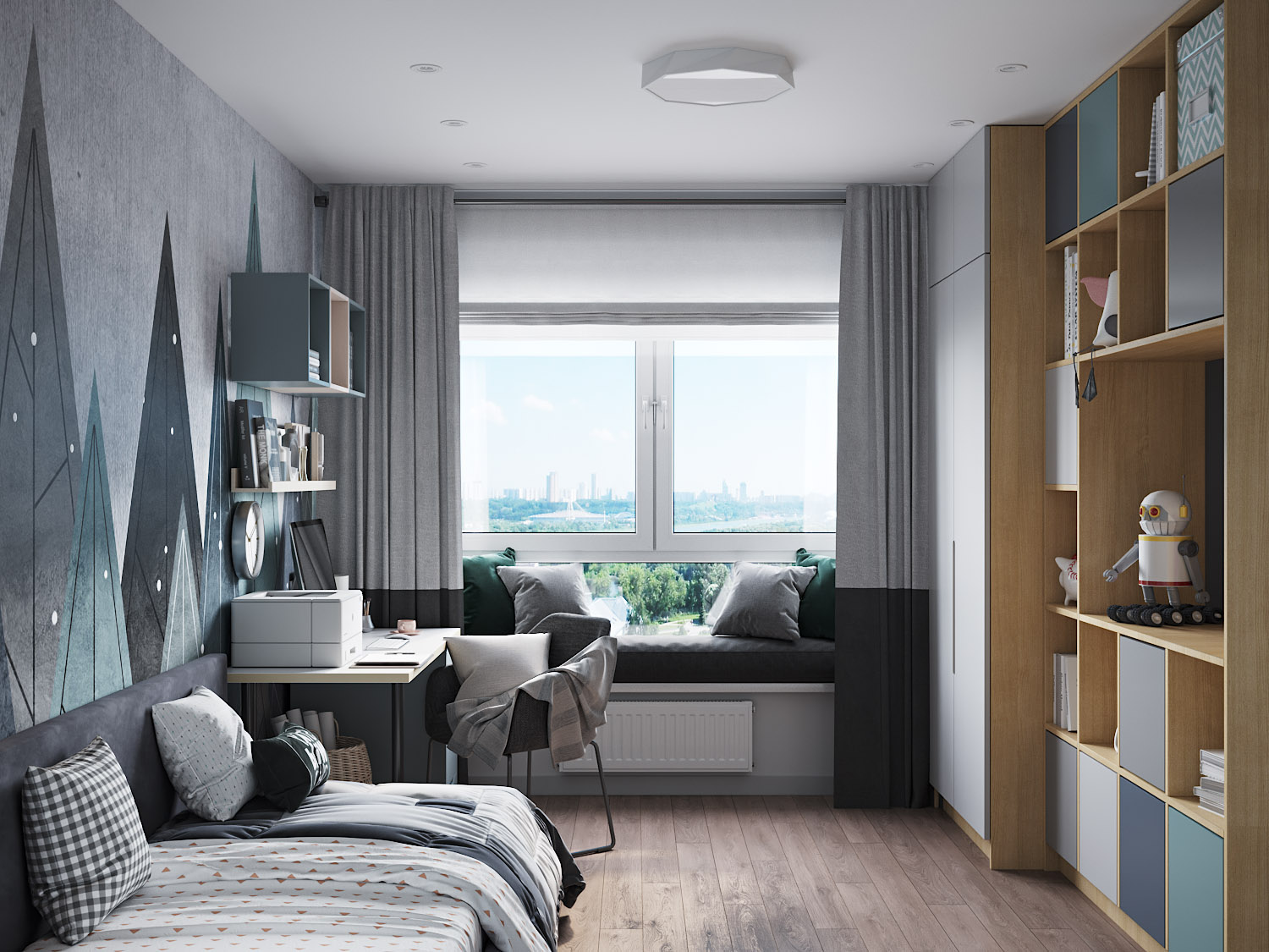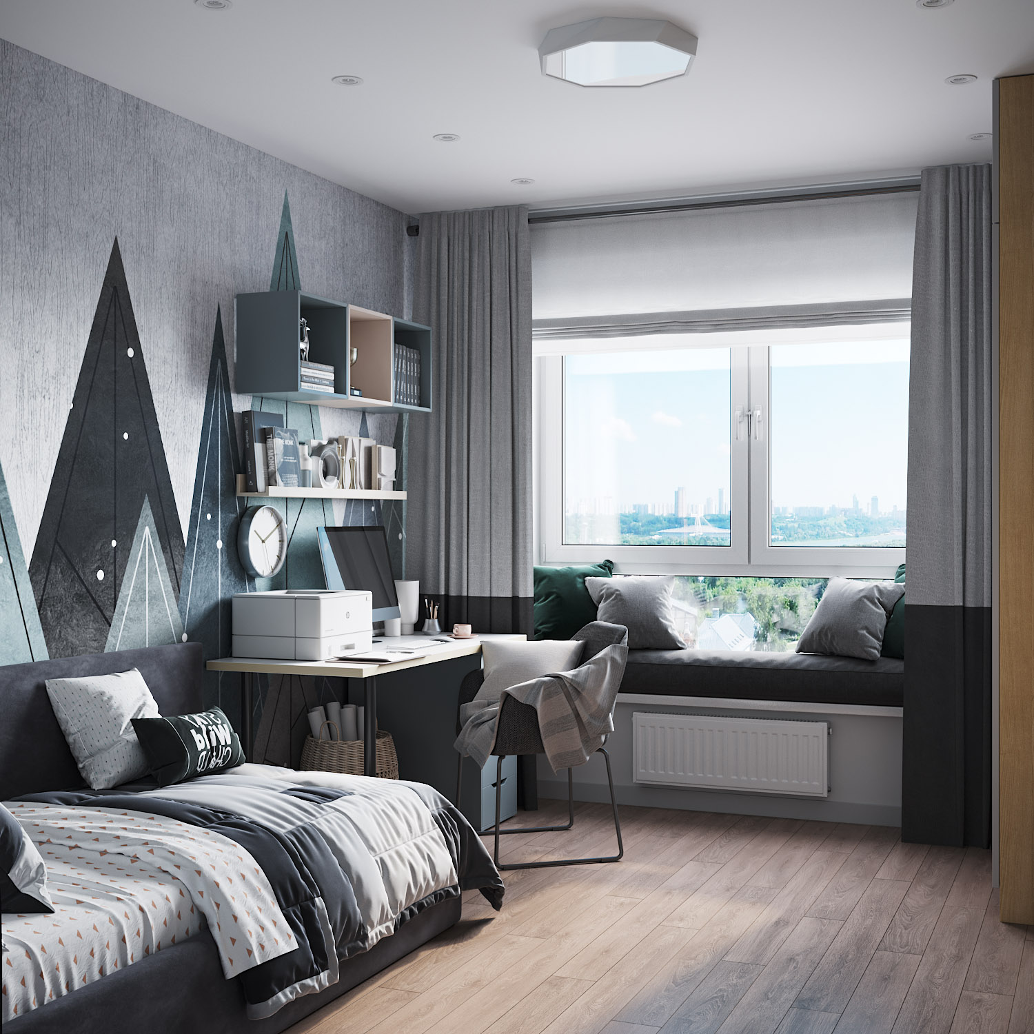 Детская для мальчика 10-12 лет. Современный спокойный интерьер для мальчика с приглушенными цветовыми акцентами. Эти горы из коллекции «Big Little» покорили сердце заказчиков в самом начале работы над проектом. У дизайнера даже не возникло идеи пробовать какой-то другой вариант. Картинка собралась сразу и была согласована без единой правки.