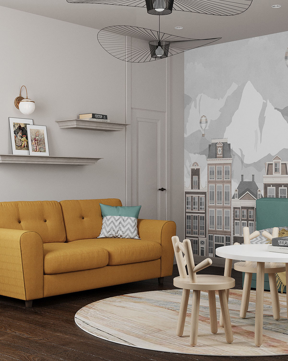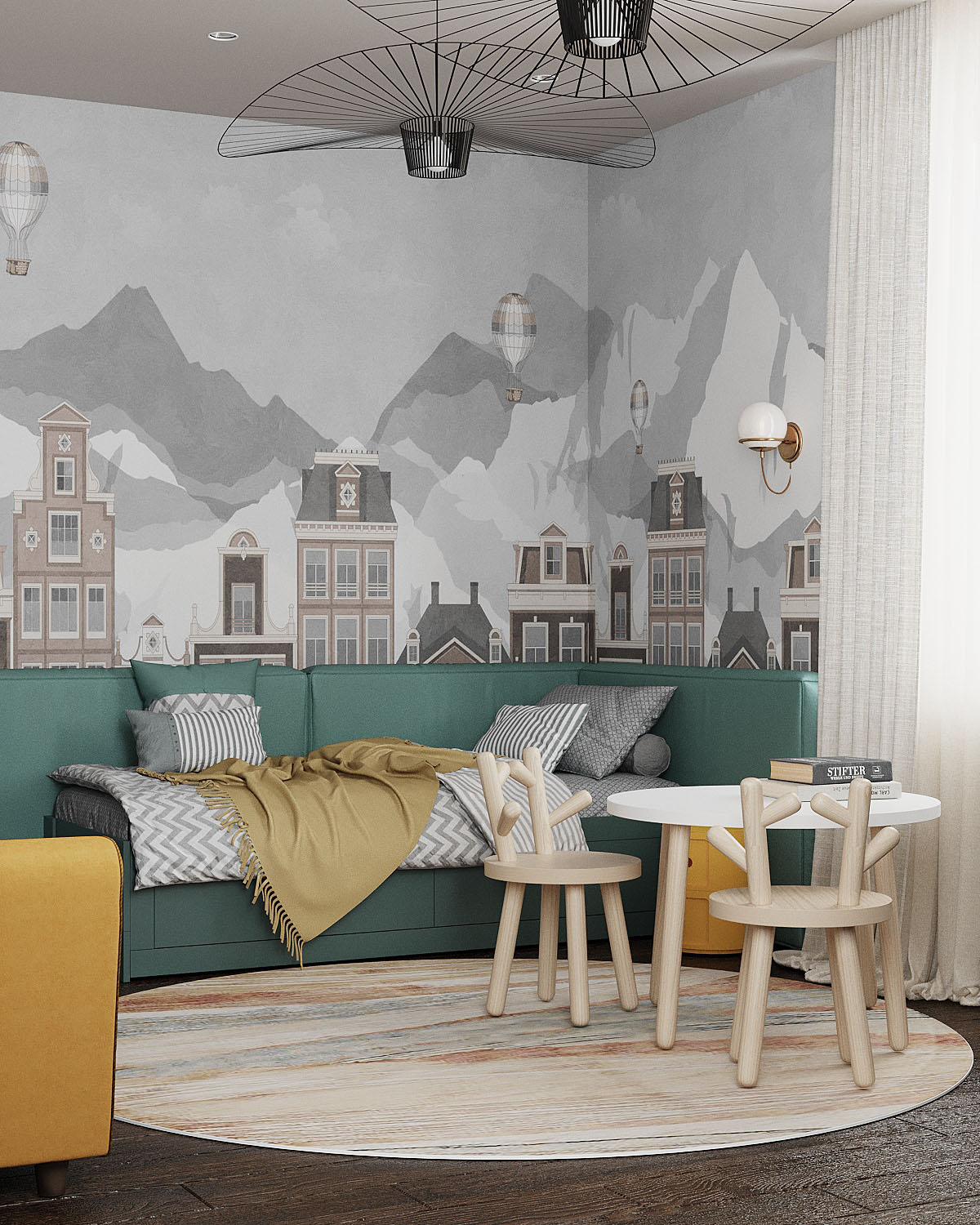 Детская комната из проекта дома для трех поколений. В этом доме будут проживать члены семьи практически всех возрастов: годовалая девочка, мальчик одиннадцати лет и юноша семнадцати лет, их родители и дедушка с бабушкой. Стиль дома условно приняли кантри-лофт, но он вобрал в себя намного больше элементов. Несмотря на свою эклектичность, проект получился очень уютным, гармоничным и харизматичным, как и его хозяева.