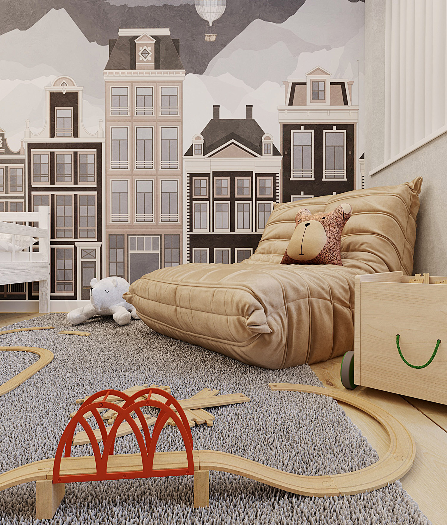 Дизайн детской комнаты для мальчика. Площадь помещения — 17,5 м². Обои из коллекции «Big Little». Изображение гор не только увеличивает пространство, делает комнату выше, но и влияет на подсознание. Если ребенок уже ходит в школу, горы будут стимулировать его к хорошей учебе и достижению успехов.