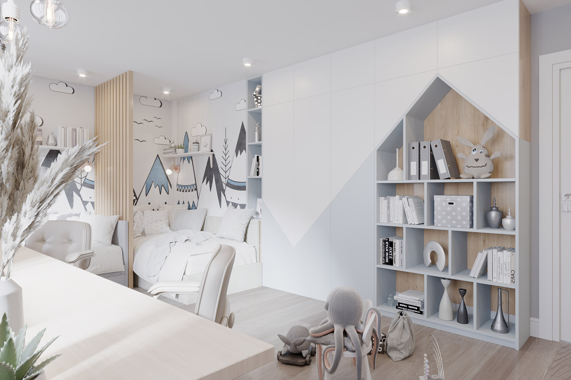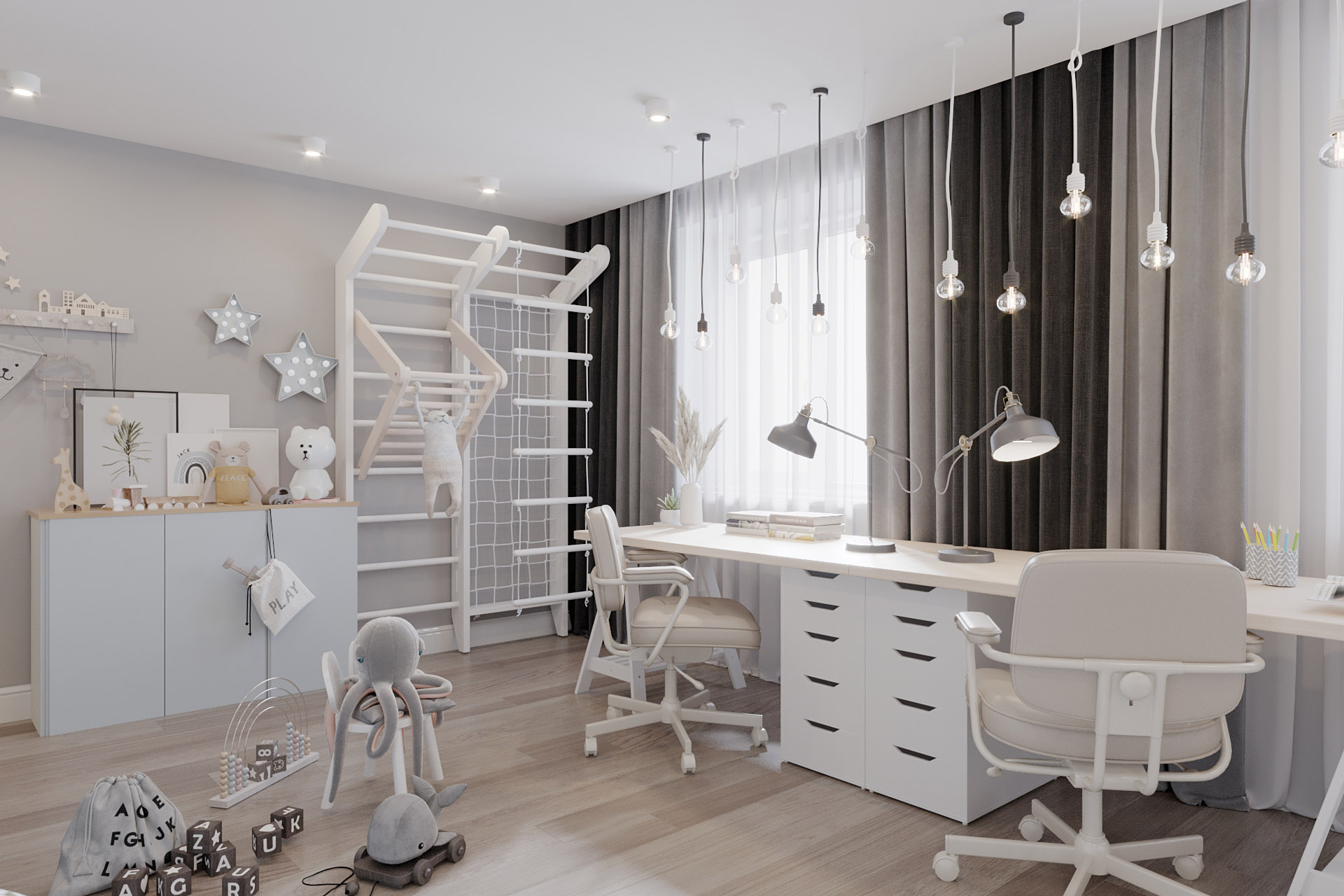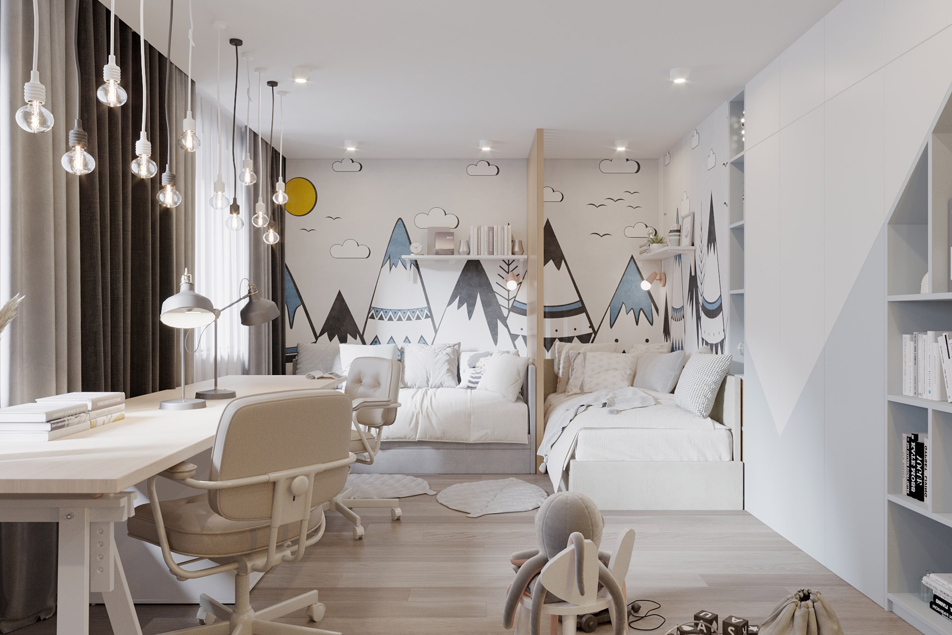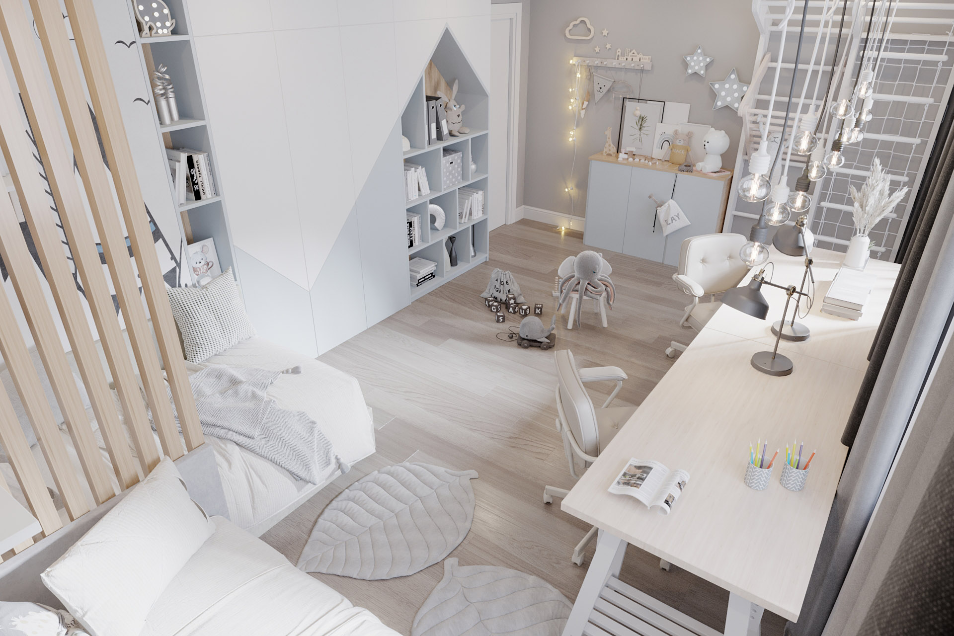 Проект для молодой семьи: родители и два сына, г. Белогорск. Площадь детской — 20 м². Комната для двух мальчиков. Здесь было важно разместить два полноценных спальных места, рабочий стол, шведскую стенку, платиновый шкаф для хранения одежды, открытые полки для книг, декора и игрушек, а также комод для игрушек. Спальные места разделены деревянной декоративной перегородкой.