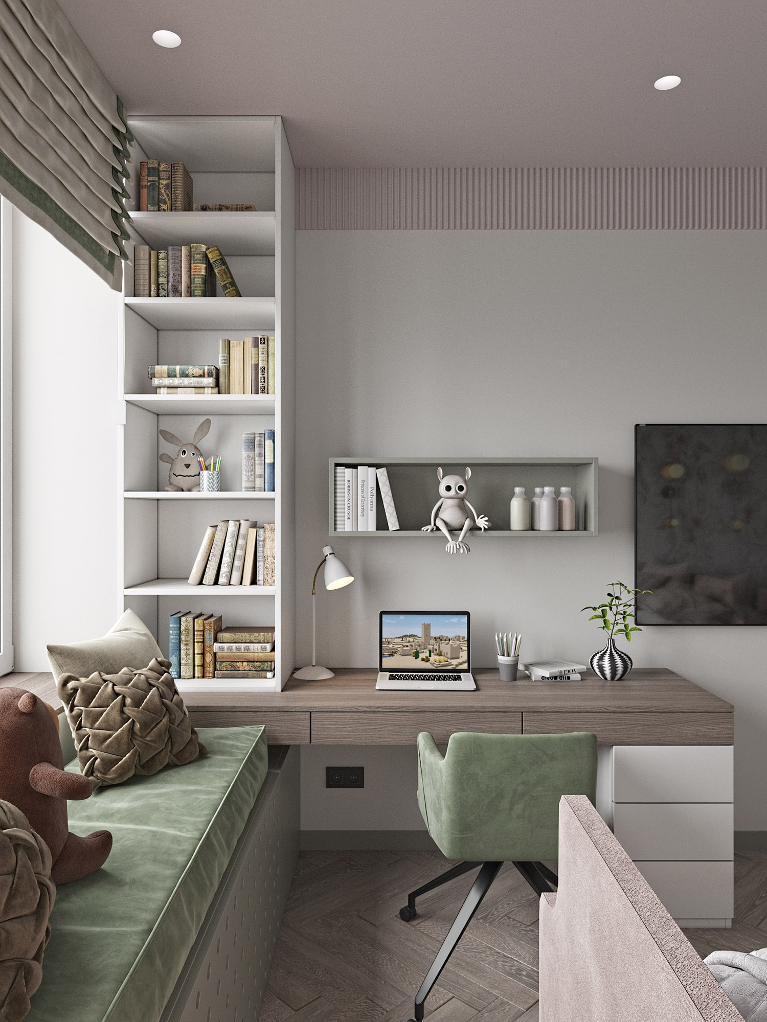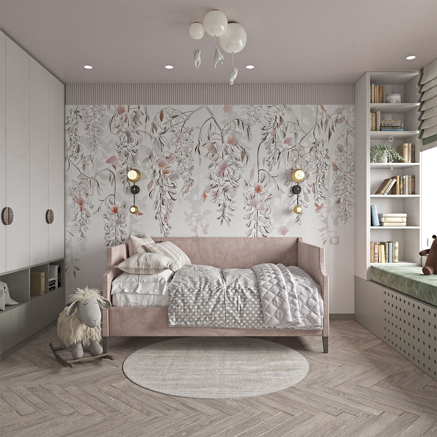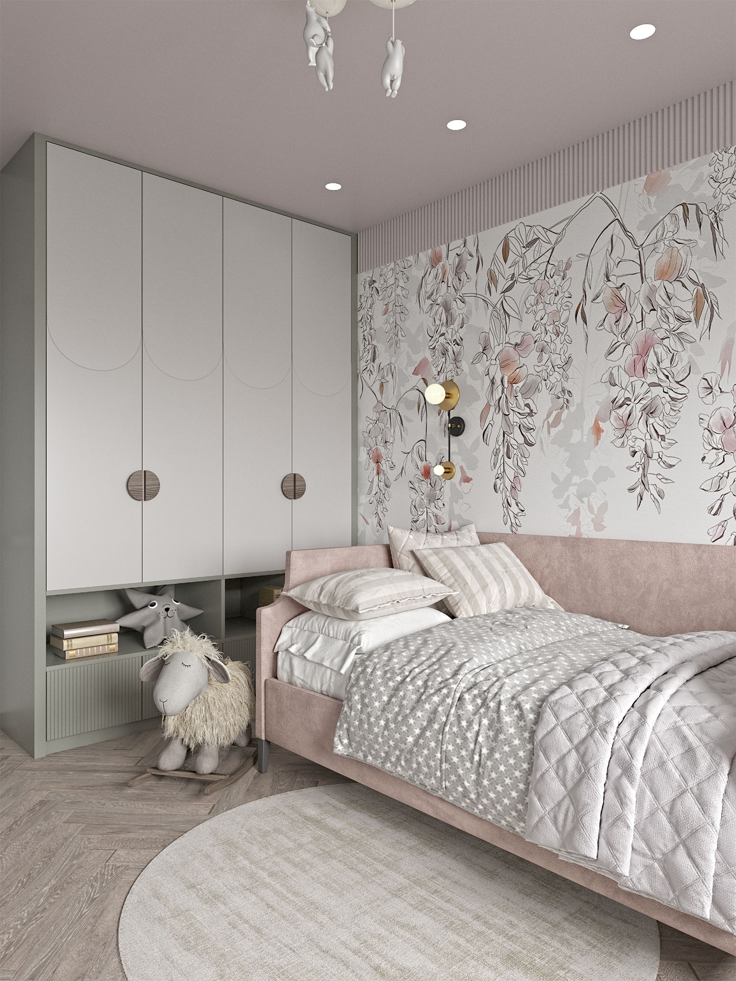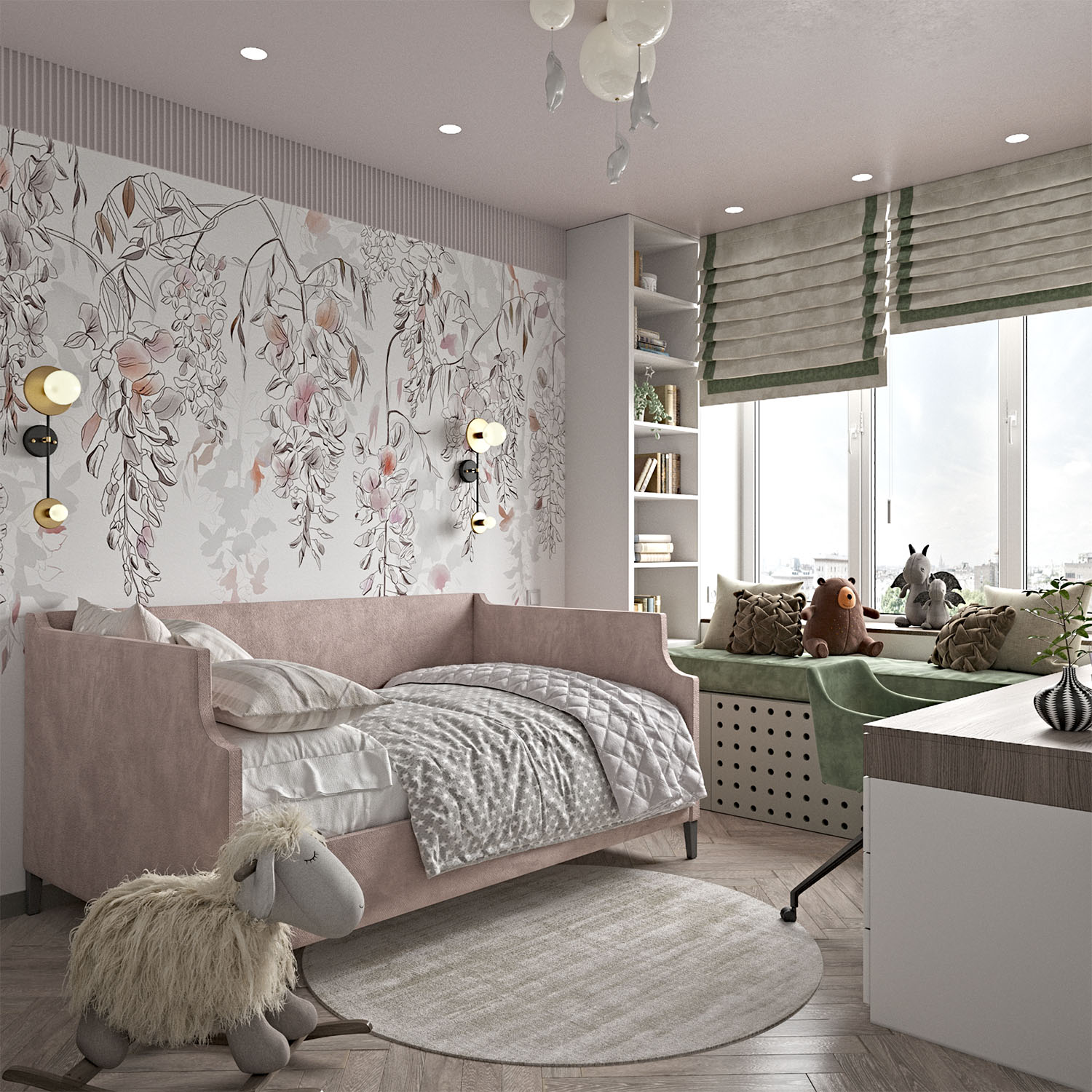 Проект детской комнаты для маленькой принцессы. Главными пожеланиями заказчиков были мягкая зона у окна, приятные нежные оттенки, места для хранения одежды и школьных принадлежностей и, конечно же, интерьер, который будет актуален не один год.
