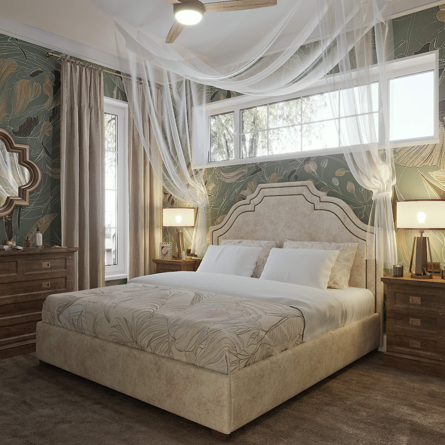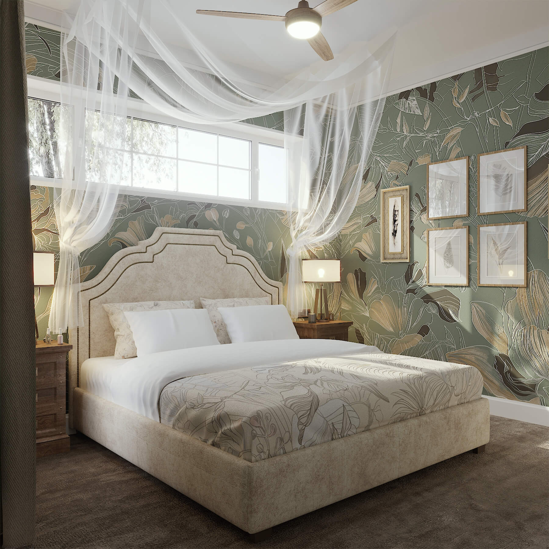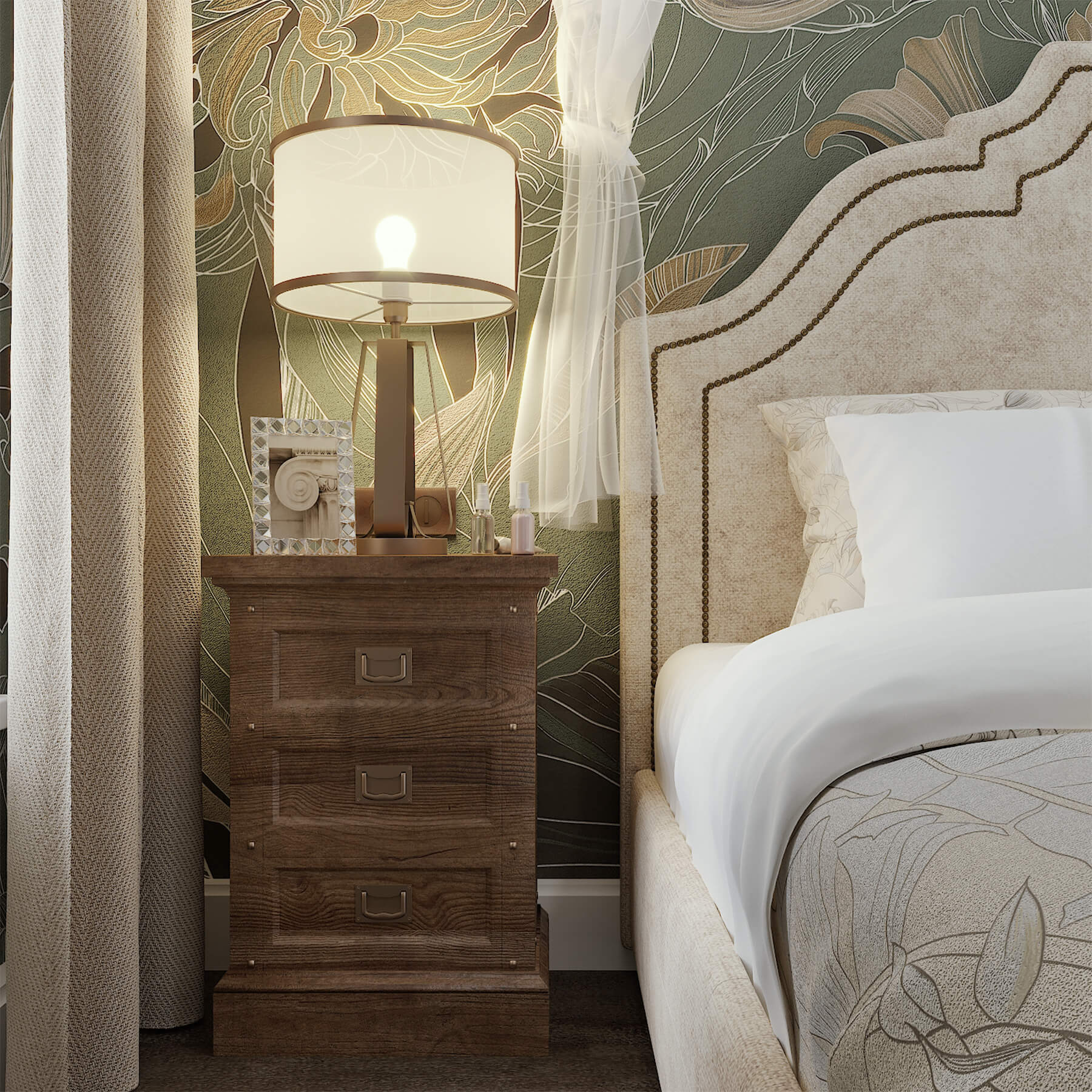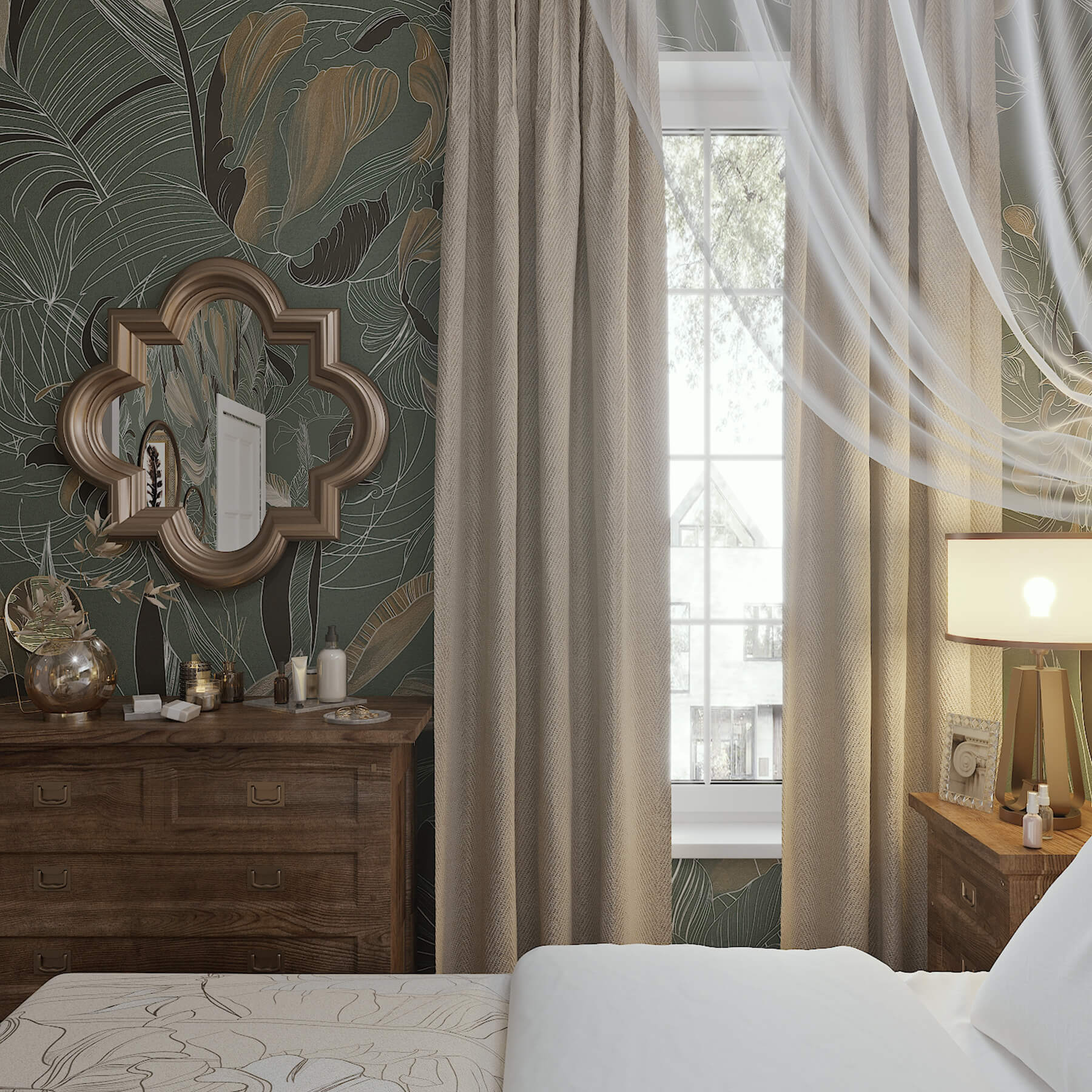 Благородный травянистый цвет и льняные шторы в сочетании с мягкой органзой и античным орехом. Обои из коллекции Blossom создают весенне-летнее настроение и придают пространству легкость.