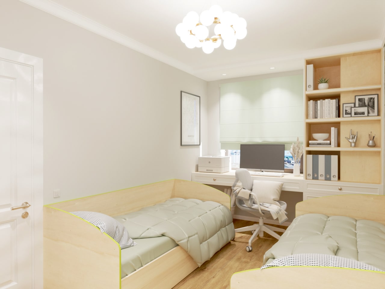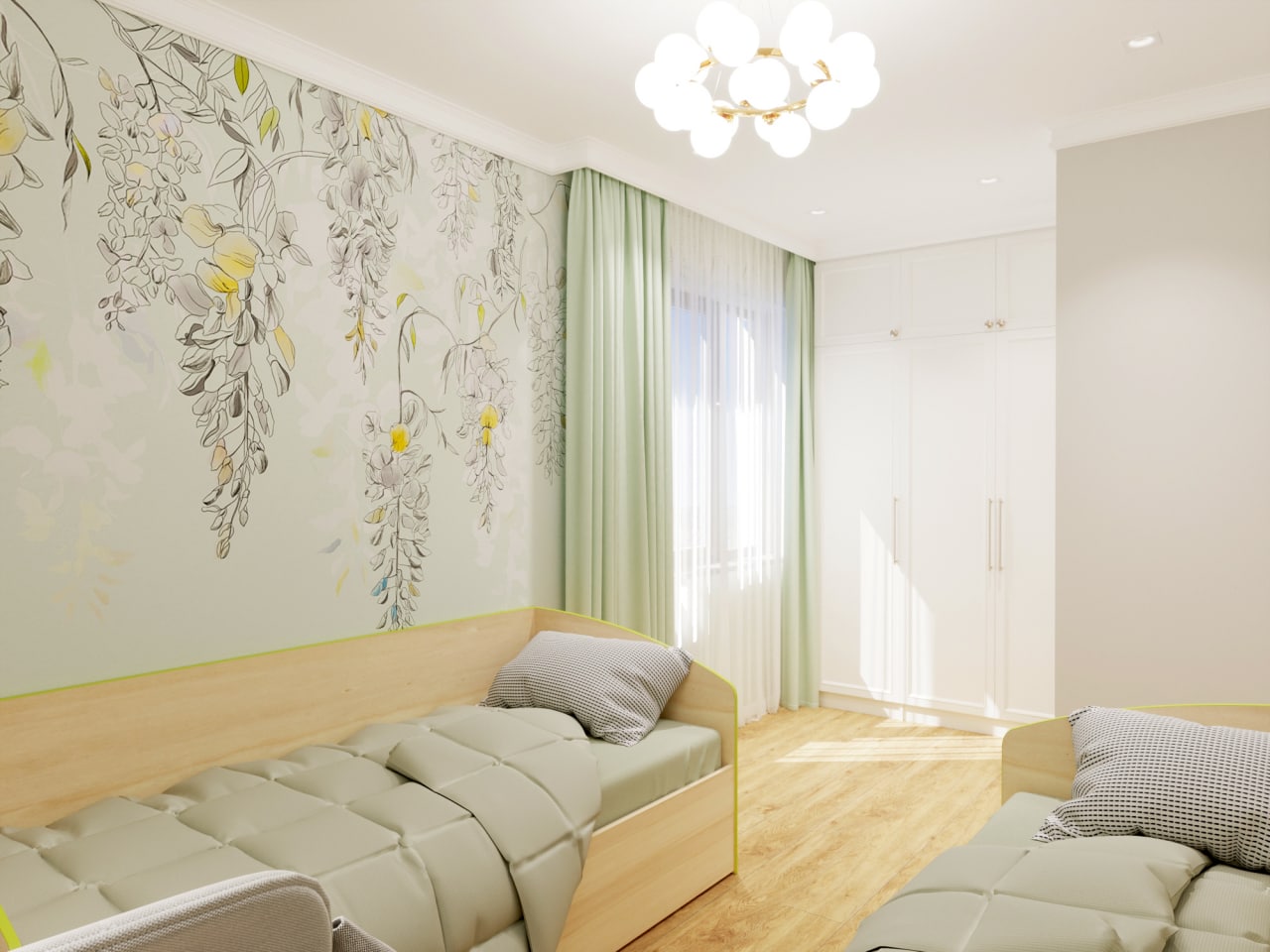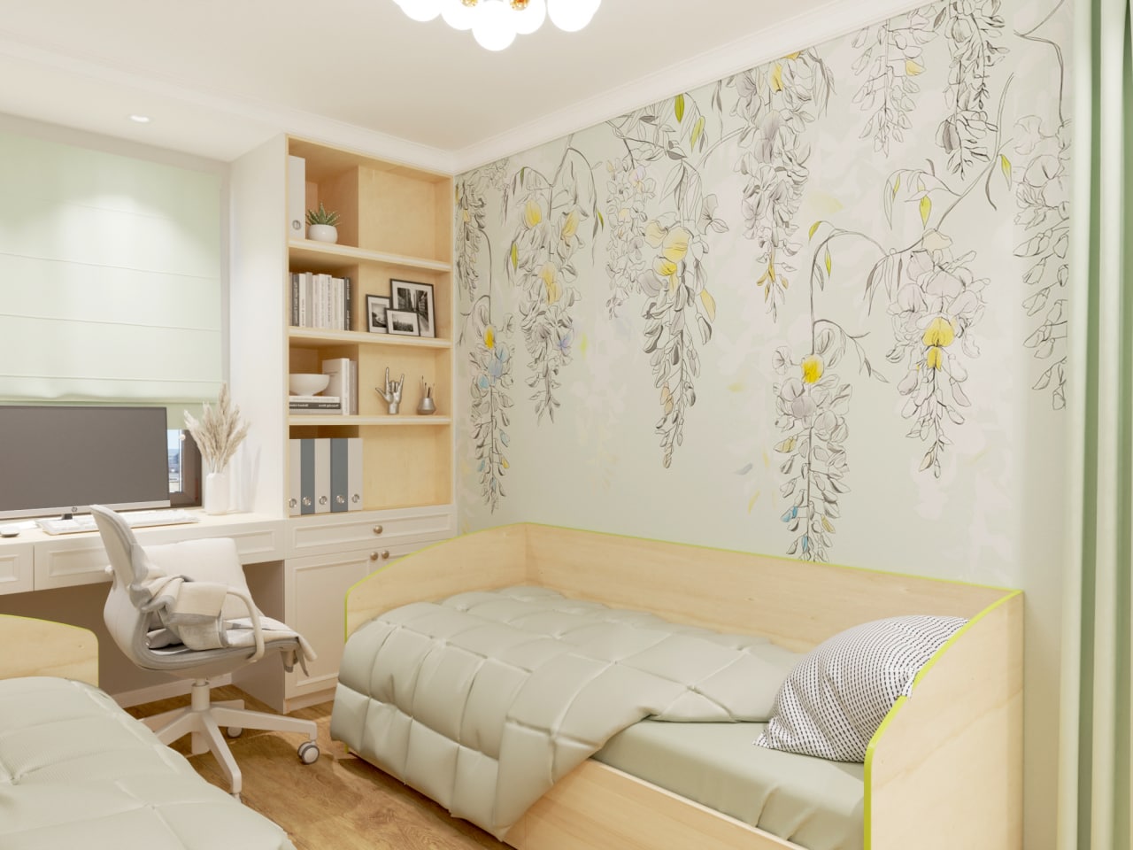 Спальня для двух девочек. Обои из коллекции BLOSSOM. Игра цвета создает весенне-летнее настроение и придает пространству легкость.
