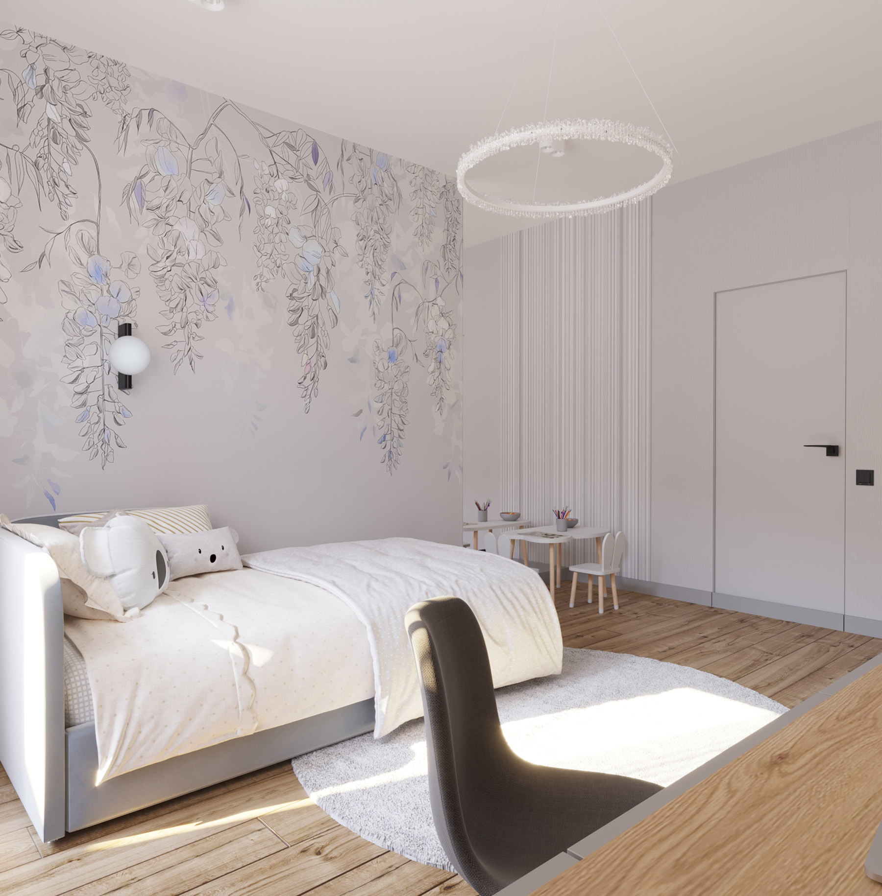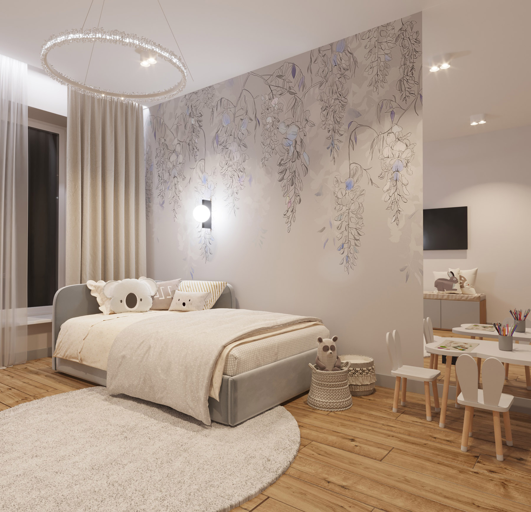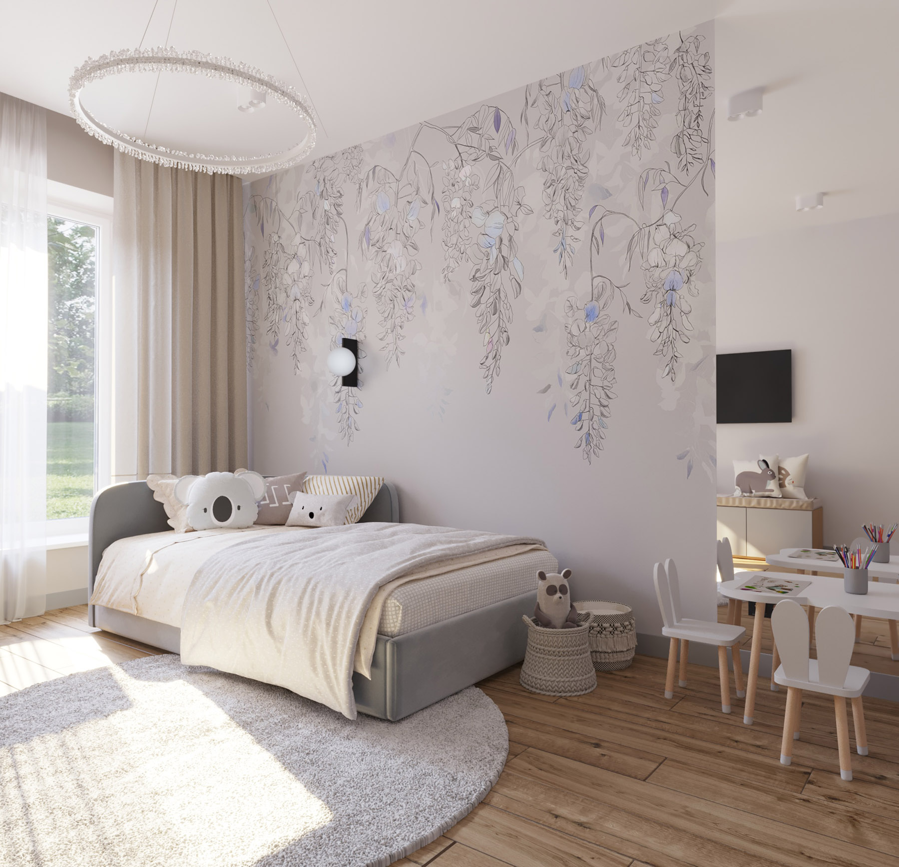 Частный дом, детская комната для девочки. Площадь комнаты 17 м². Интерьер выдержан в мягких спокойных тонах. Обои из коллекции «Blossom» добавляют женственности и точь-в-точь совпадают по тону с краской на стенах. Тем самым создается впечатление, что на стене авторская роспись.