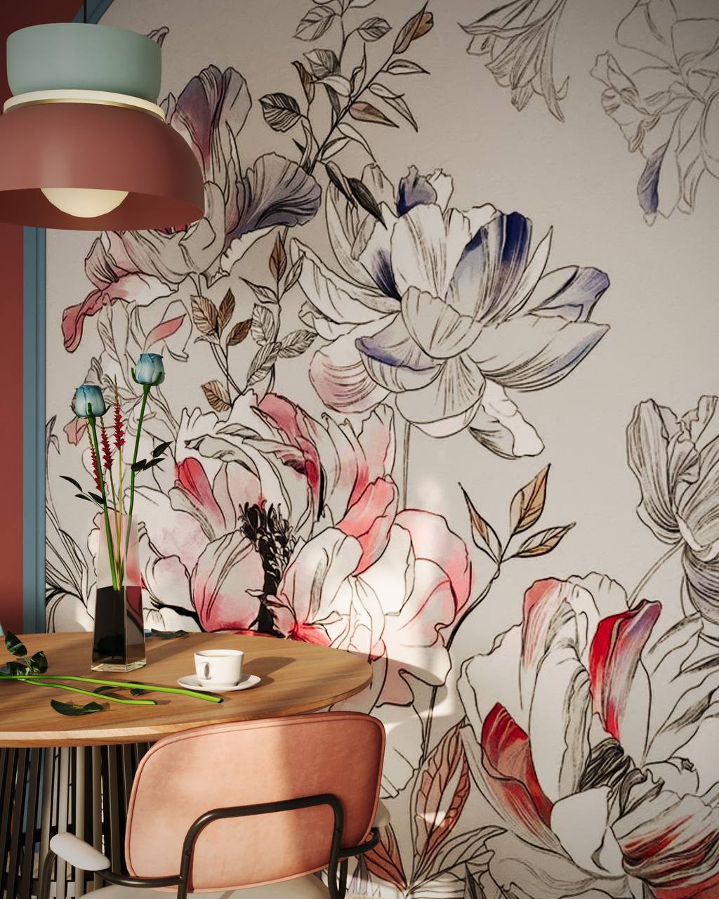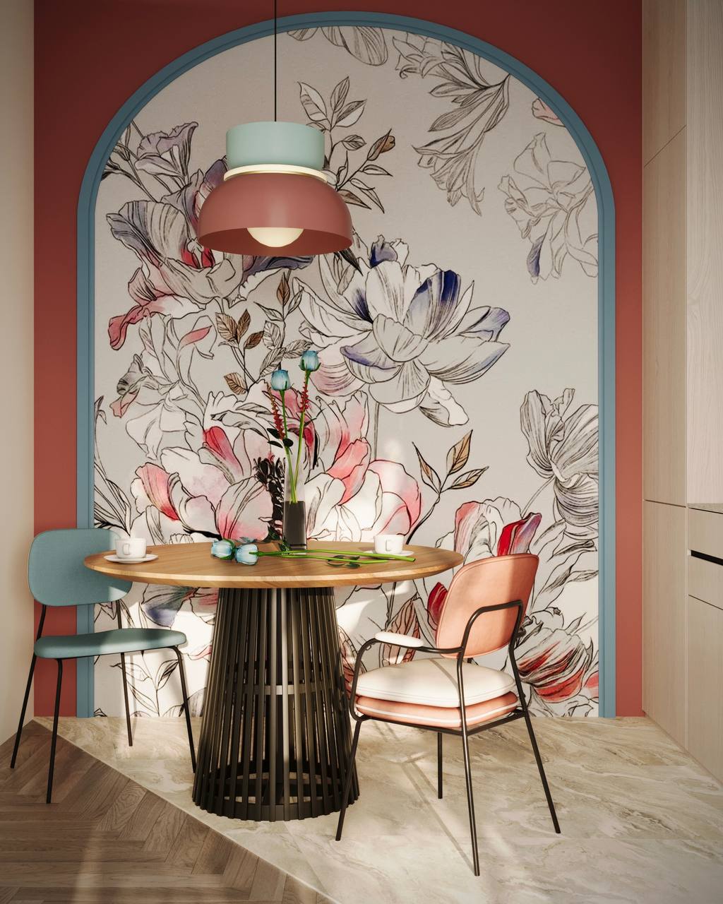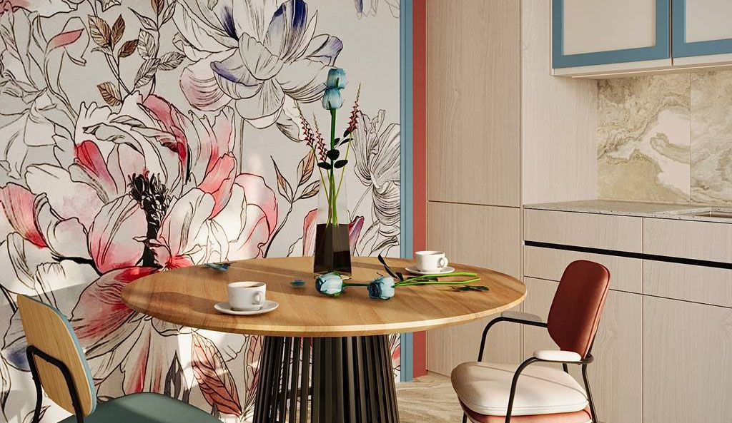Для оформления кухни в этом проекте заказчики выбрали обои из коллекции «BLOSSOM». Игра цвета создает весенне-летнее настроение и придает пространству легкость. Благодаря тому, что палитра сюжетов может быть как пестрой, так и монохромной, «BLOSSOM» выдерживает любые стили: и строгость кабинета, и яркость детской.