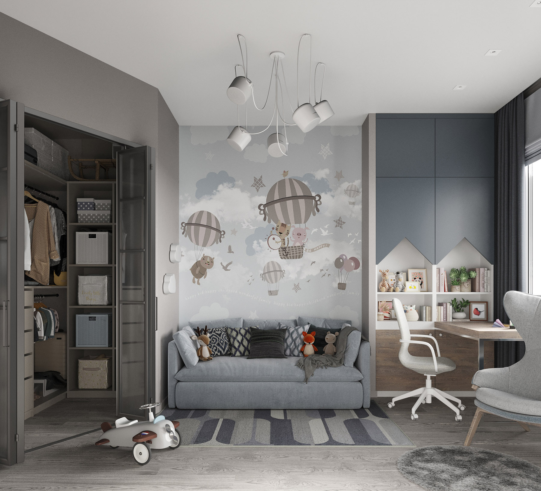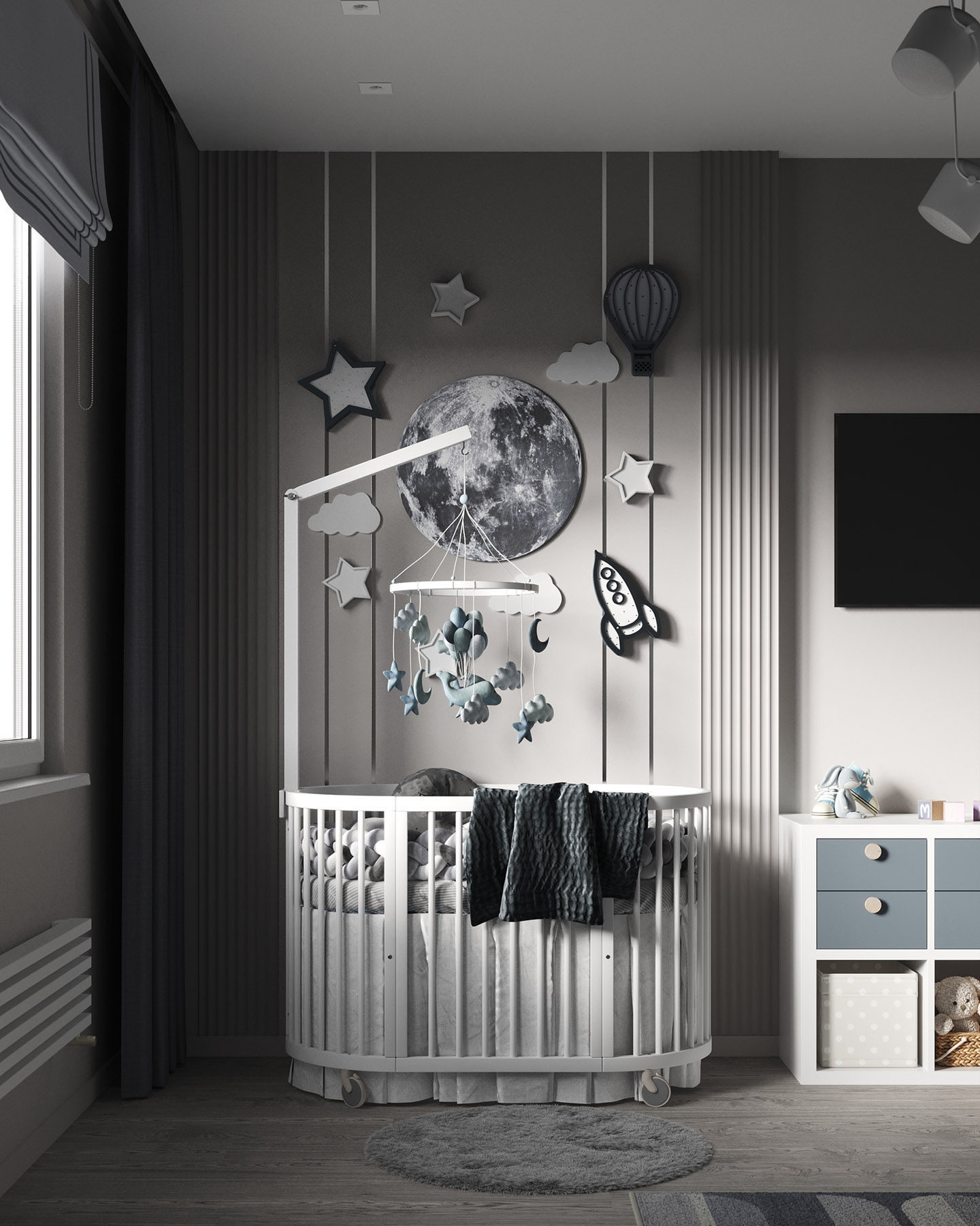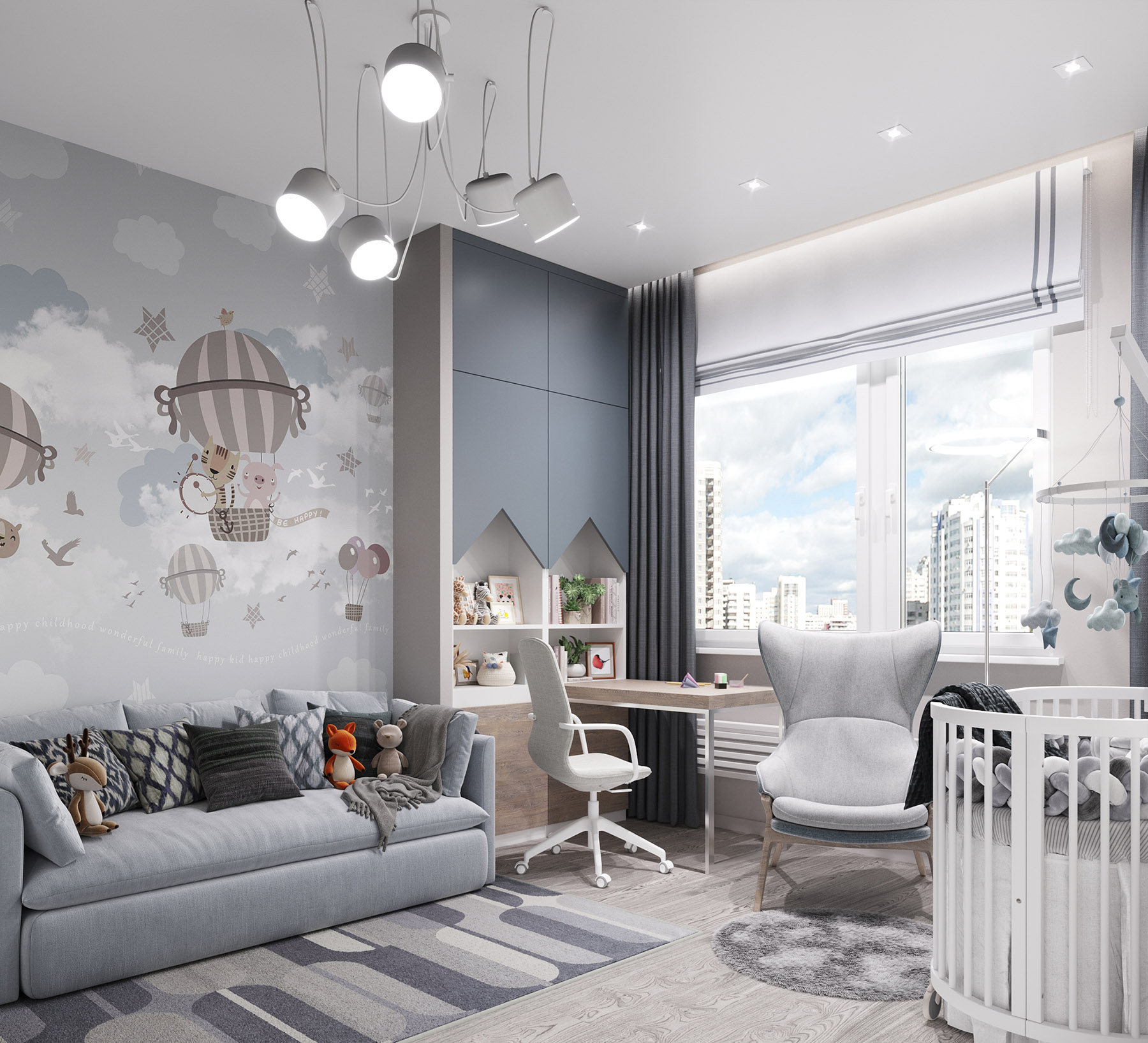 Проект для квартиры в ЖК HEadliner, Москва. Квартира для семьи с новорожденным ребенком. Детская площадью 14,5 м² + гардеробная 2,8 м². Из пожеланий было — возможность разместить детскую люльку с последующей заменой на кровать для ребенка и организовать хранение детских предметов (санки, велосипеды).