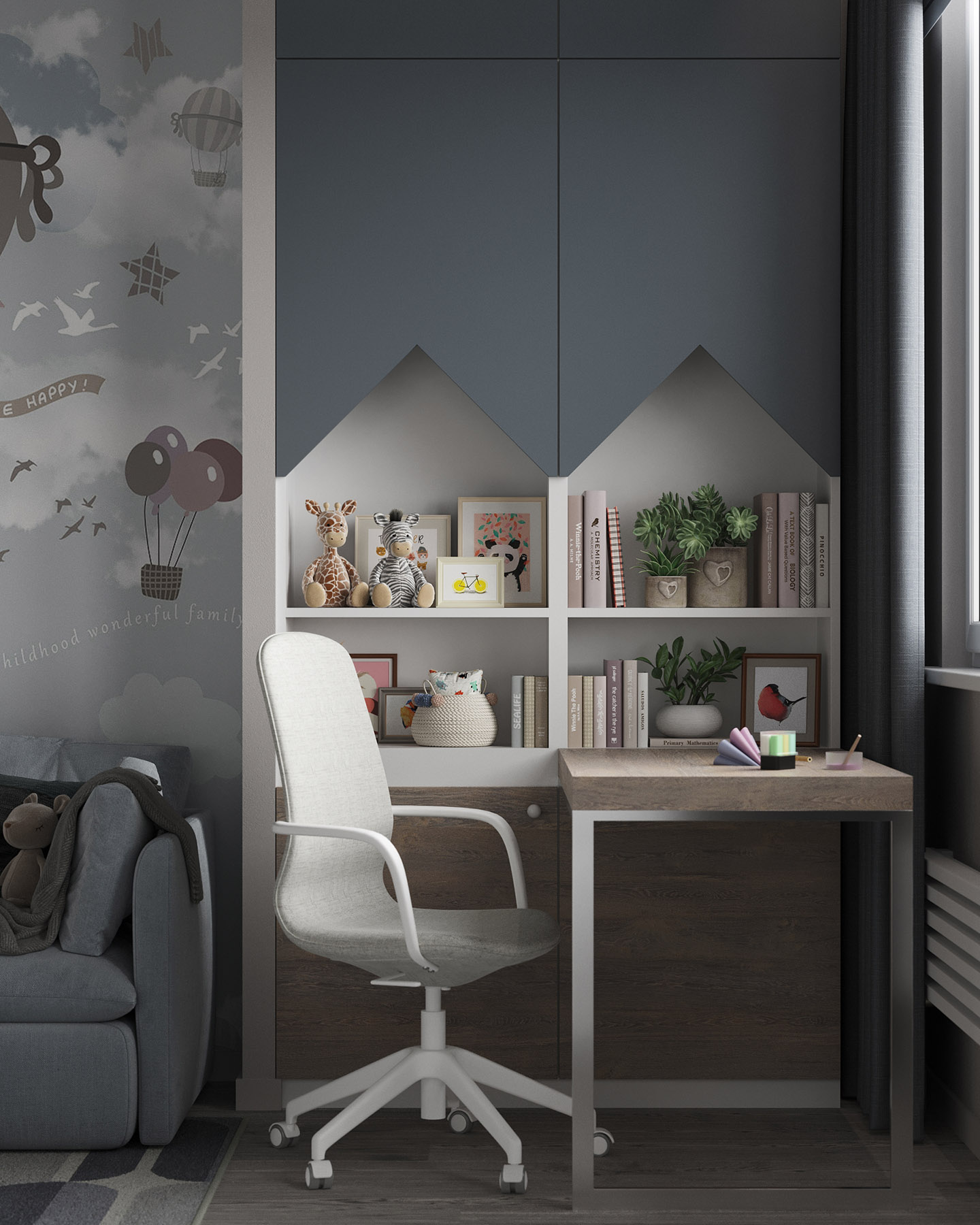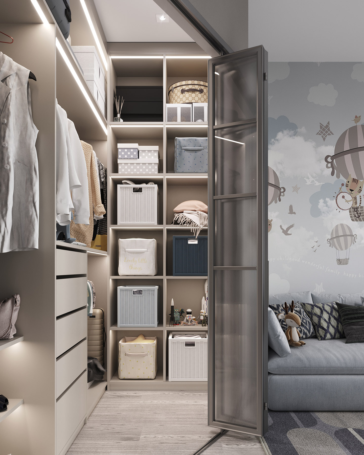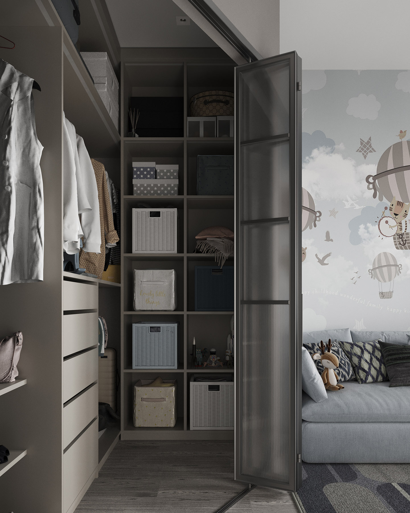 Проект для квартиры в ЖК HEadliner, Москва. Квартира для семьи с новорожденным ребенком. Детская площадью 14,5 м² + гардеробная 2,8 м². Из пожеланий было — возможность разместить детскую люльку с последующей заменой на кровать для ребенка и организовать хранение детских предметов (санки, велосипеды).