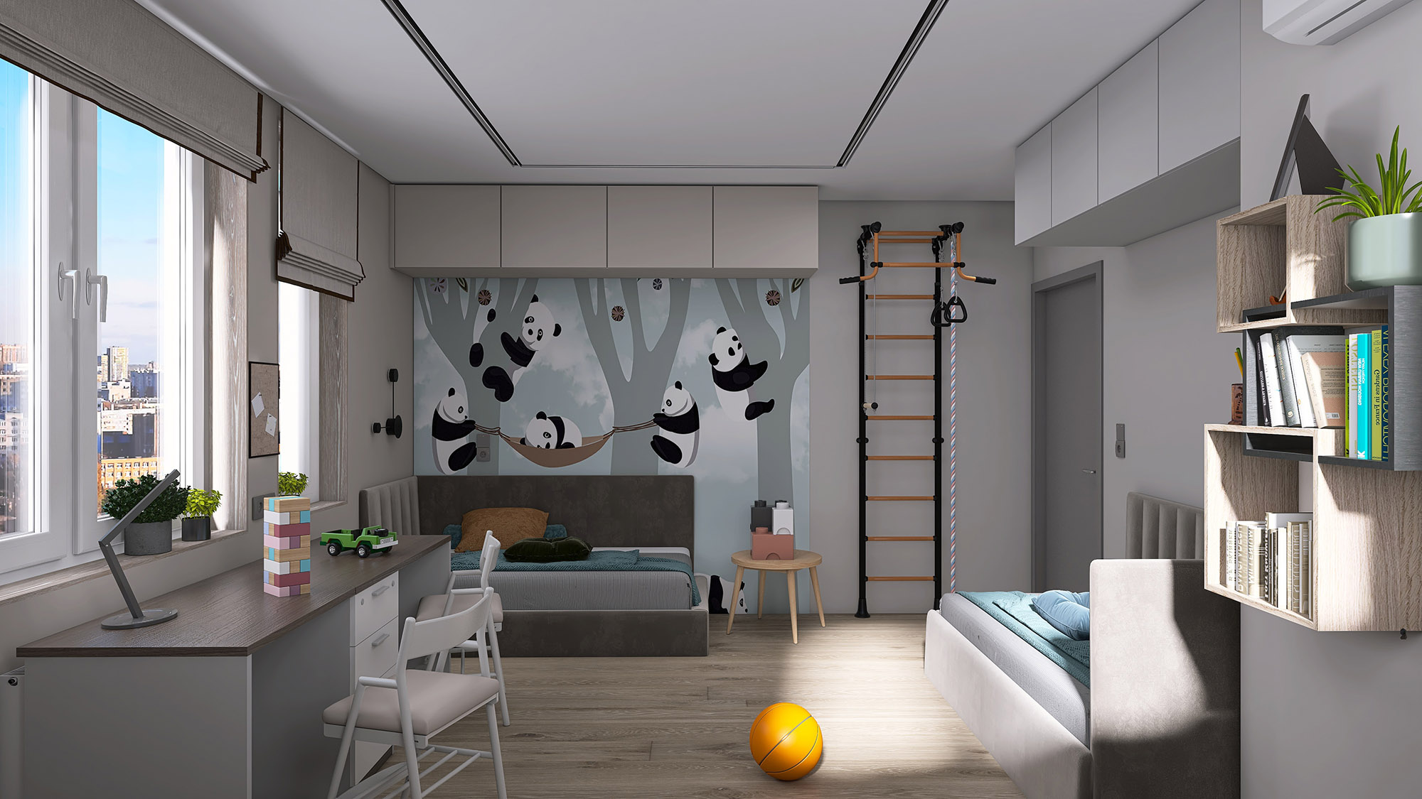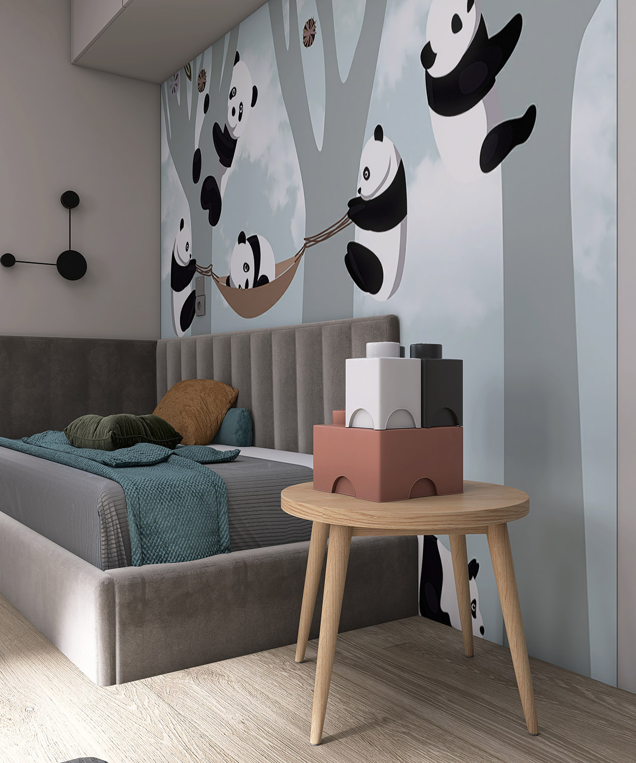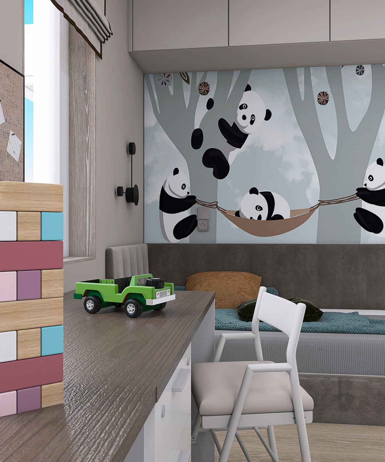 Один из мальчишек очень любит панд, поэтому они и стали лейт-мотивом украшения комнаты и акцентным украшением стен в виде обоев. По их размерам не трудно догадаться, какой паренёк является поклонником панд, а какой лишь поддерживает увлечение брата.