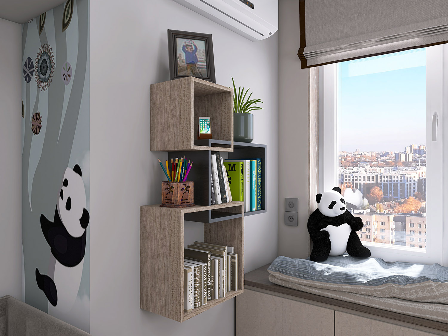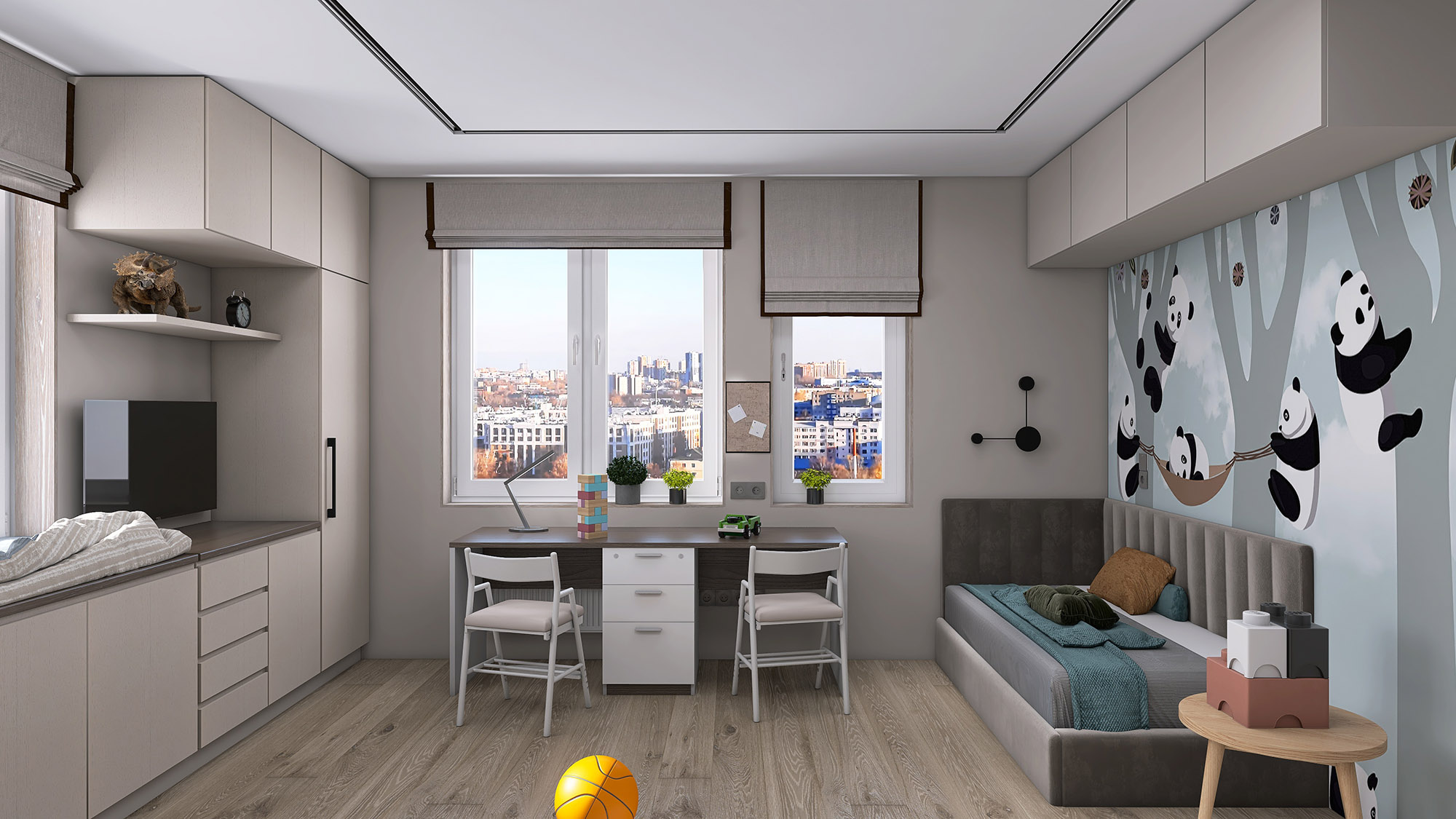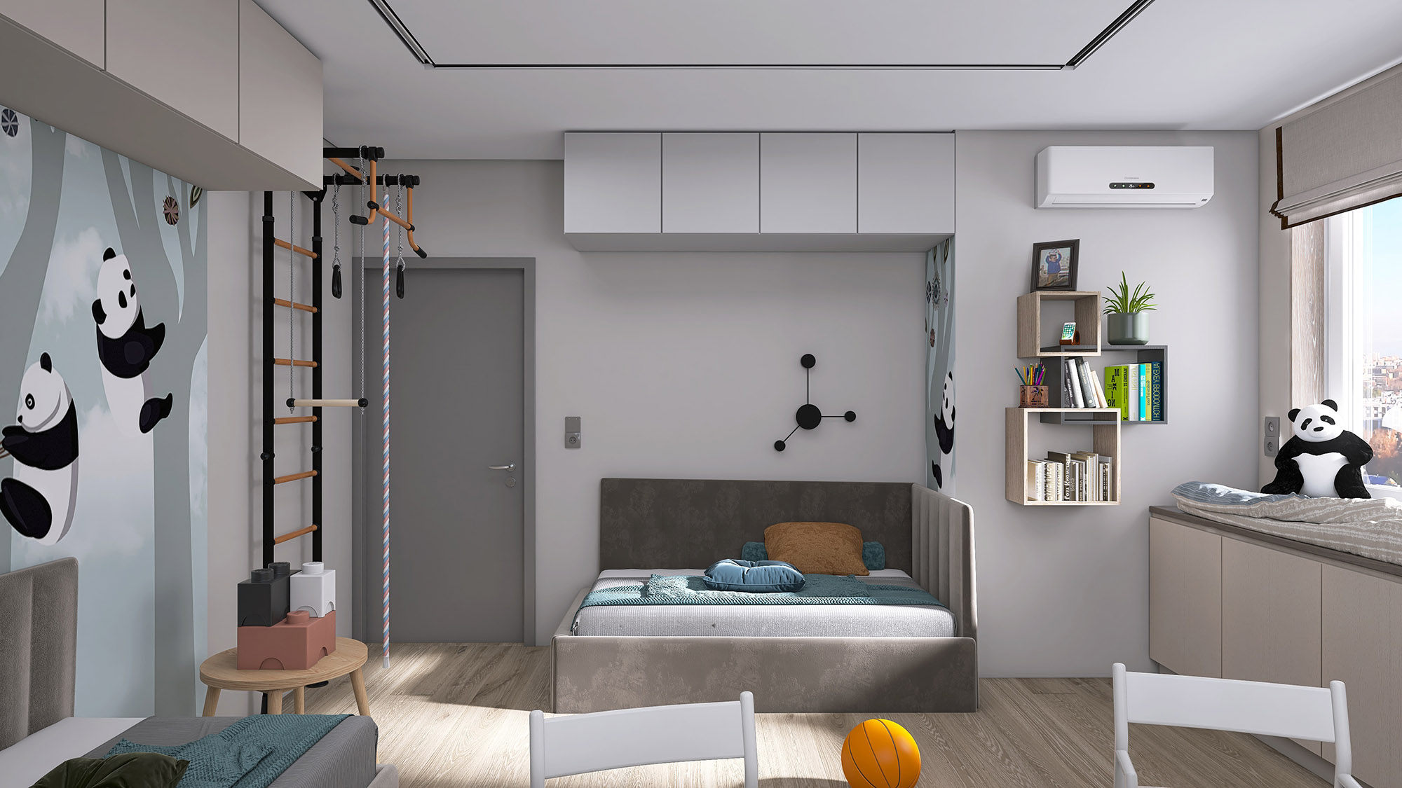 Один из мальчишек очень любит панд, поэтому они и стали лейт-мотивом украшения комнаты и акцентным украшением стен в виде обоев. По их размерам не трудно догадаться, какой паренёк является поклонником панд, а какой лишь поддерживает увлечение брата.