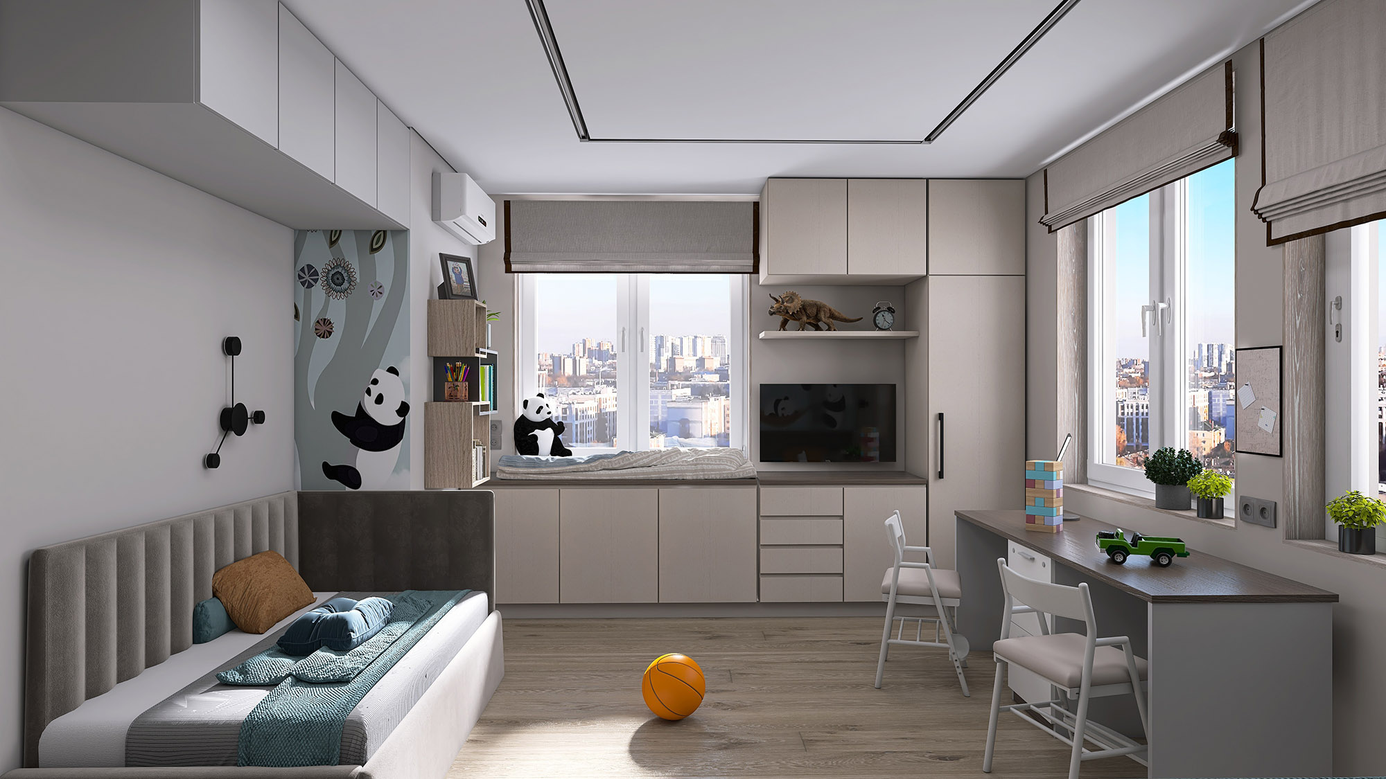 Заказчики хотели разместить большое количество игрушек, поэтому задачей номер один было организовать много мест хранения. Мальчики спортивные, поэтому наличие спортивного уголка было обязательным. Подоконник и красивый вид из окна использовали как место отдыха сверху и место хранения в виде шкафчиков снизу. Вентиляционная решётка в столешнице поможет циркуляции тёплого воздуха от радиатора.