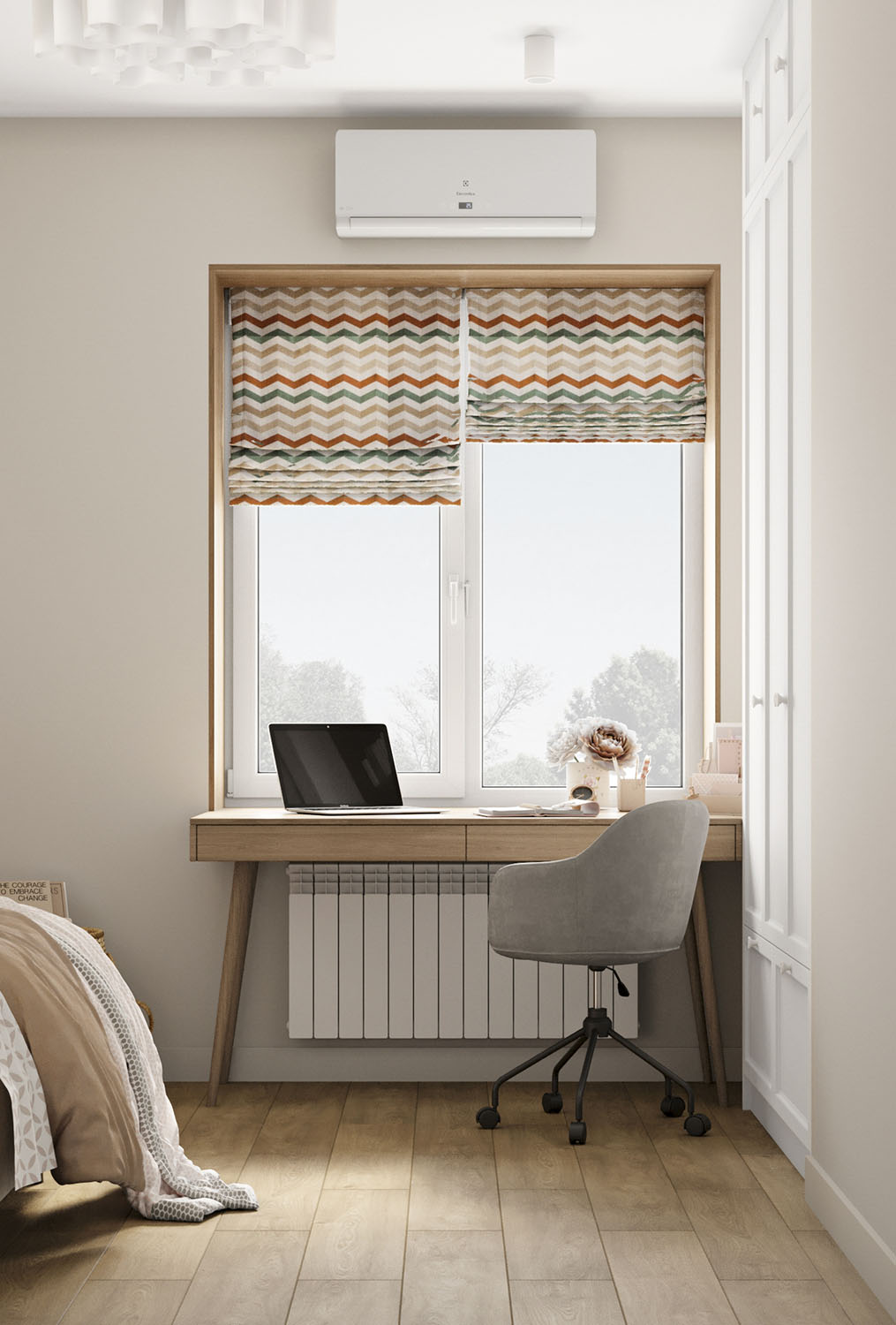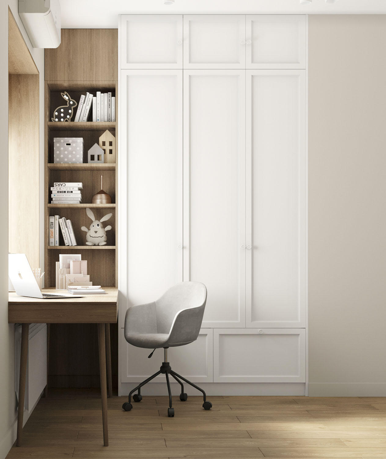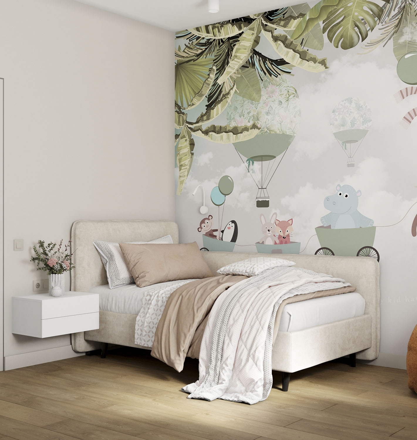 Детская в доме-дуплексе, г. Омск. Площадь комнаты — 12 м². Проект был выполнен для семьи, у которой есть двенадцатилетняя дочь и планируется появление малыша. Основным требованием для детской второго ребёнка был уютный и спокойный интерьер, а также необходимо было предусмотреть элементы мебели «на вырост»: рабочий стол у окна, полноразмерную кровать и объёмный встроенный шкаф. Характер комнате придаёт фреска из коллекции BON VOYAGE.
