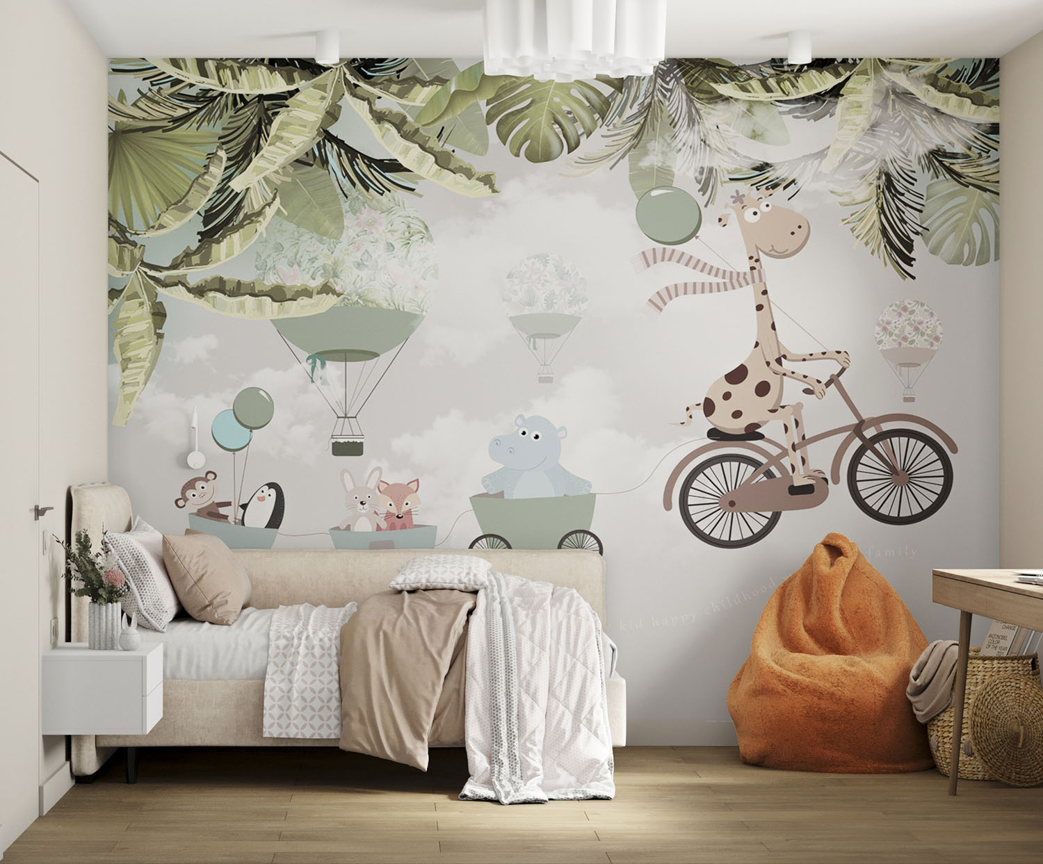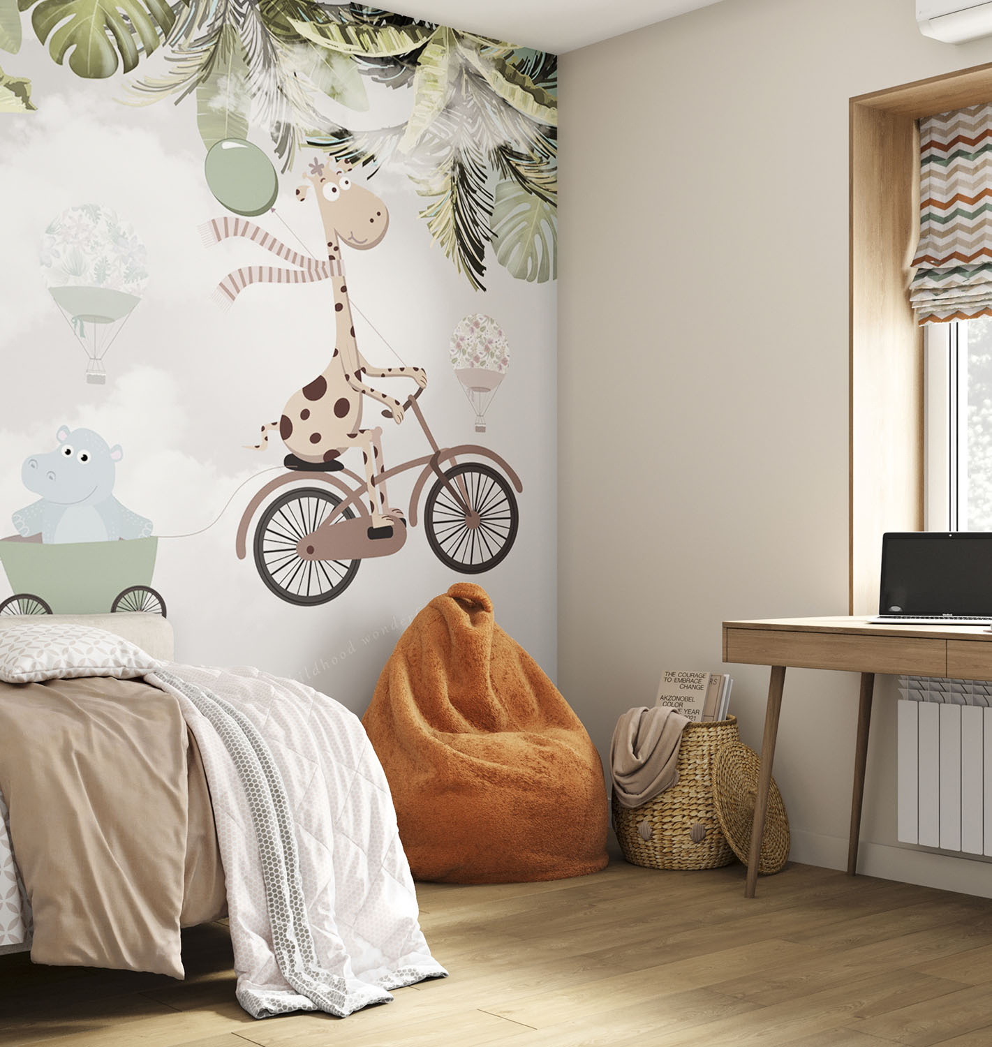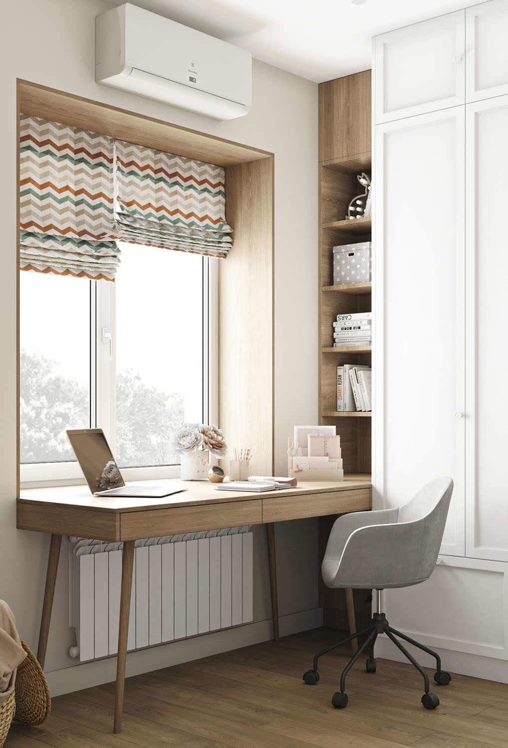 Детская в доме-дуплексе, г. Омск. Площадь комнаты — 12 м². Проект был выполнен для семьи, у которой есть двенадцатилетняя дочь и планируется появление малыша. Основным требованием для детской второго ребёнка был уютный и спокойный интерьер, а также необходимо было предусмотреть элементы мебели «на вырост»: рабочий стол у окна, полноразмерную кровать и объёмный встроенный шкаф. Характер комнате придаёт фреска из коллекции BON VOYAGE.