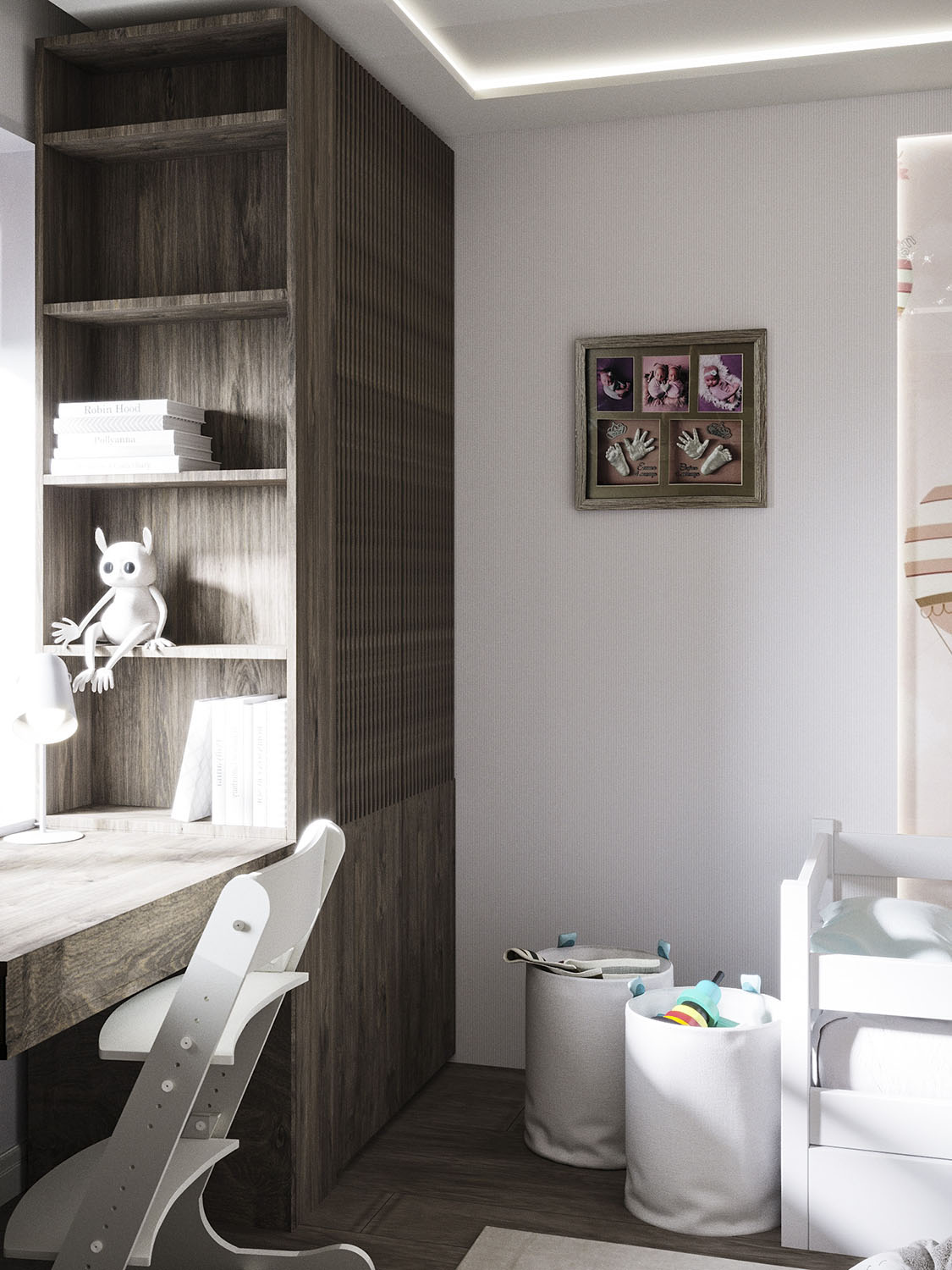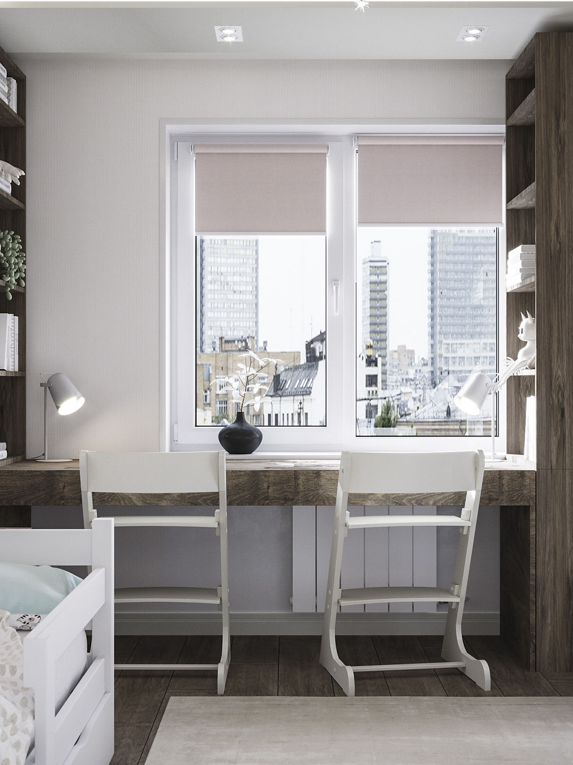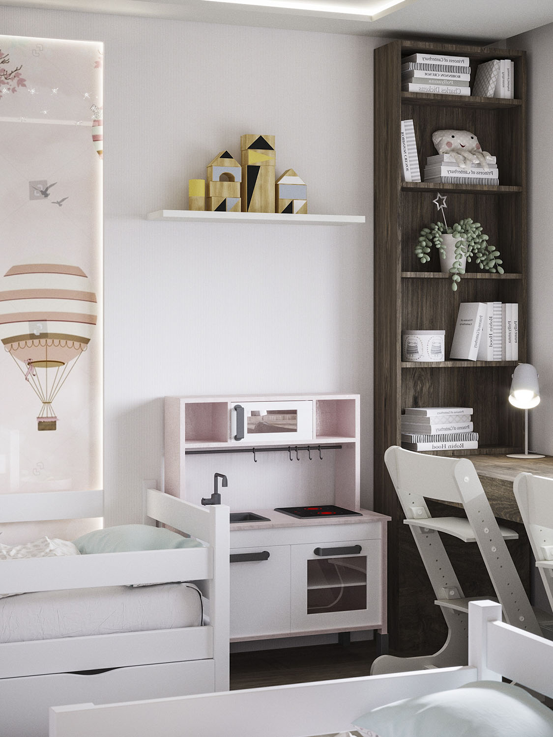 Дизайн детской был разработан для молодой семьи с двумя маленькими девочками. В комнате площадью всего 10 м² совместили кровати, рабочее место и небольшую зону для игр.