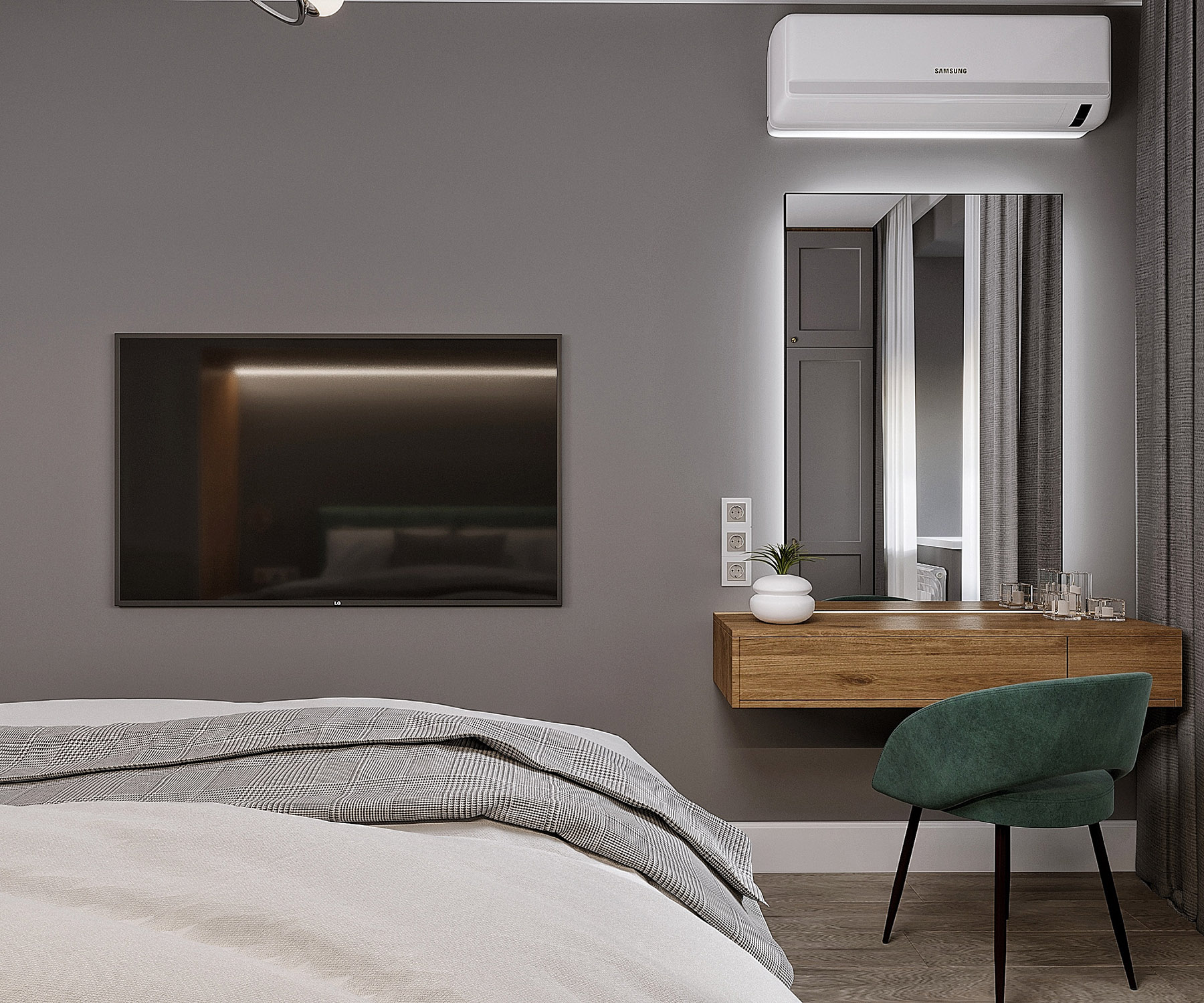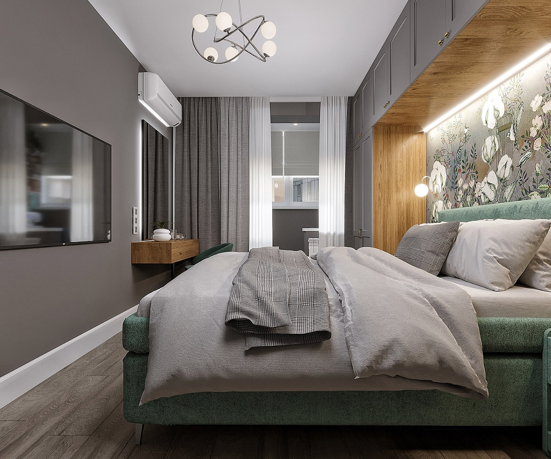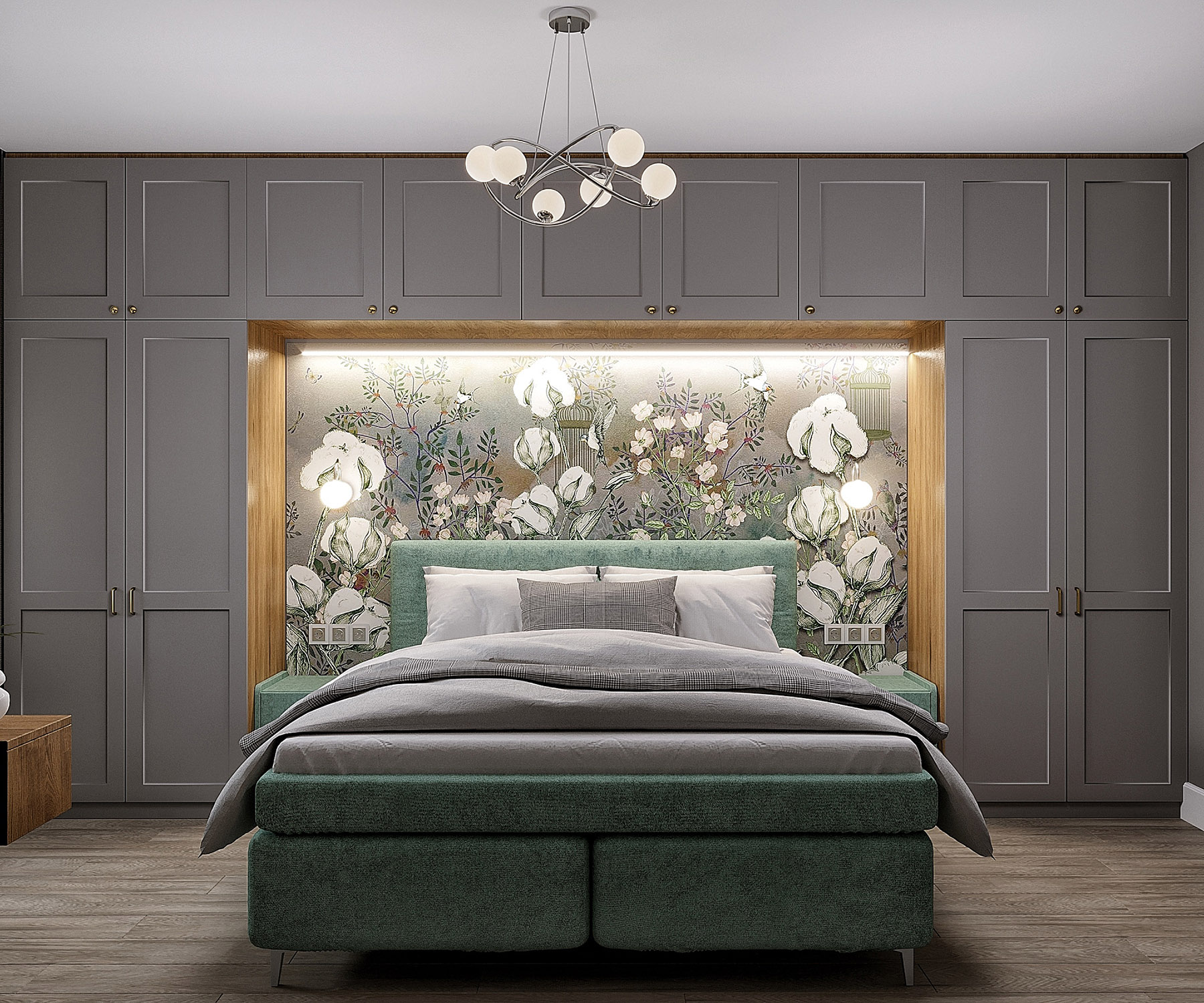 Проект спальни площадью 14,9 м², город Самара. Заказчикам хотелось сделать комнату в спокойных тонах, но в то же время хотелось добавить акцента. Им стала фреска из коллекции «Botanica», которая добавила интерьеру уютные природные нотки.