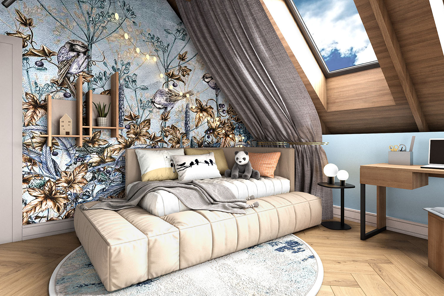 Детская комната на мансардном этаже из проекта частного дома в городе Владивосток. Обои из коллекции BOTANICA. Задача стояла в том, чтобы организовать уютное пространство для жизни. Заказчики предпочитали современный стиль с яркими цветовыми акцентами. Интерьер должен был быть стильным и запоминающимся.
