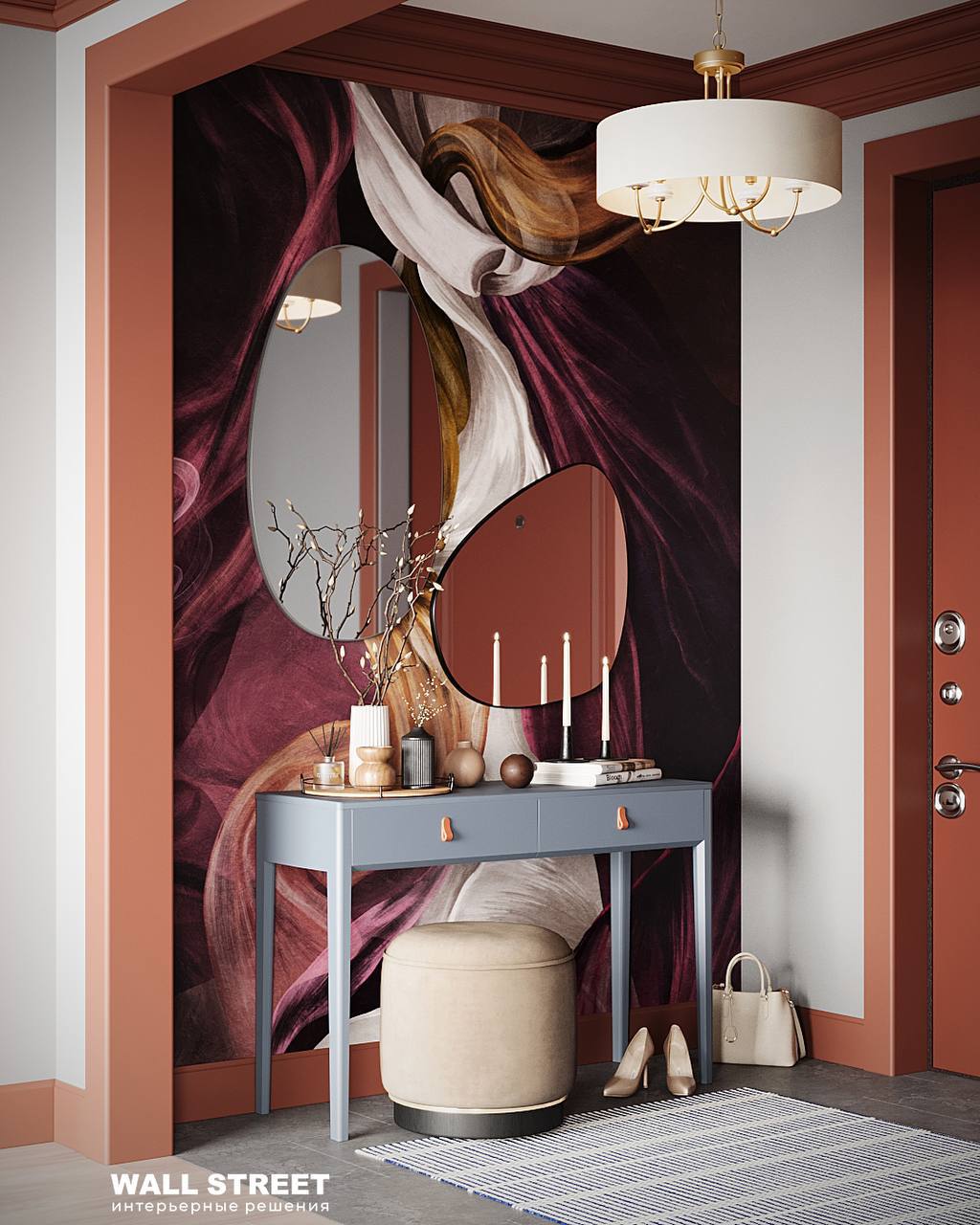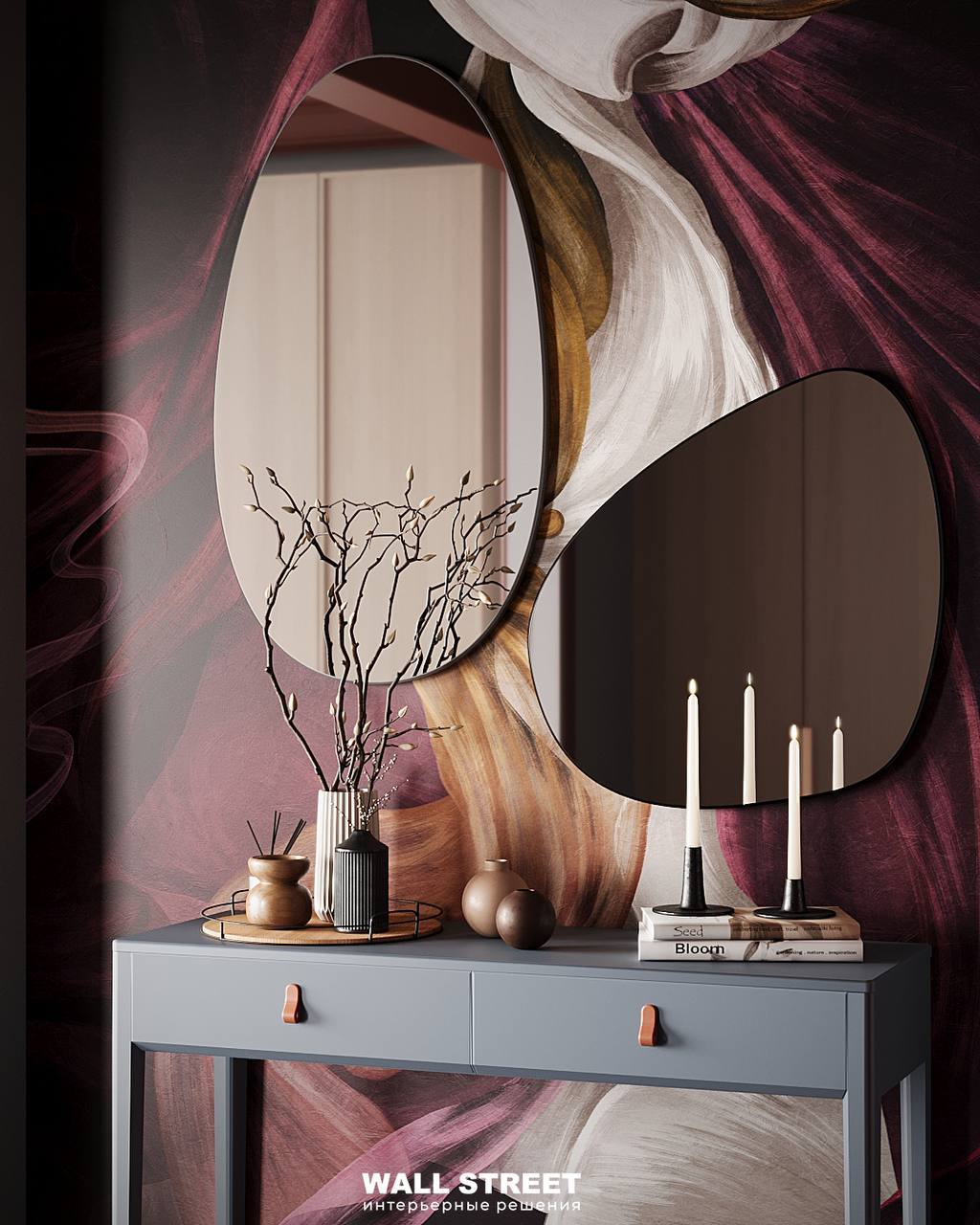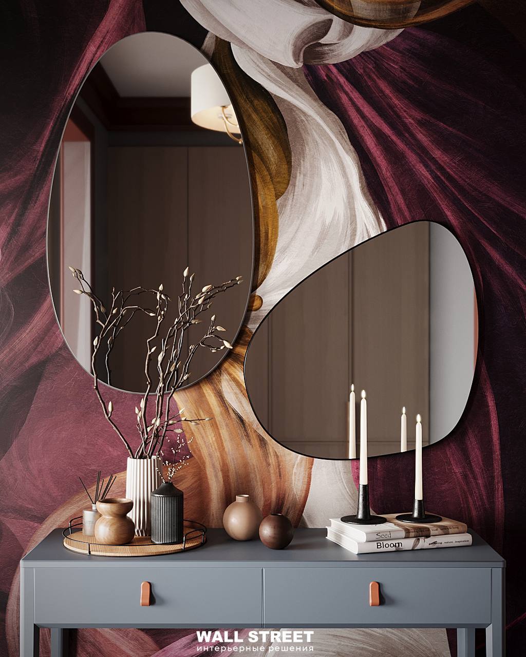 Зеркало работает как арт-объект: необычная форма, рама, фактура — и у вас уже не просто зеркало, а акцентная точка в интерьере.