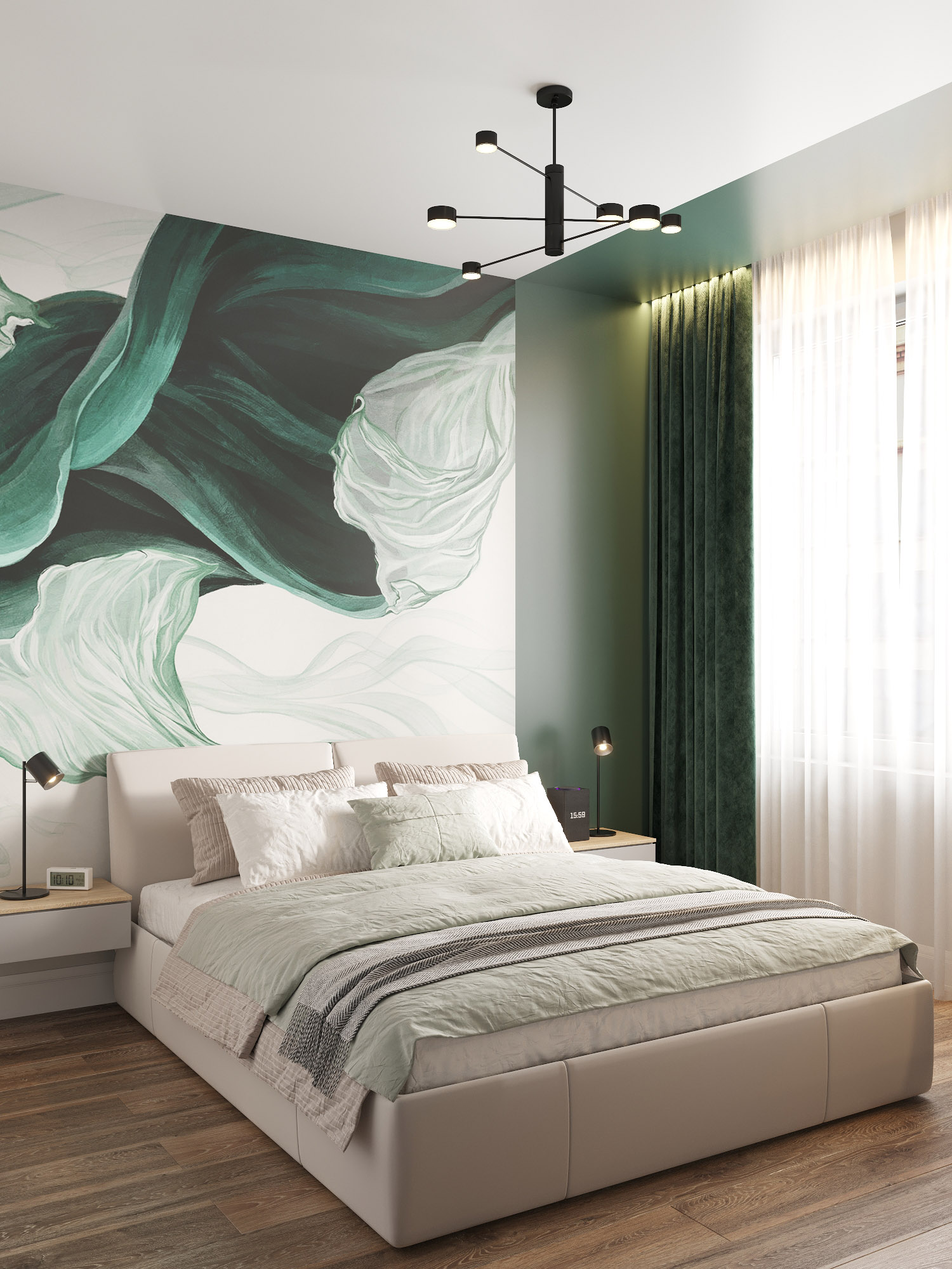 Спальня 13,7 м² для семьи из двух человек. Обои из коллекции «Breeze». Вдохновленные невесомостью тканей в квартире на побережье Каспийского моря, они соберут отличную концепцию интерьера, в котором текстиль дополняет пространство, собирая картинку в единое целое, пропуская в помещение воздух и наделяя его лёгкостью.