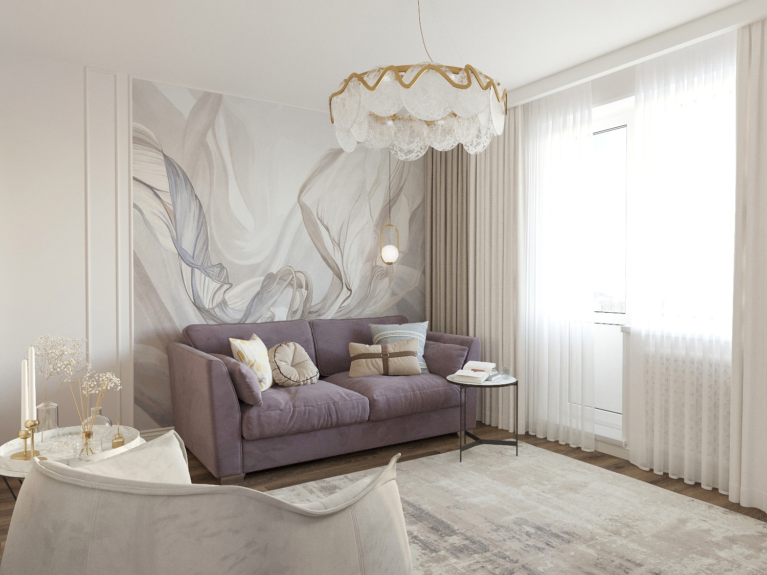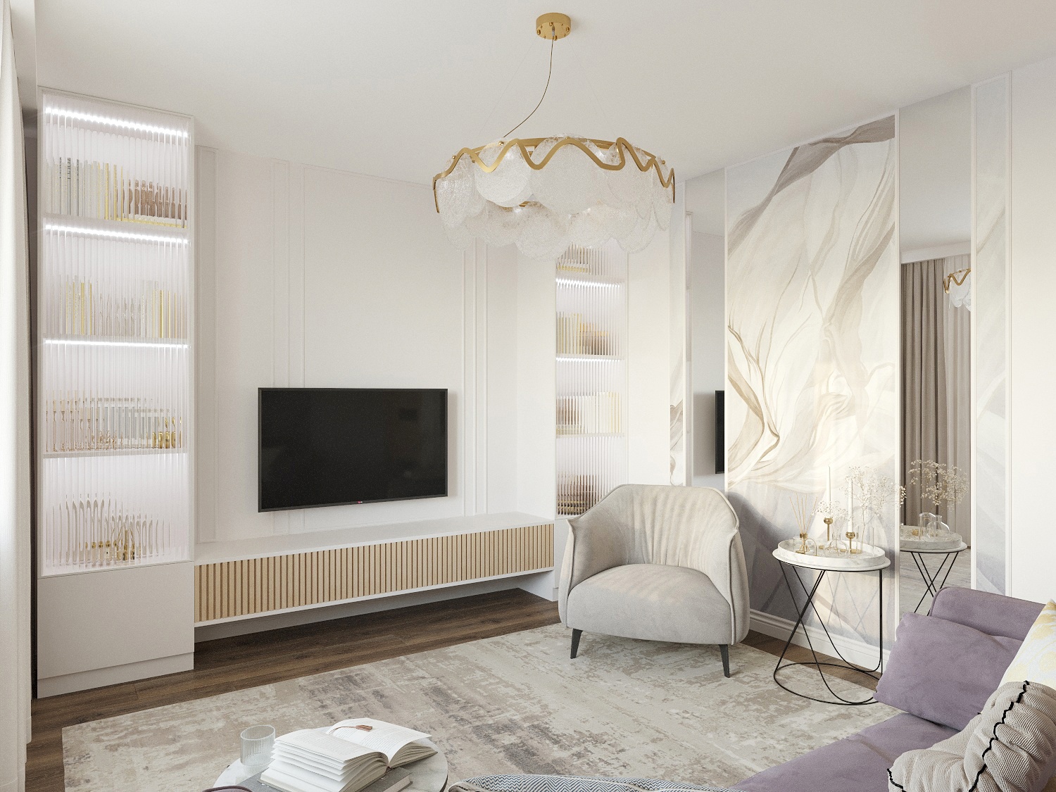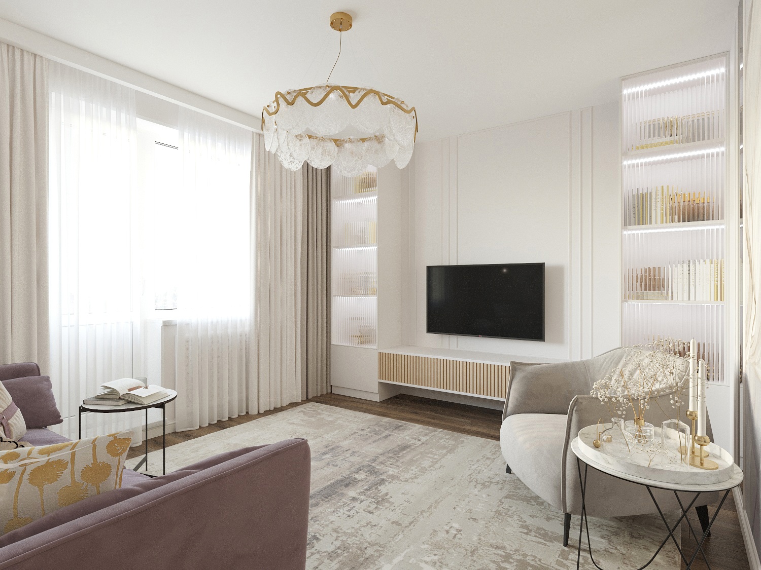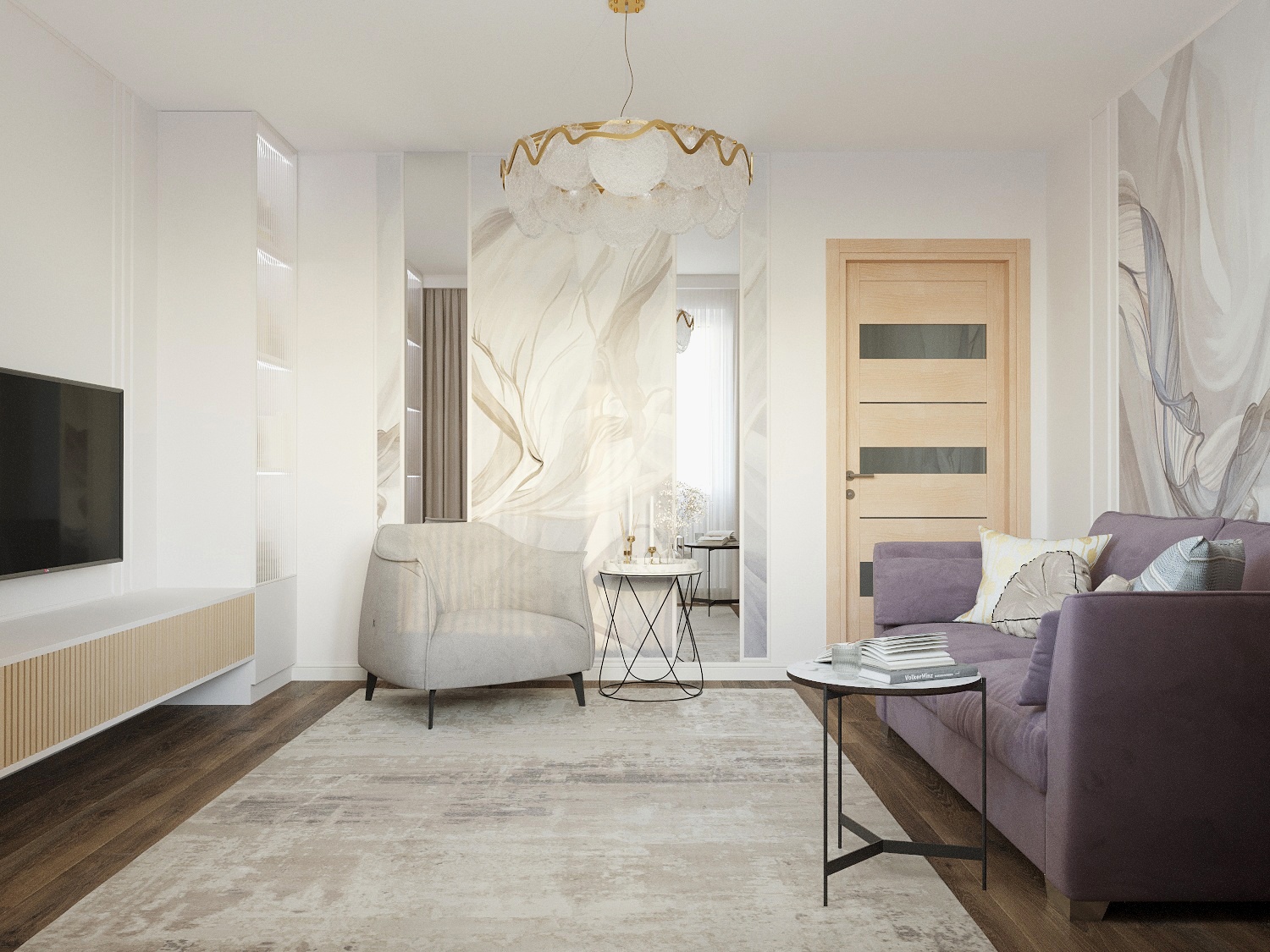 Дизайн гостиной в бежево-сиреневых оттенках