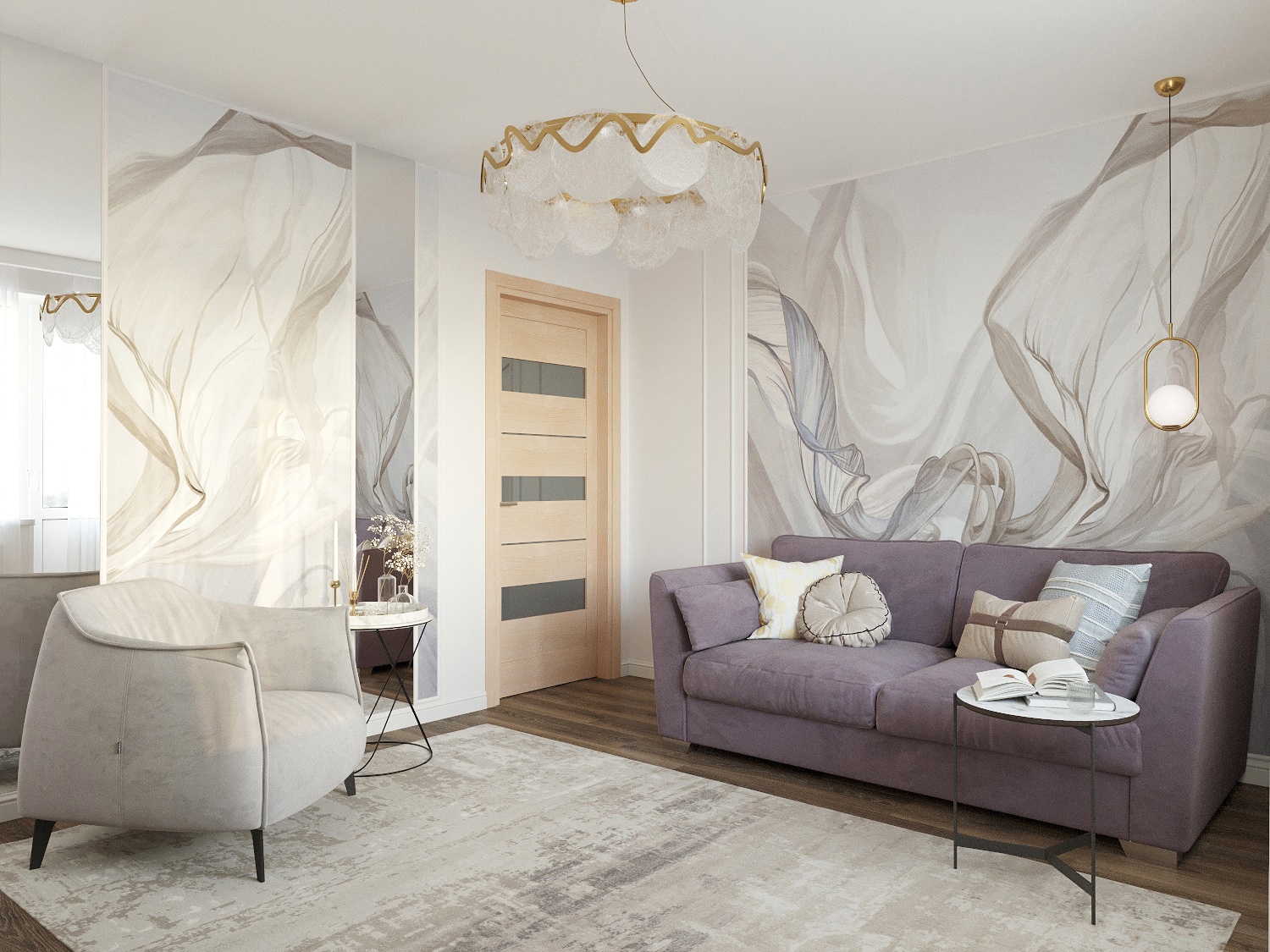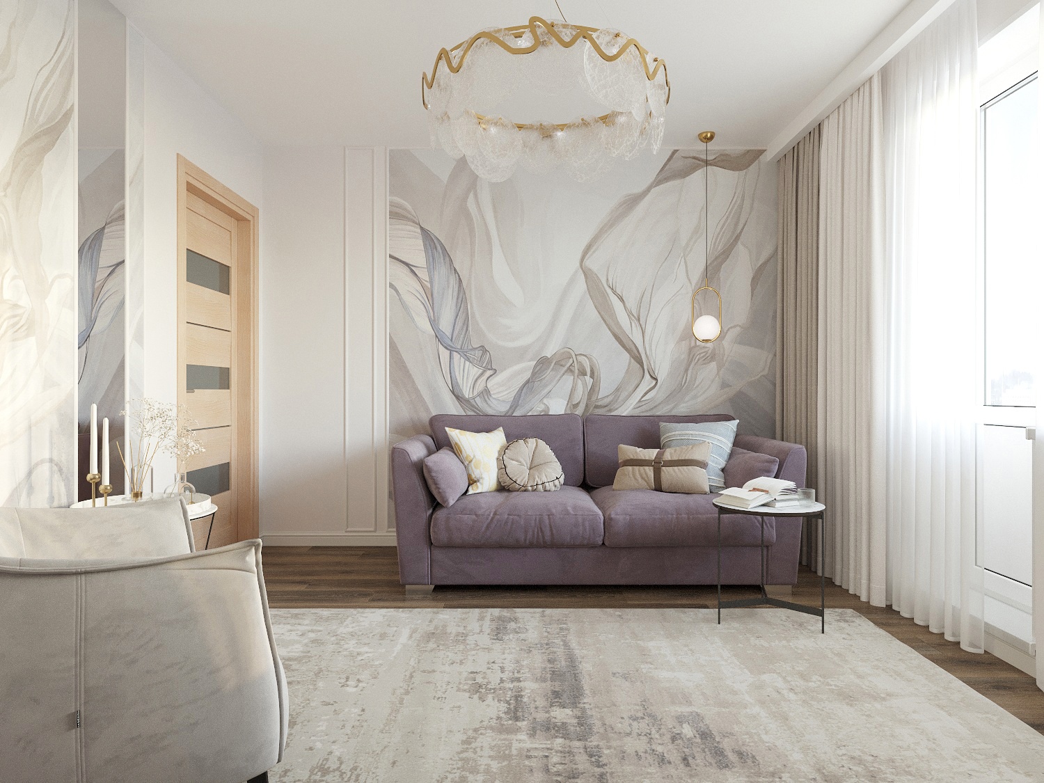 В стилистике и цветовой гамме этой гостиной дизайнер отталкивался от дивана. Именно он задает настроение всему интерьеру. Пожеланиями заказчика было оставить диван, пол и дверь. Фреска BREEZE объединила оттенки интерьера, придав интерьеру легкость, гармонию и завершенность.