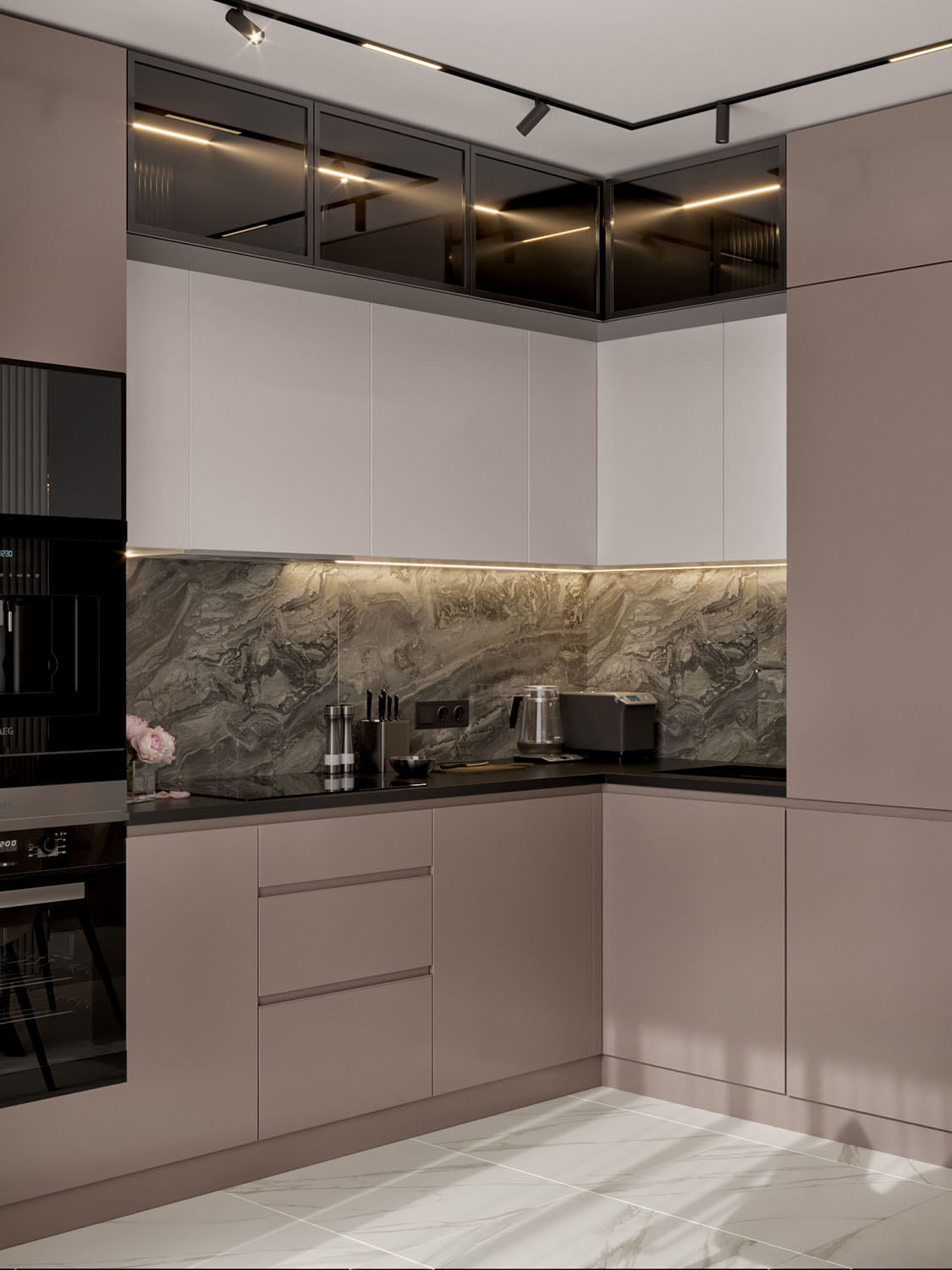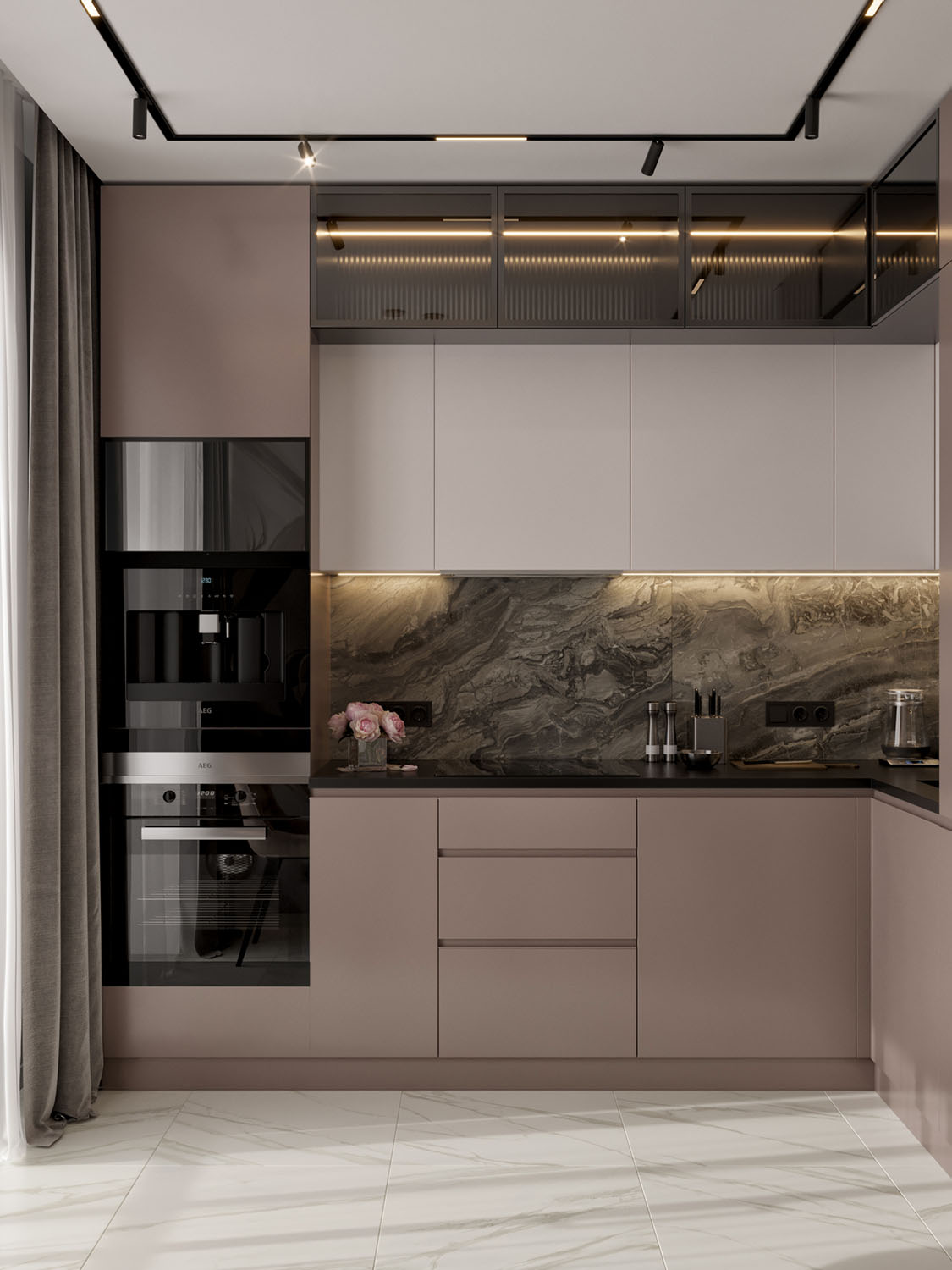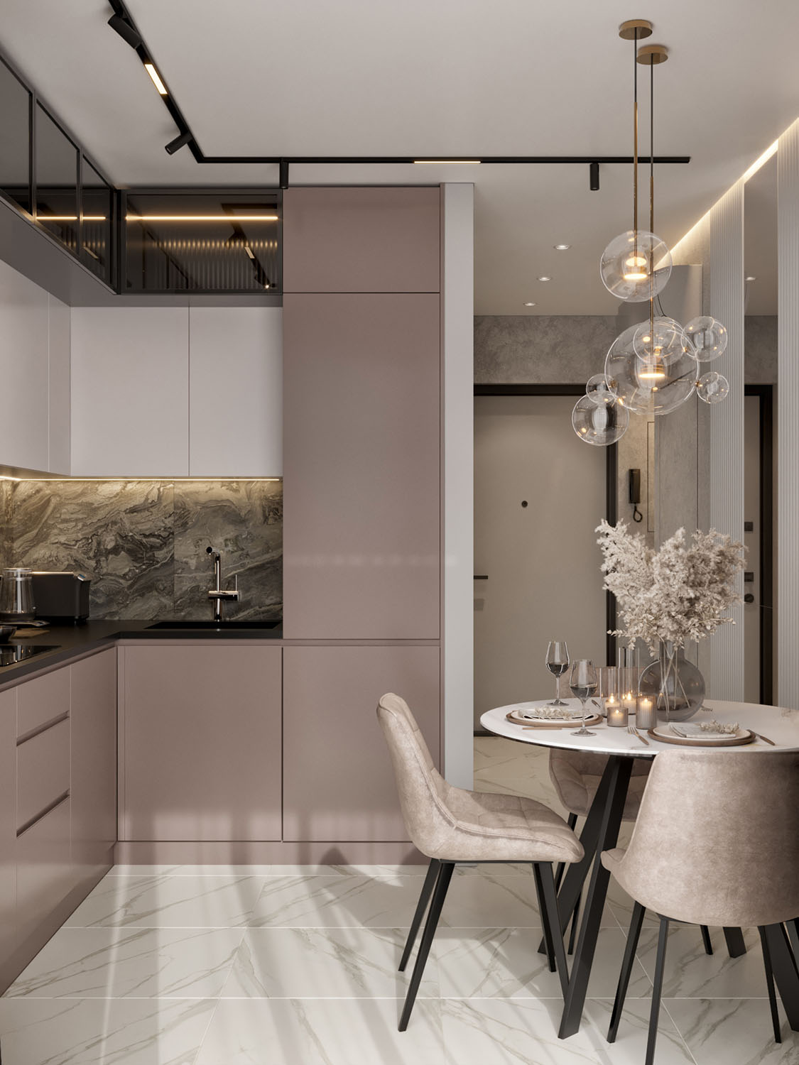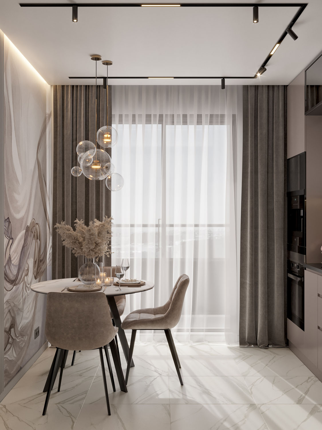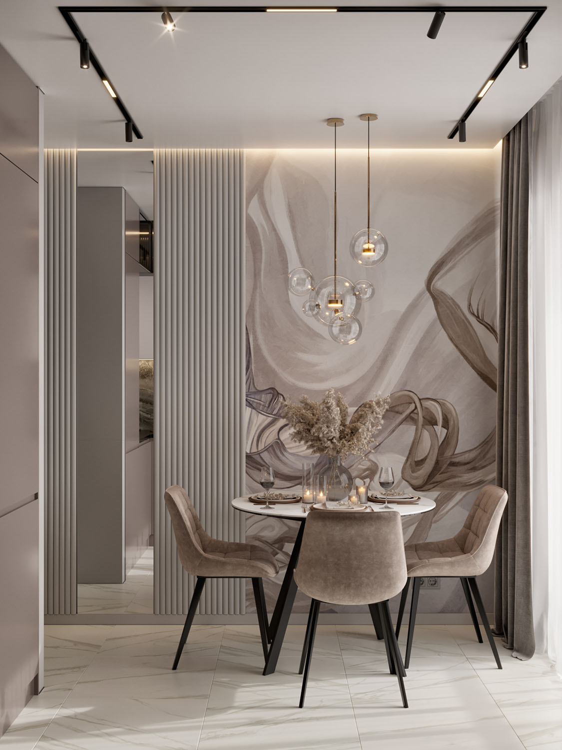 Кухня в квартире девушки-студентки. Фреска из коллекции BREEZE. Обои из этой коллекции соберут отличную концепцию интерьера, в котором текстиль дополняет пространство, собирая картинку в единое целое, пропуская в помещение воздух и наделяя его лёгкостью.