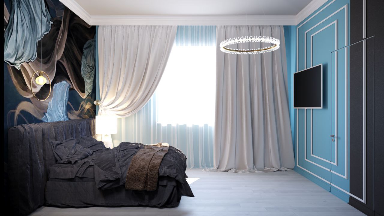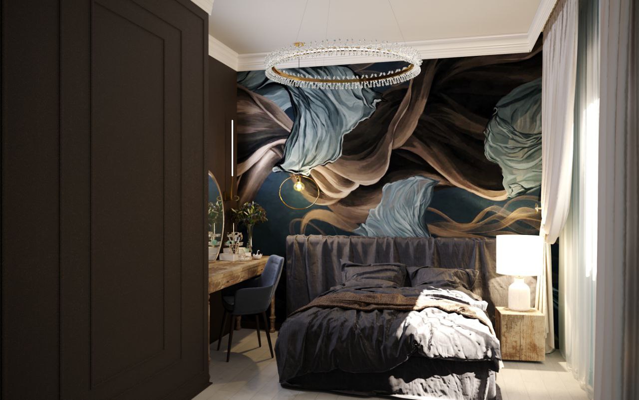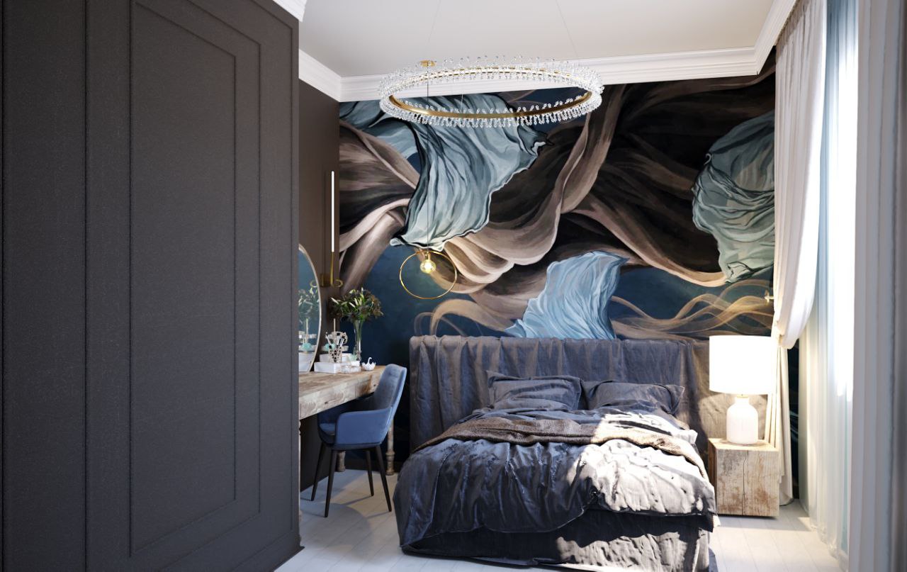 В интерьер спальни заказчики выбрали фреску Breeze 4. Обои из этой коллекции соберут отличную концепцию интерьера, в котором текстиль дополняет пространство, собирая картинку в единое целое, пропуская в помещение воздух и наделяя его лёгкостью.