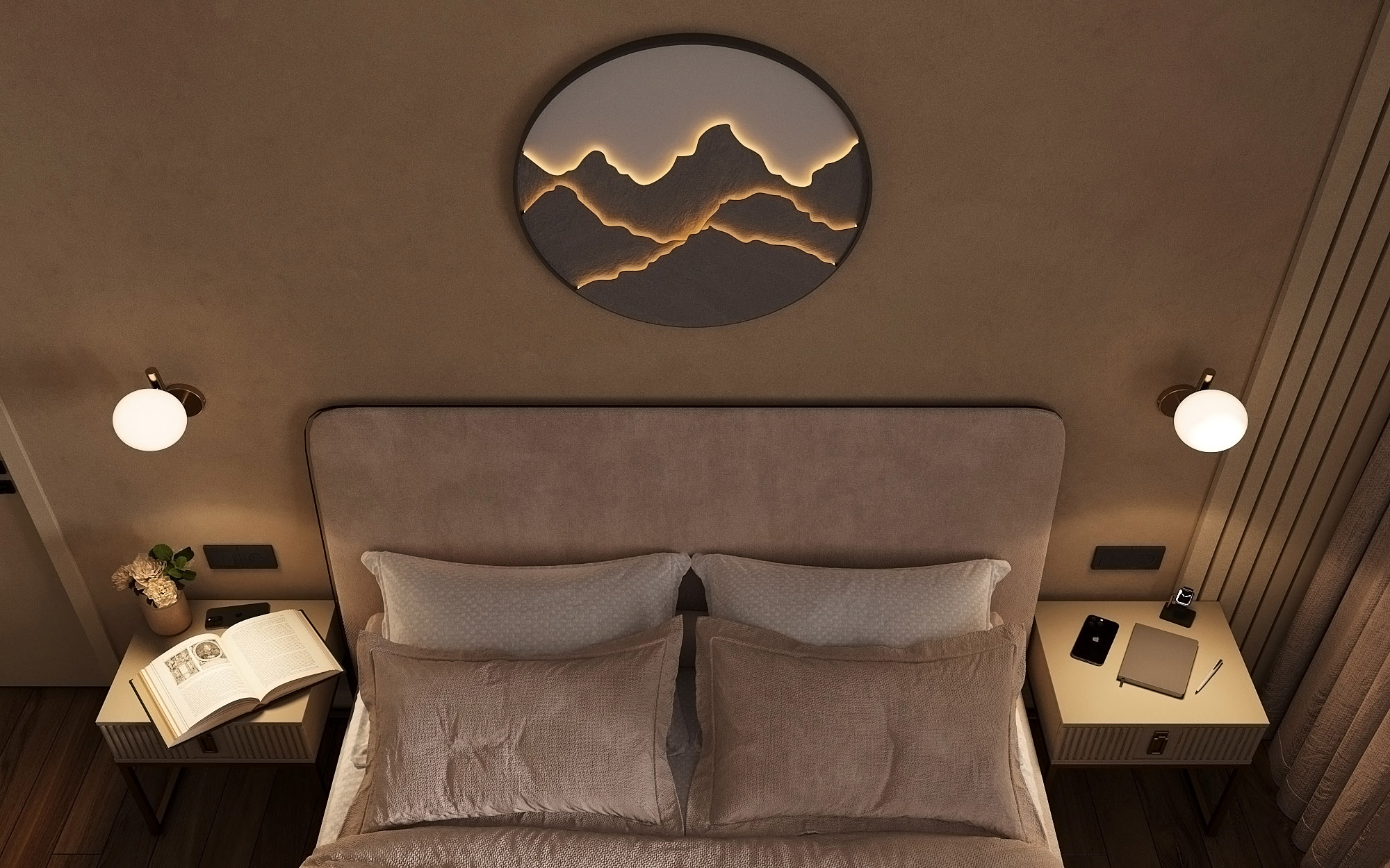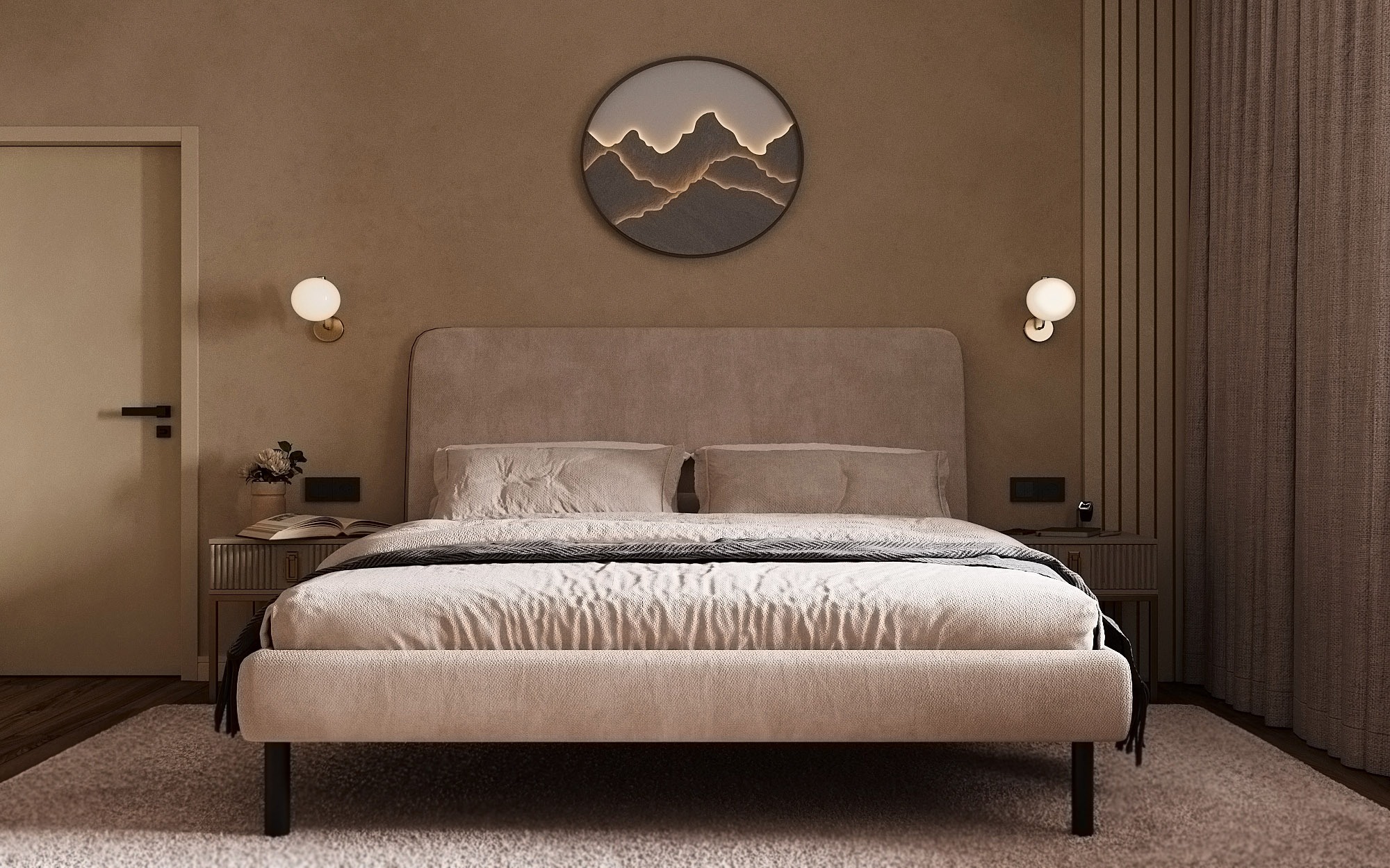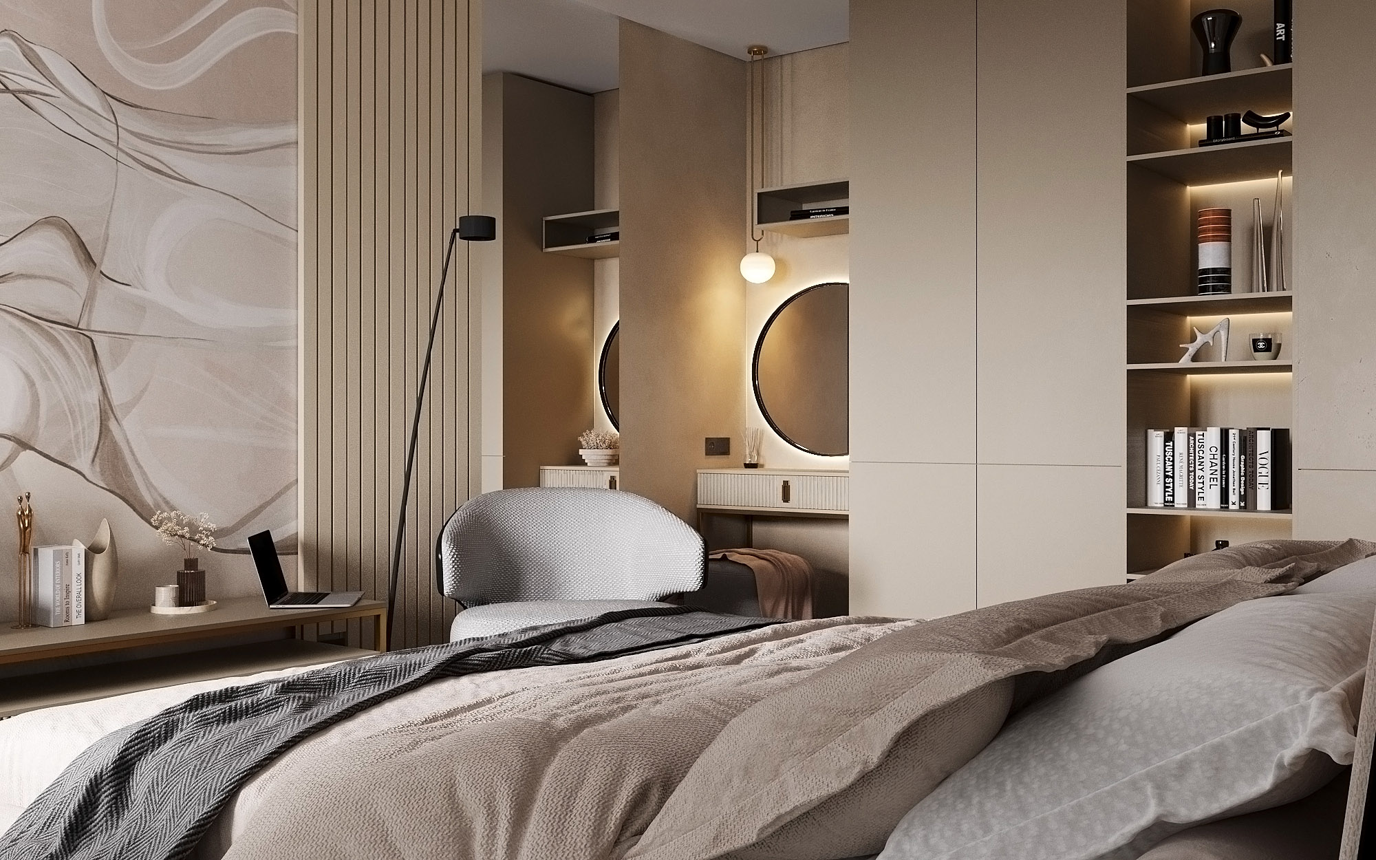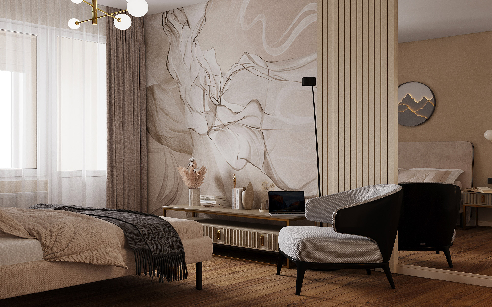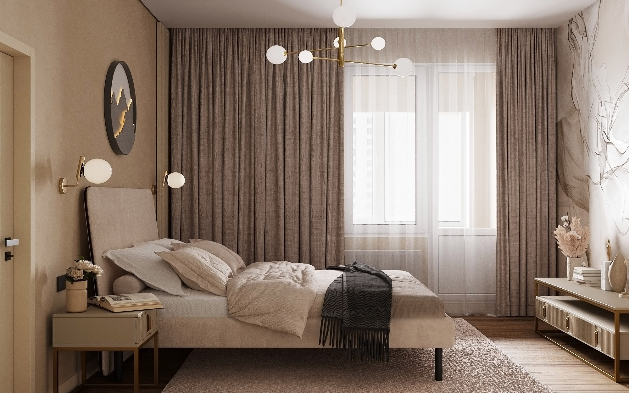 Проект ЖК Галактика PRO, г. Санкт-Петербург. Заказчики — семья из трех человек. Спальня площадью 15 м². Главным пожеланием по проекту было оформление квартиры в монохромных бежевых тонах. В спальне акцентная стена выделена необычными обоями из коллекции «Breeze», которые гармонично дополнили интерьер.