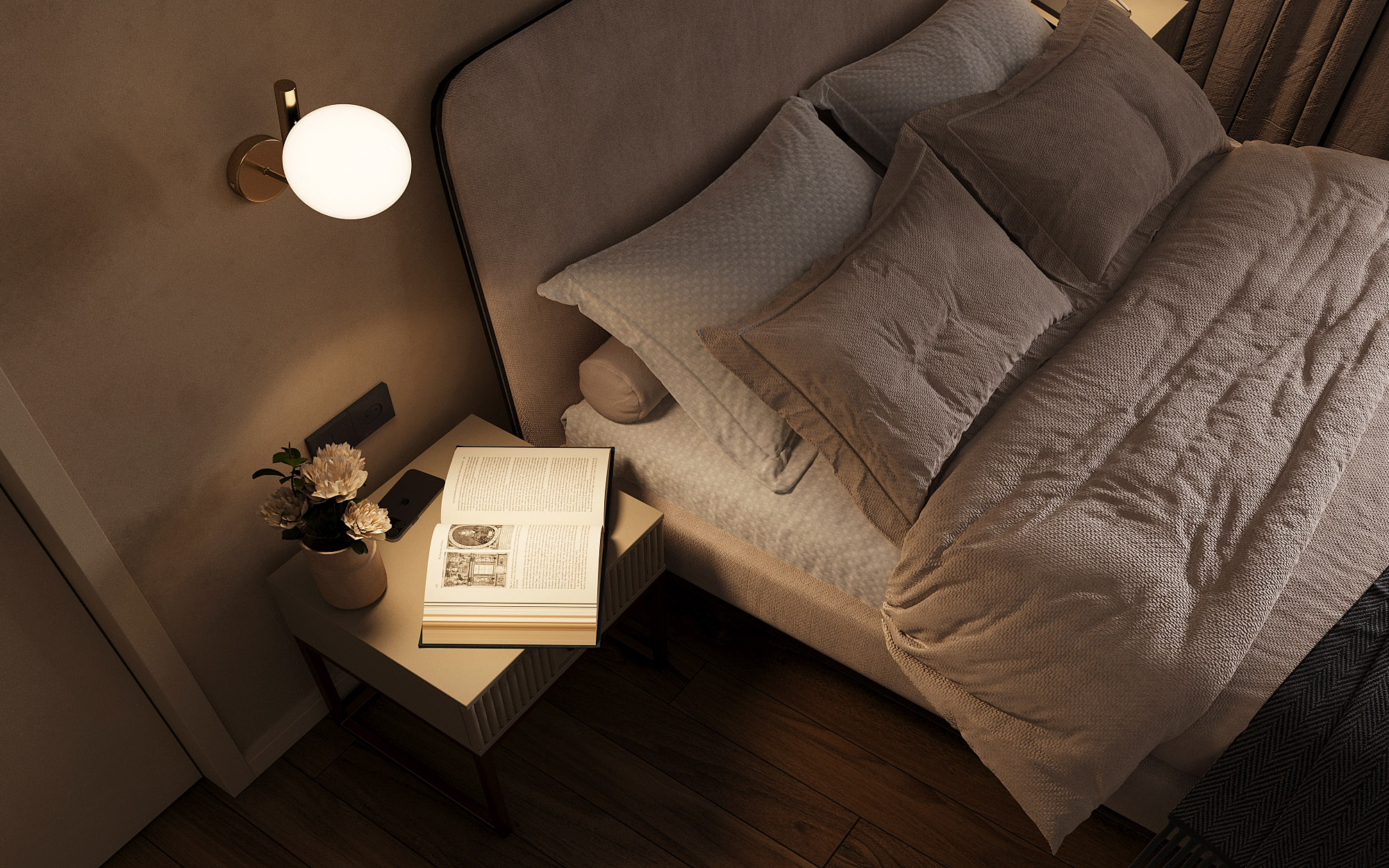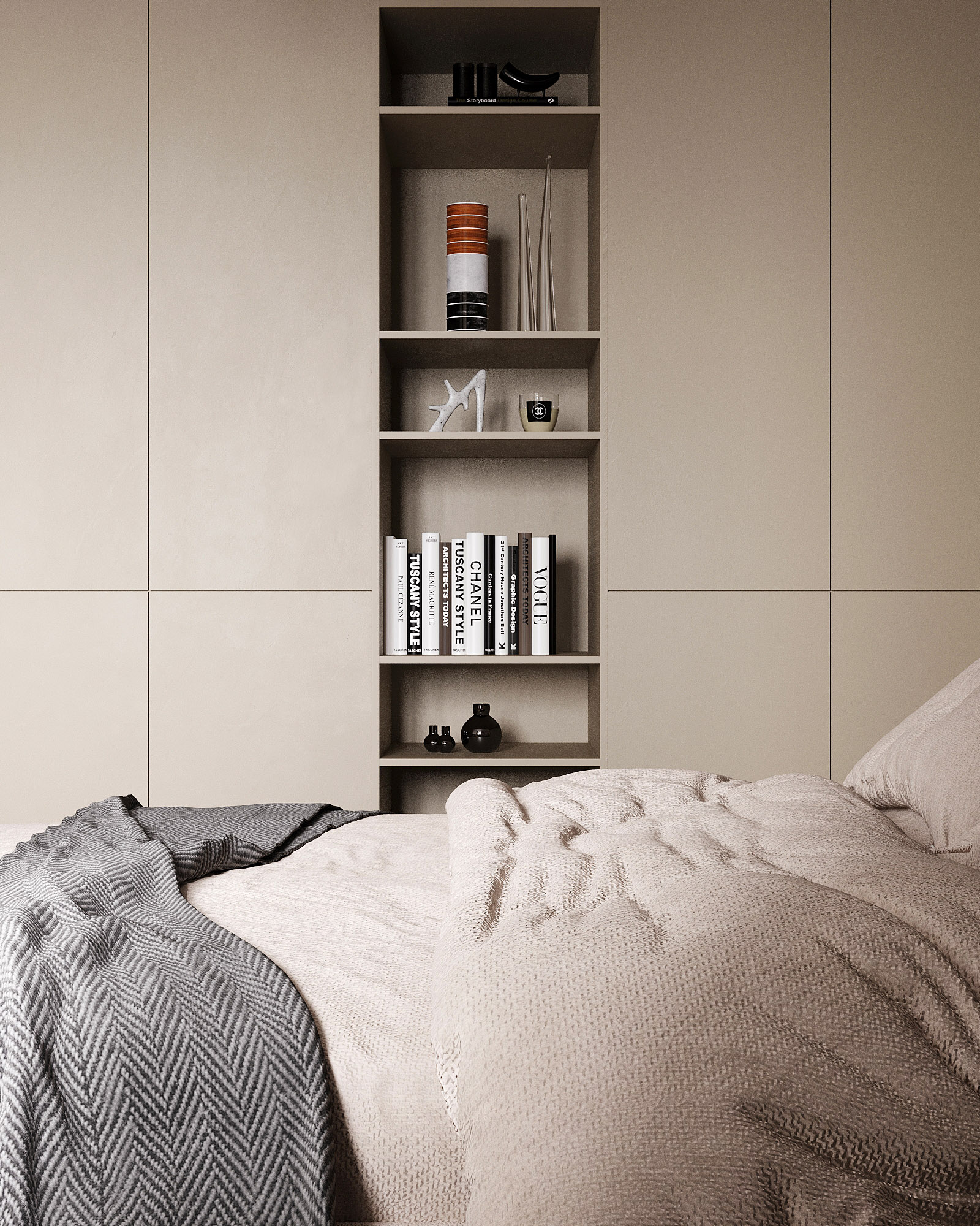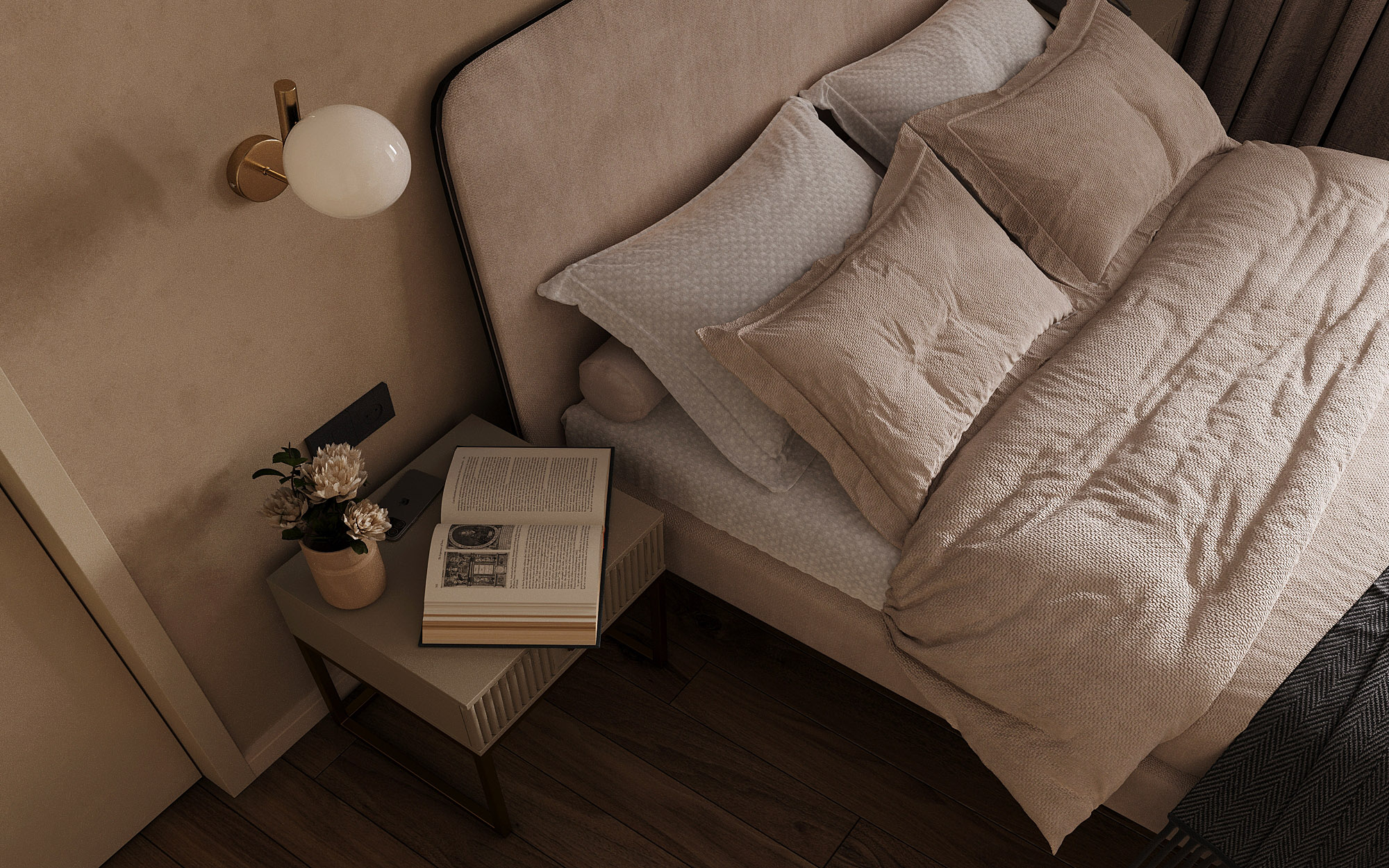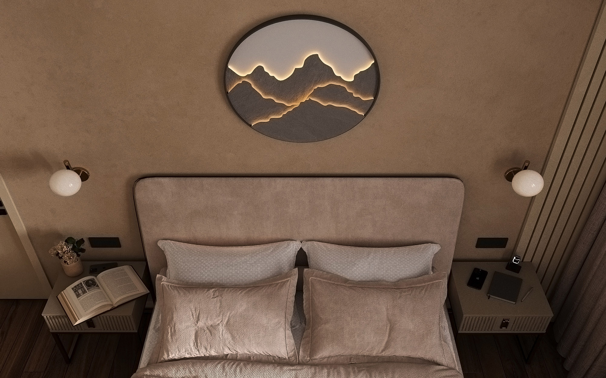 Проект ЖК Галактика PRO, г. Санкт-Петербург. Заказчики — семья из трех человек. Спальня площадью 15 м². Главным пожеланием по проекту было оформление квартиры в монохромных бежевых тонах. В спальне акцентная стена выделена необычными обоями из коллекции «Breeze», которые гармонично дополнили интерьер.