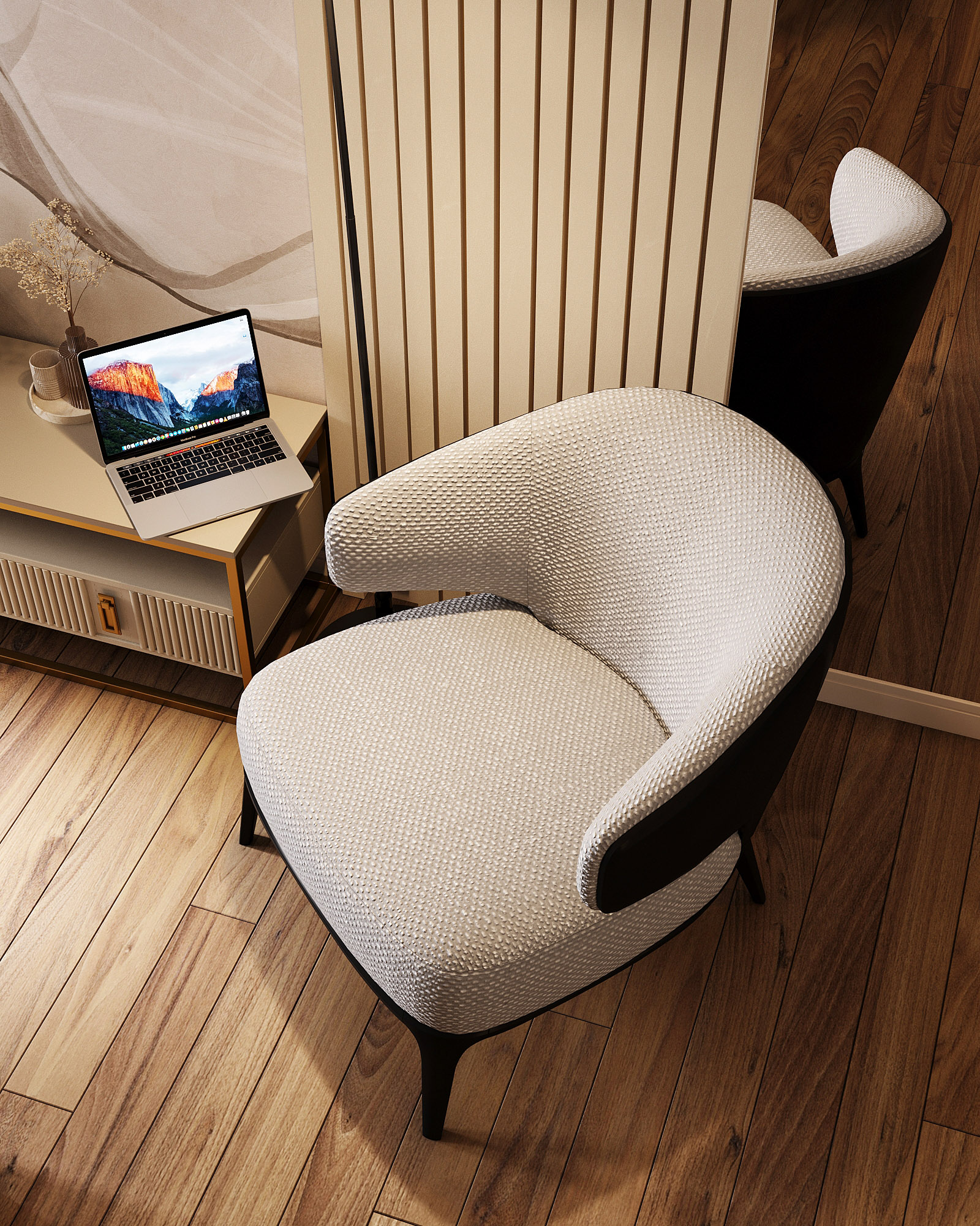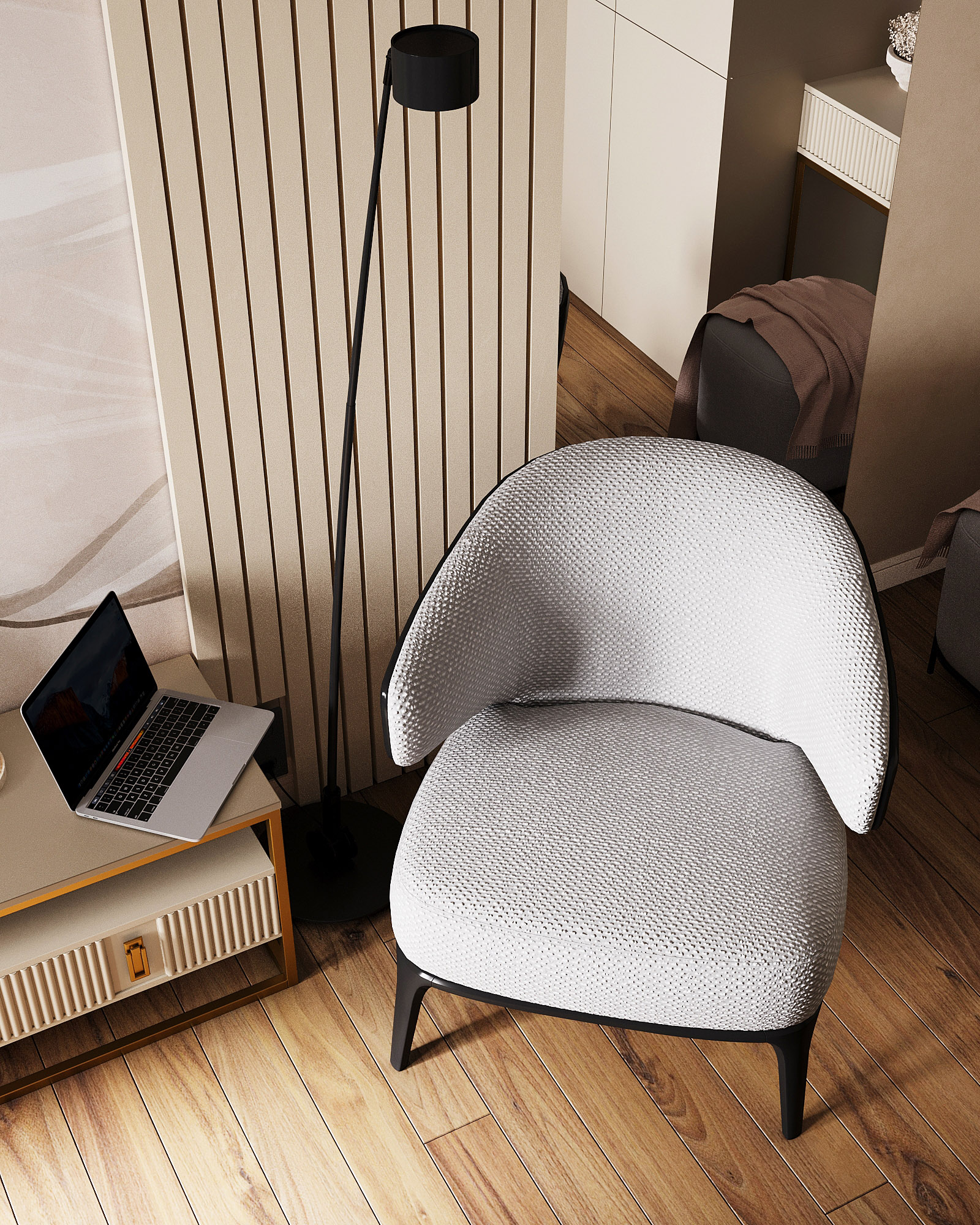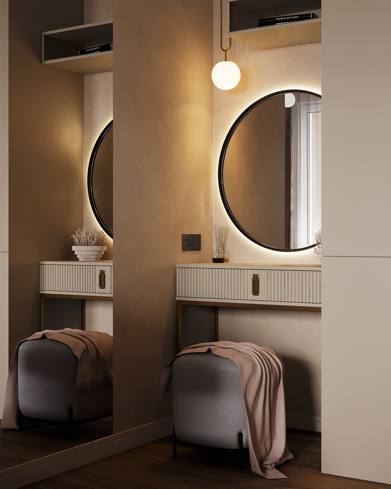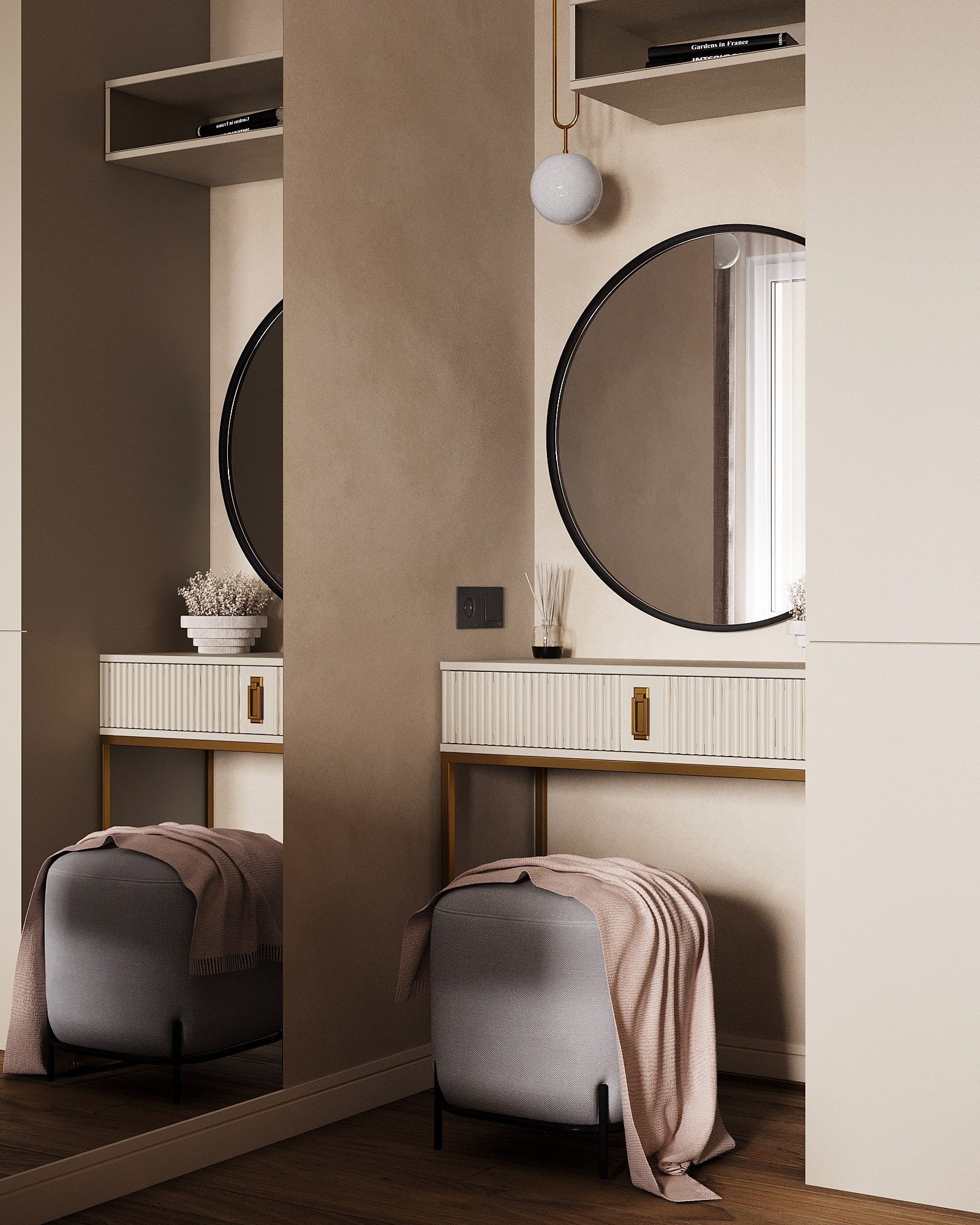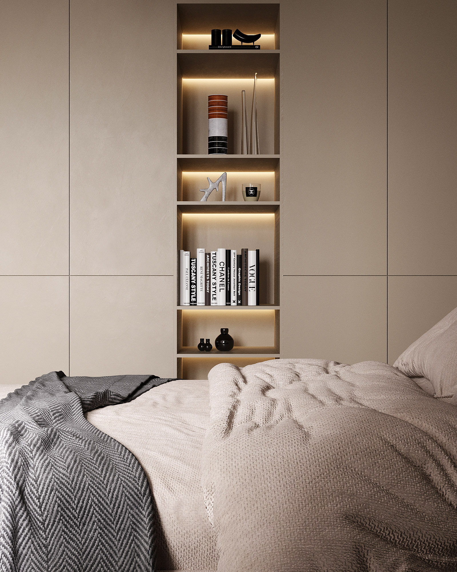 Проект ЖК Галактика PRO, г. Санкт-Петербург. Заказчики — семья из трех человек. Спальня площадью 15 м². Главным пожеланием по проекту было оформление квартиры в монохромных бежевых тонах. В спальне акцентная стена выделена необычными обоями из коллекции «Breeze», которые гармонично дополнили интерьер.