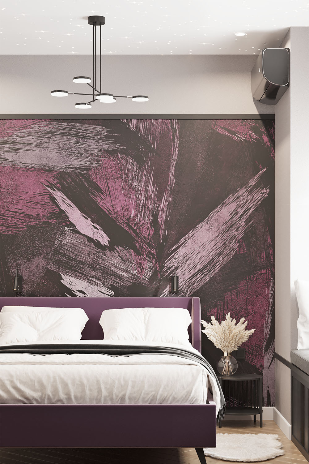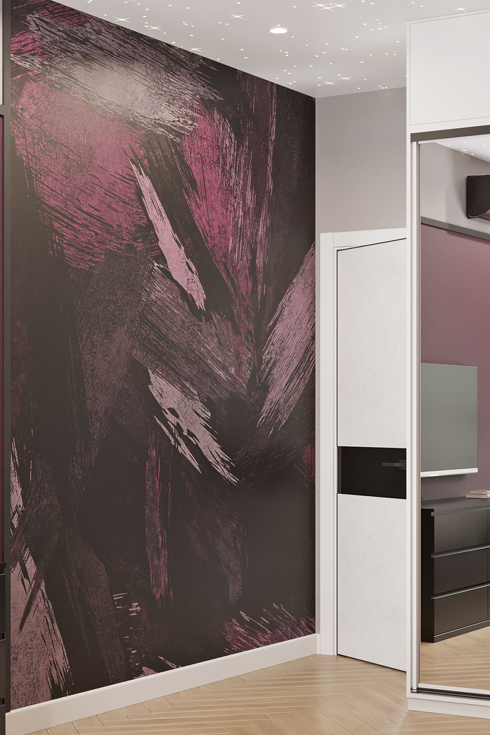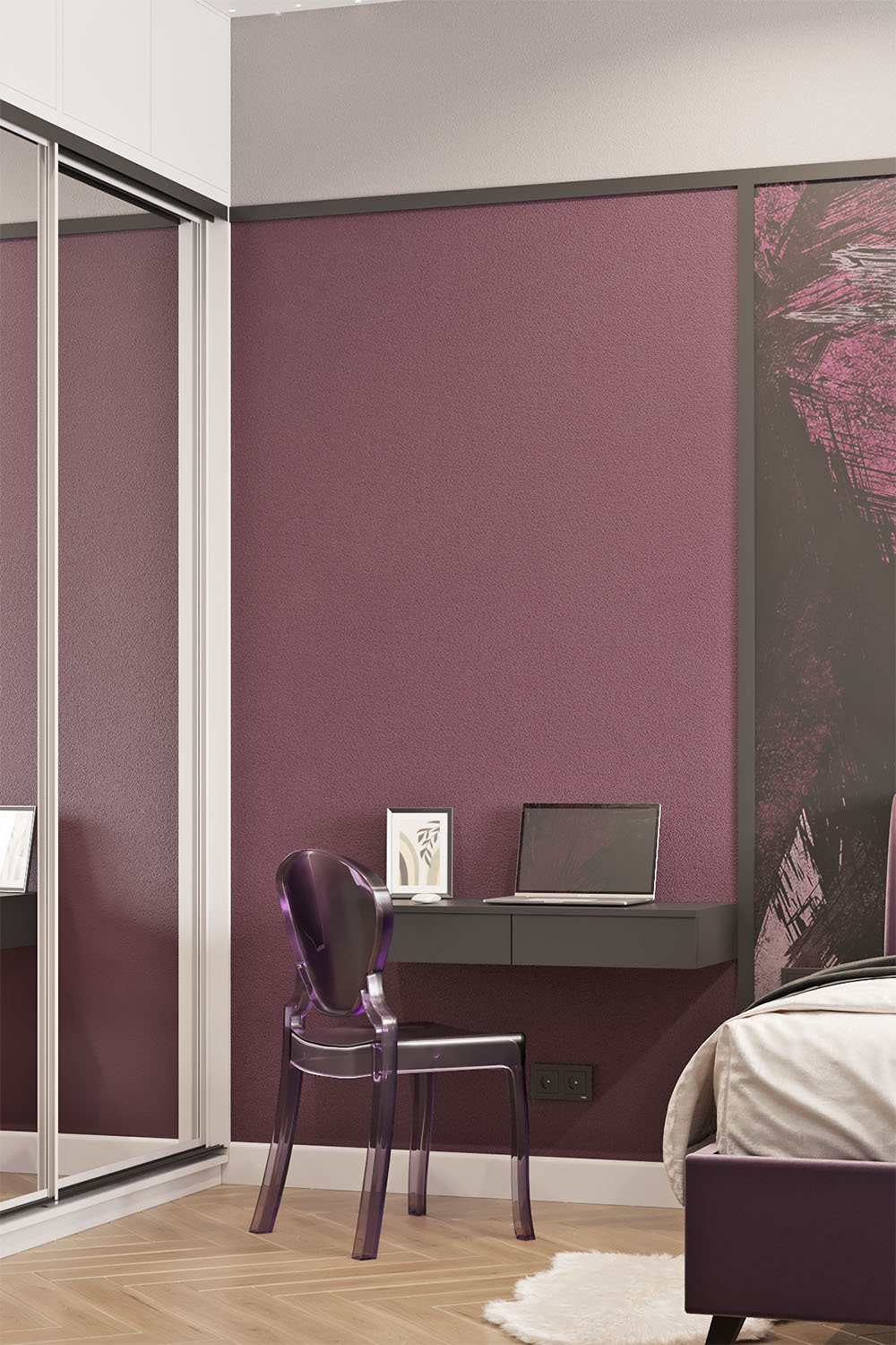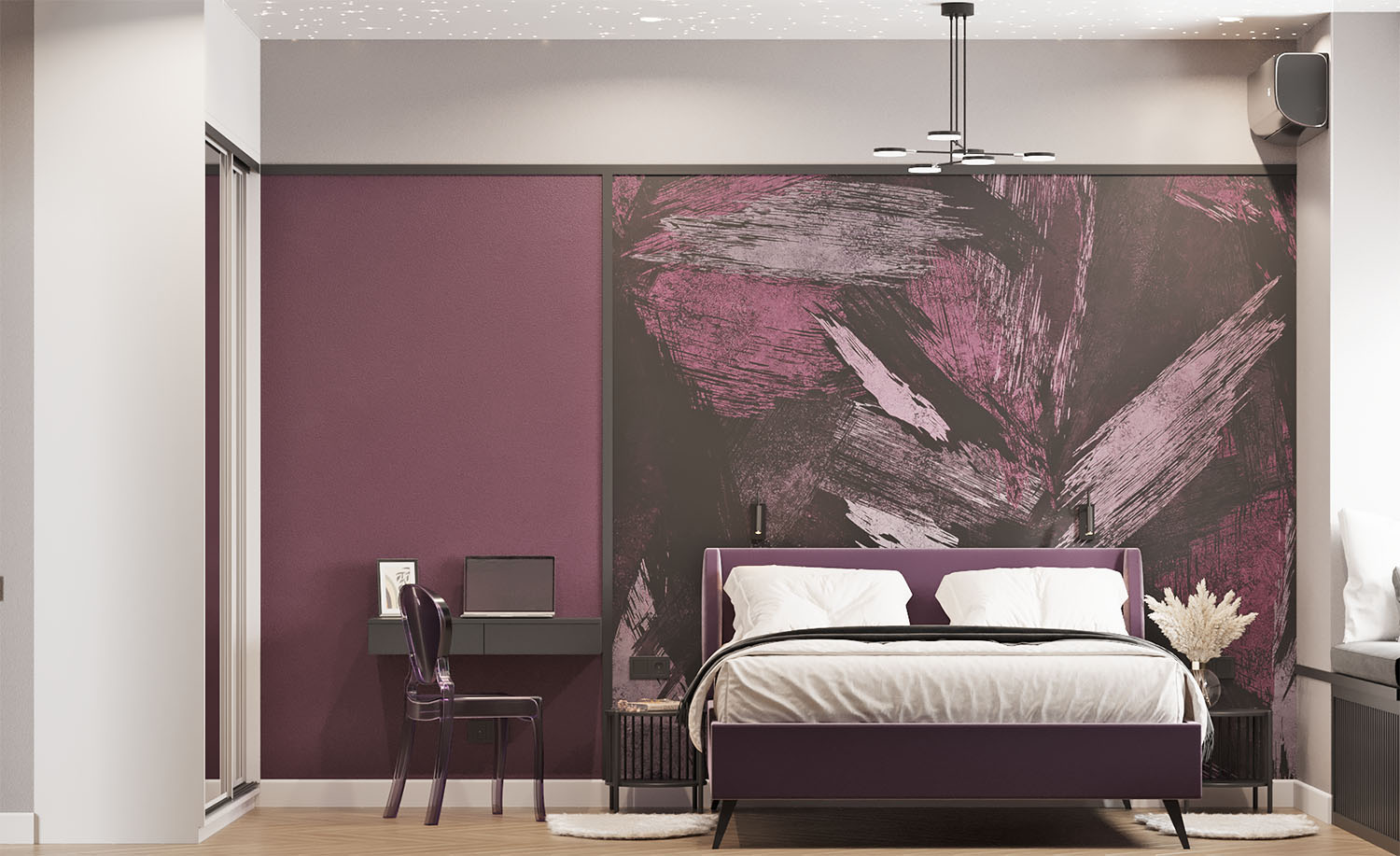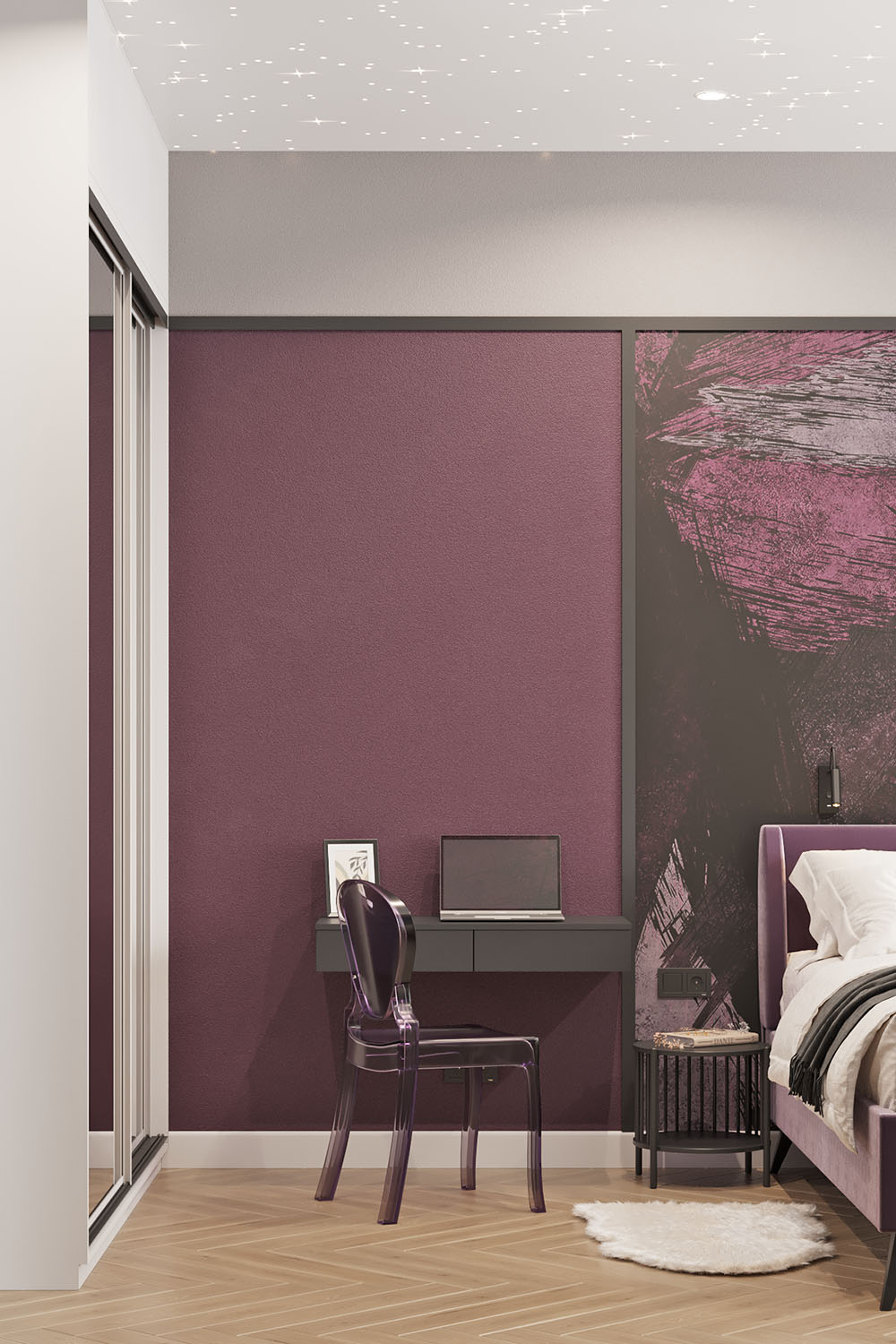 Дизайн-проект в ЖК «EVER» в г. Москва. Спальня площадью 15,7 м² для молодой девушки, увлекающейся сёрфингом, конным спортом, путешествиями и психологией. Заказчица — очень яркая и жизнерадостная девушка, поэтому и дизайн для неё создавался соответствующий. Интерьер получился контрастный, сочный и незабываемый. Добиться такого эффекта в том числе помогли обои из коллекции BRUSH.