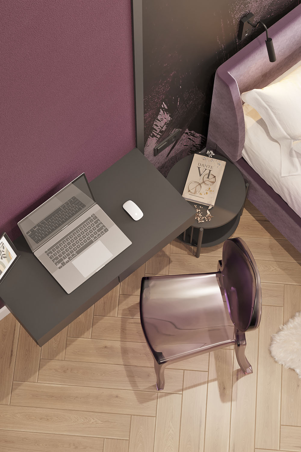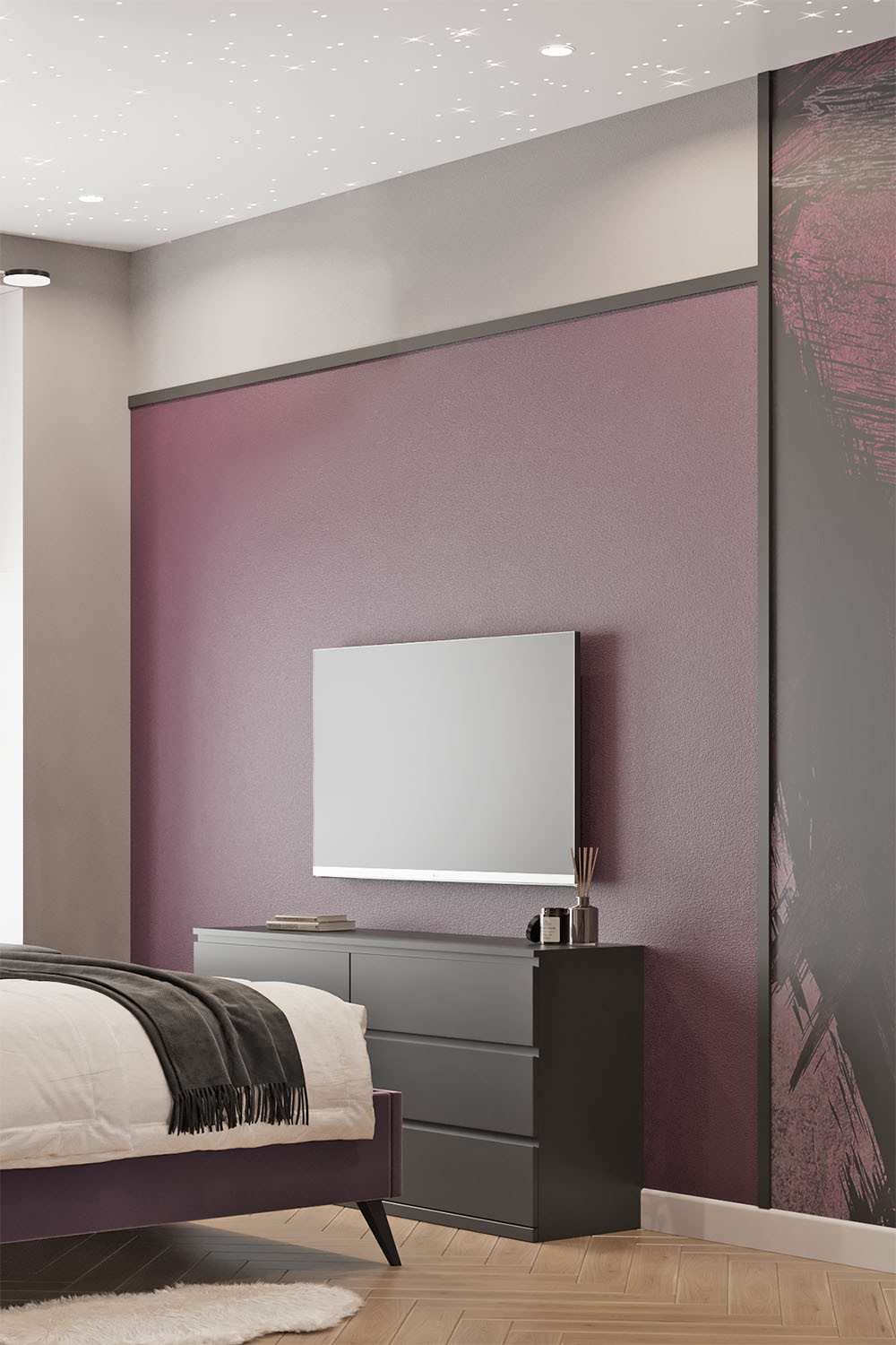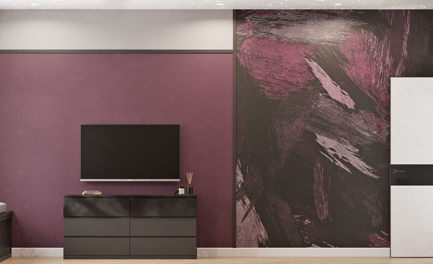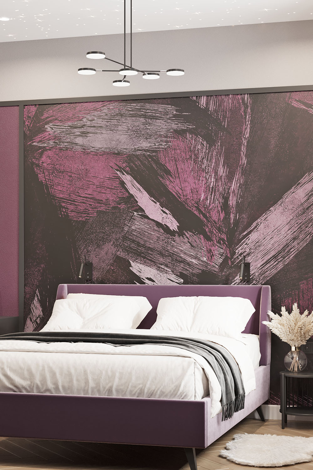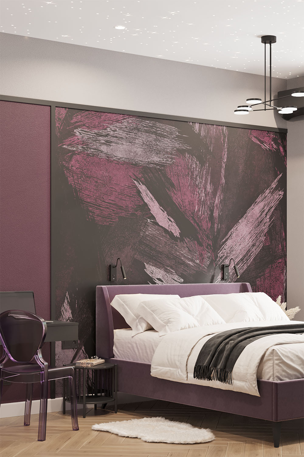 Дизайн-проект в ЖК «EVER» в г. Москва. Спальня площадью 15,7 м² для молодой девушки, увлекающейся сёрфингом, конным спортом, путешествиями и психологией. Заказчица — очень яркая и жизнерадостная девушка, поэтому и дизайн для неё создавался соответствующий. Интерьер получился контрастный, сочный и незабываемый. Добиться такого эффекта в том числе помогли обои из коллекции BRUSH.