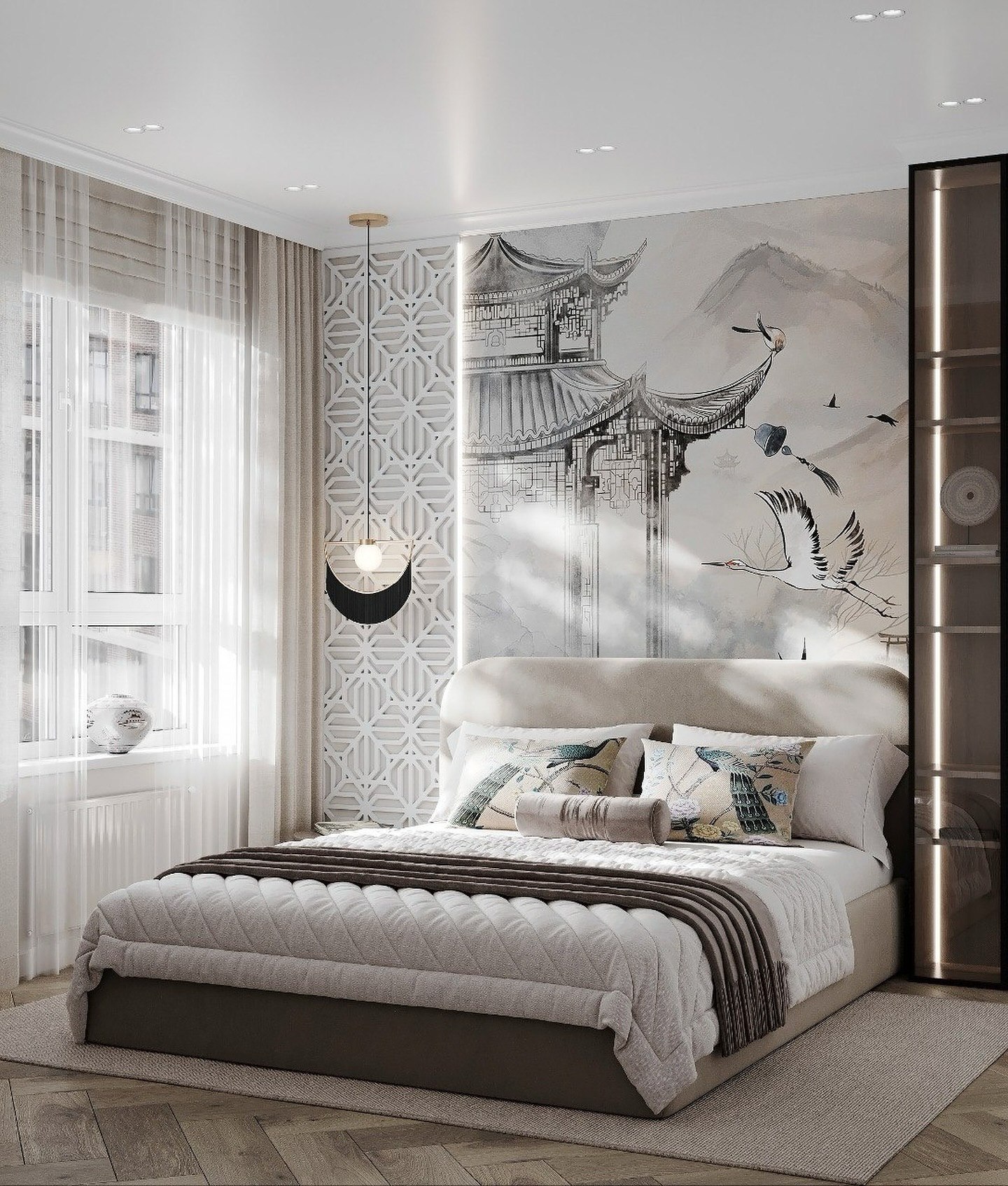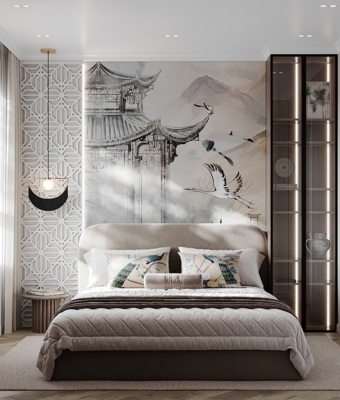 Необои Busido с азиатскими мотивами в дизайне спальни