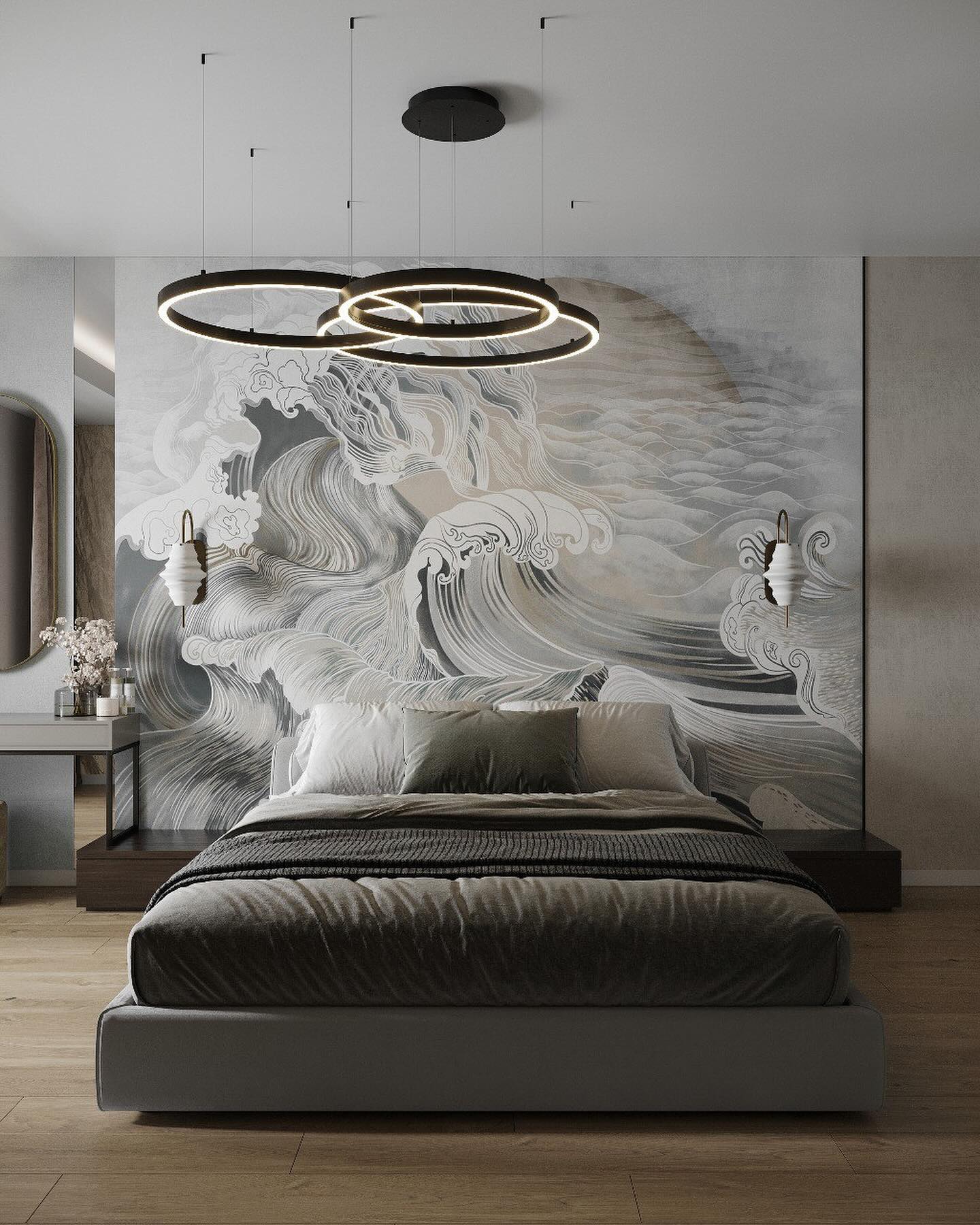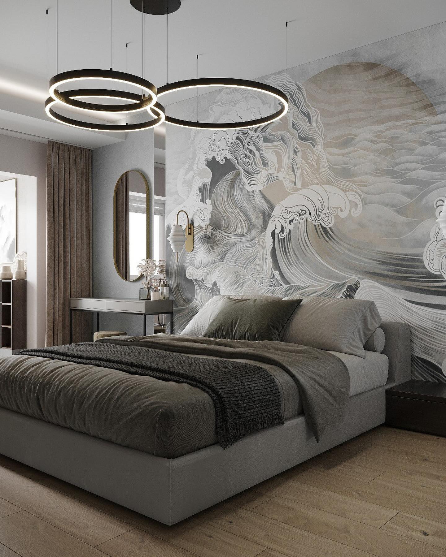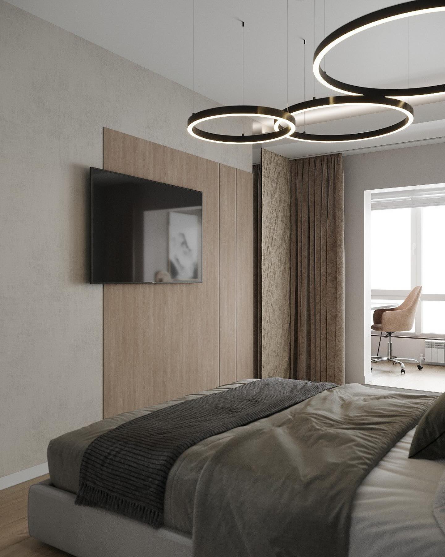 Цветовая палитра этой спальни подобрана с особым вниманием к деталям. Пастельные и нейтральные оттенки гармонично сочетаются, создавая приглушенный и спокойный фон.