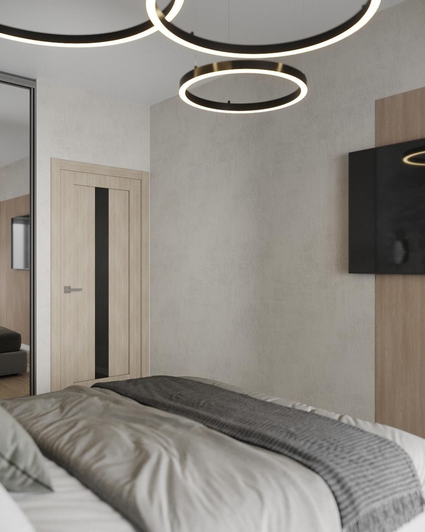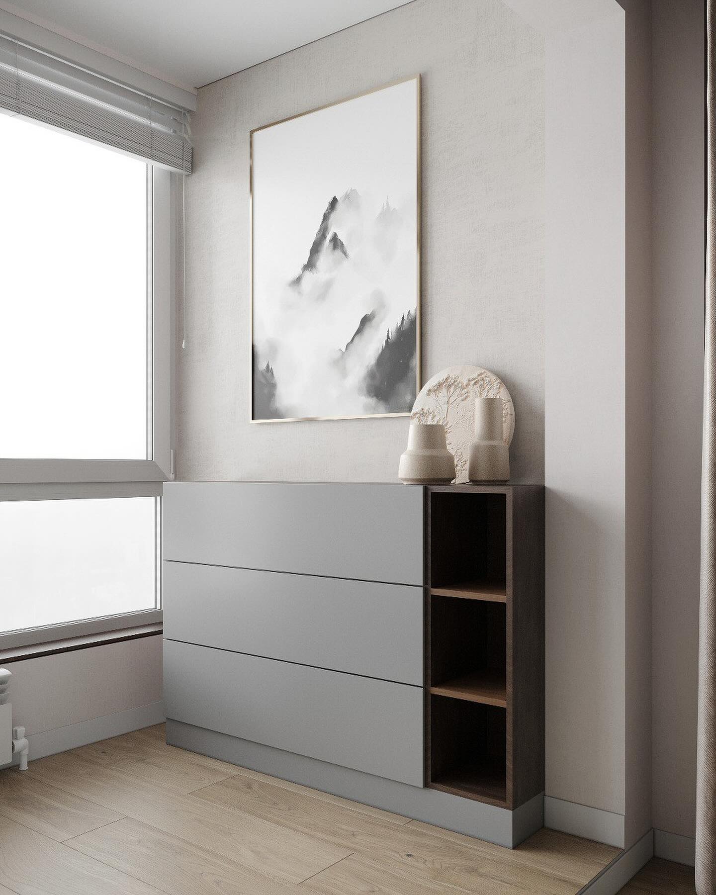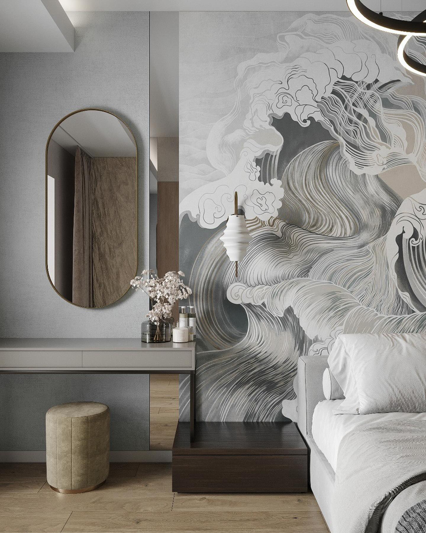 Цветовая палитра этой спальни подобрана с особым вниманием к деталям. Пастельные и нейтральные оттенки гармонично сочетаются, создавая приглушенный и спокойный фон.