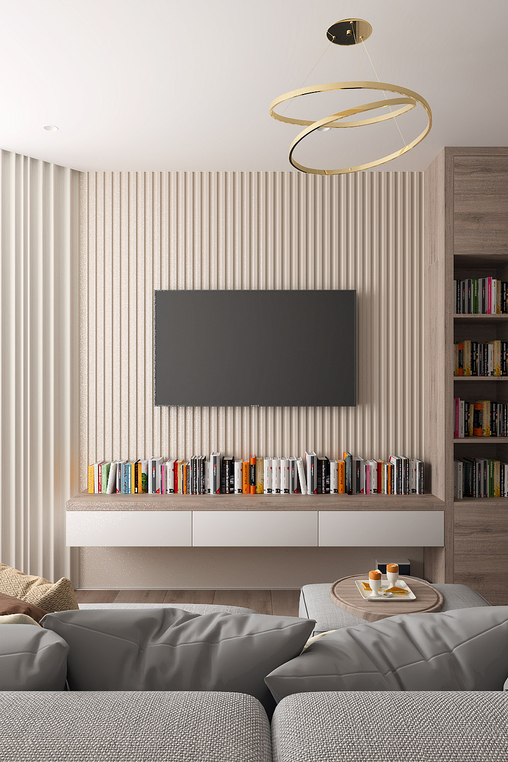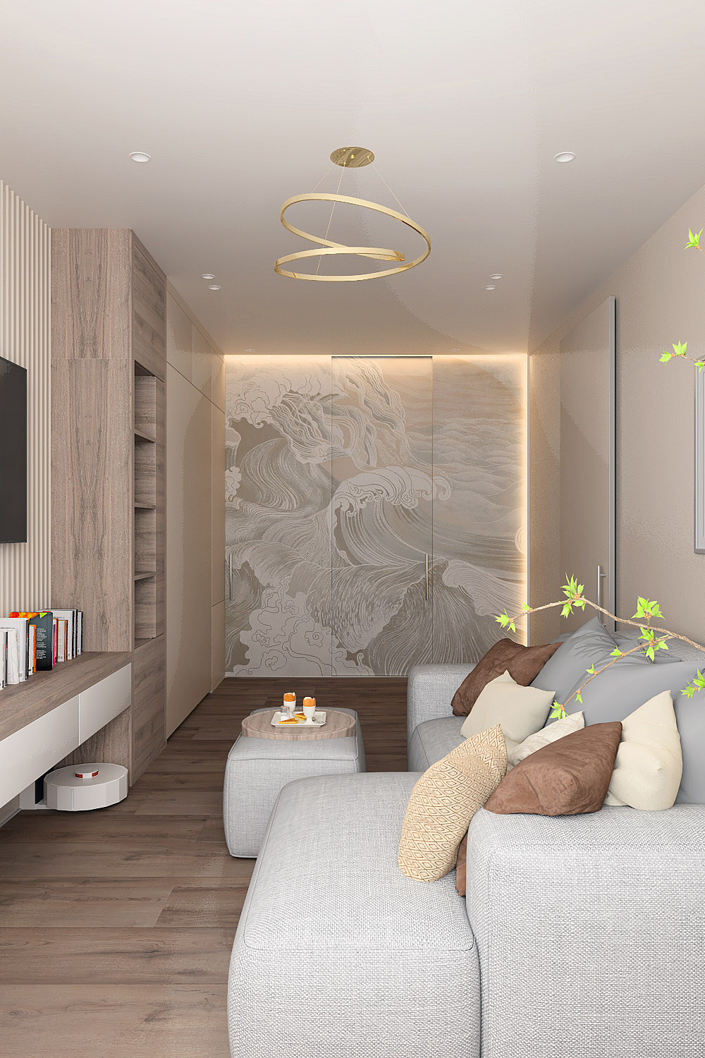 Гостиная-спальня в однокомнатной квартире в ЖК Новое Купчино, г. Санкт-Петербург. Площадь комнаты — 14,4 м². Заказчики — молодая девушка и ее кот. Пожеланиями были — спокойная квартира для отдыха после работы, откидная кровать, чтобы не загружать пространство гостиной в дневное время, а также стена с акцентными обоями, большая гардеробная для хранения повседневной и внесезонной одежды, спортинвентаря и принадлежностей для уборки.