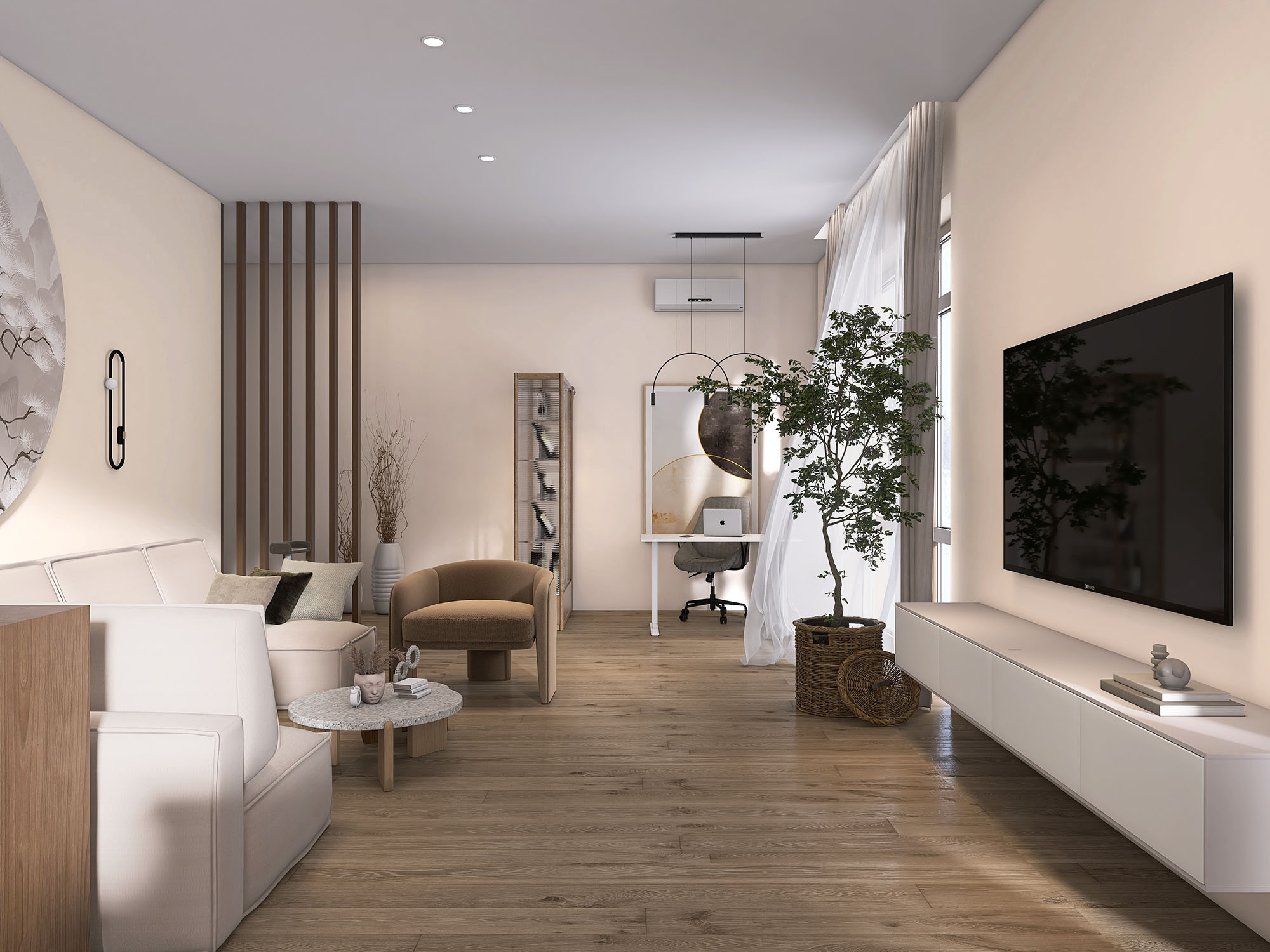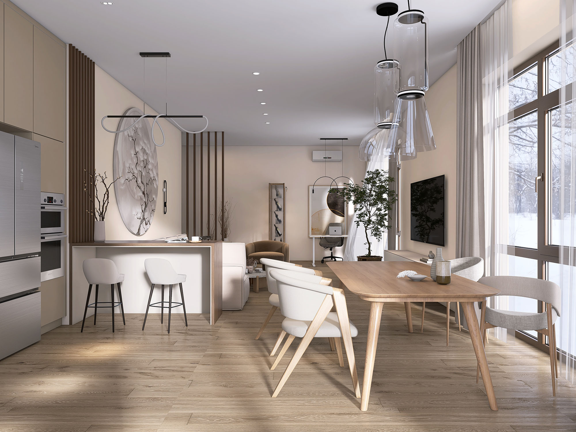 Кухня-гостиная из проекта «Дом мечты». Дом, в котором хочется жить, любить, отдыхать, получать удовольствие. И иногда работать) Это стало лейтмотивом проекта. В нем использовали картину из коллекции Busido с прекрасным природным мотивом, который был согласован заказчиками с первого раза. Он идеально подчеркнул стиль помещения и передал атмосферу созерцания и умиротворения.